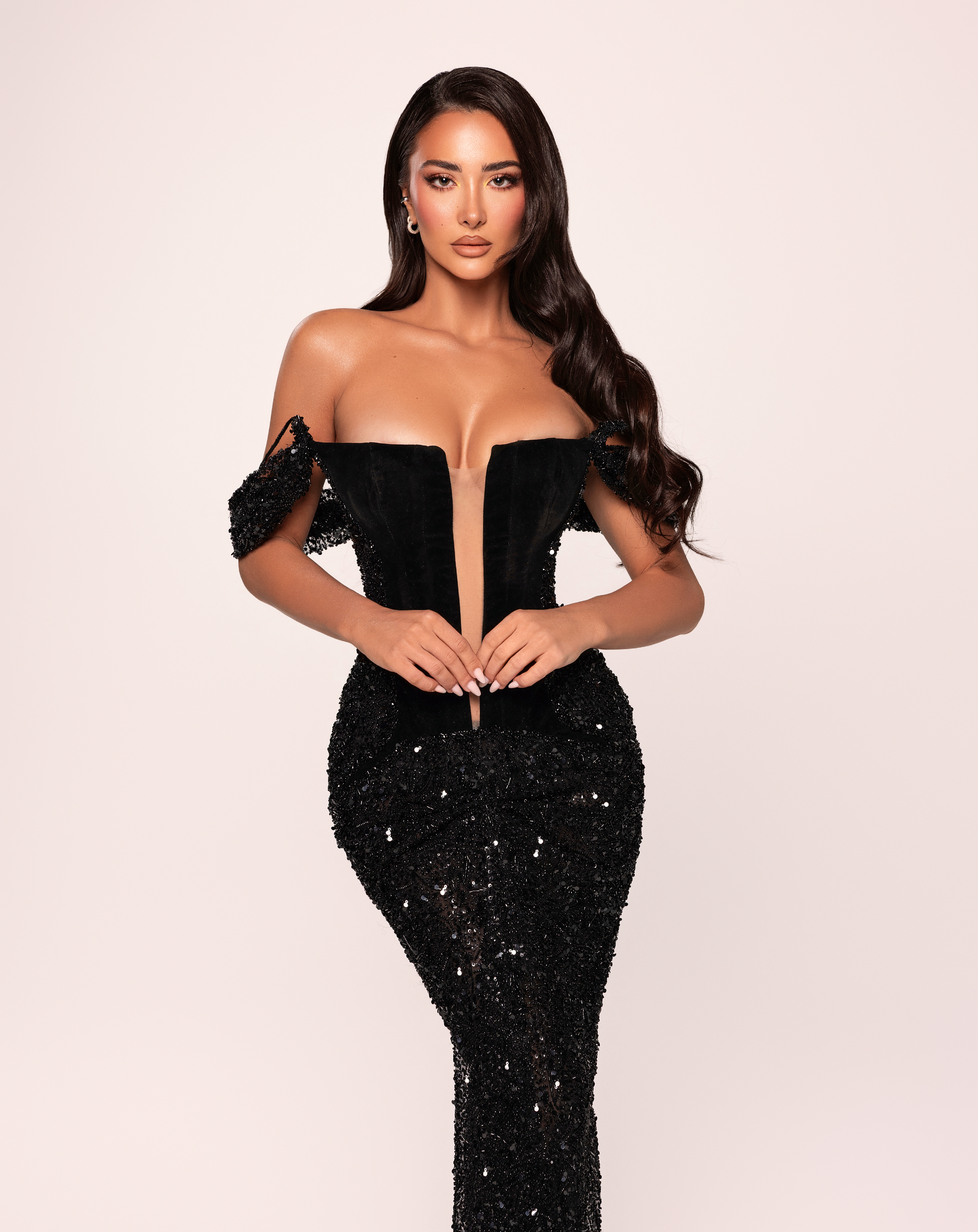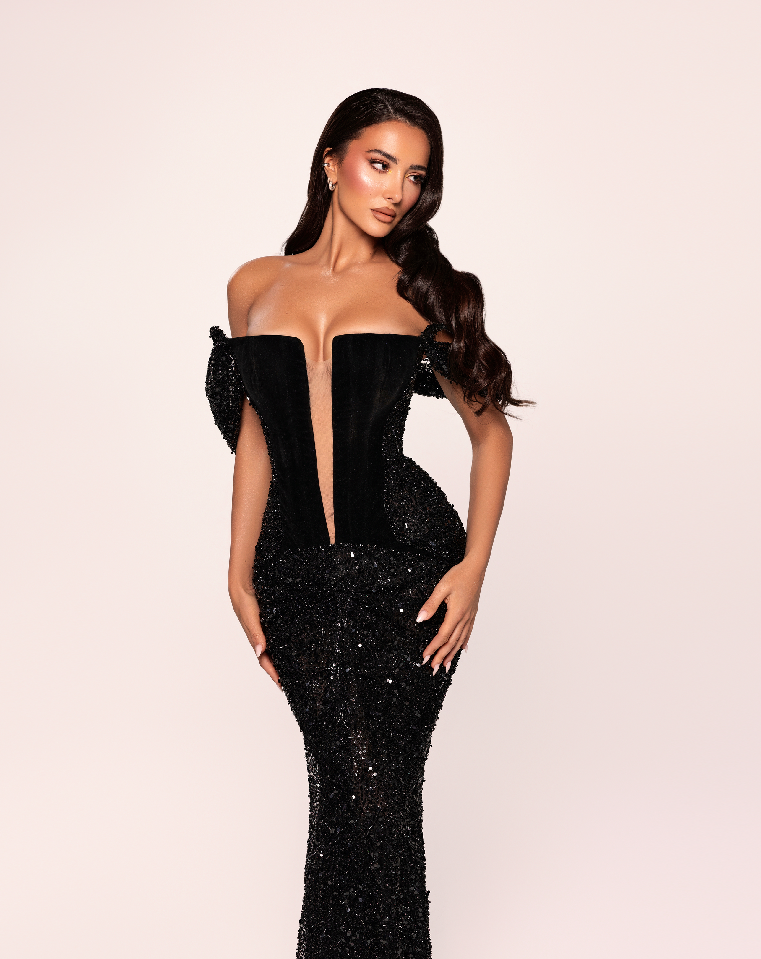 Figure-enhancing silhouette that flows into a sleek, floor-length skirt