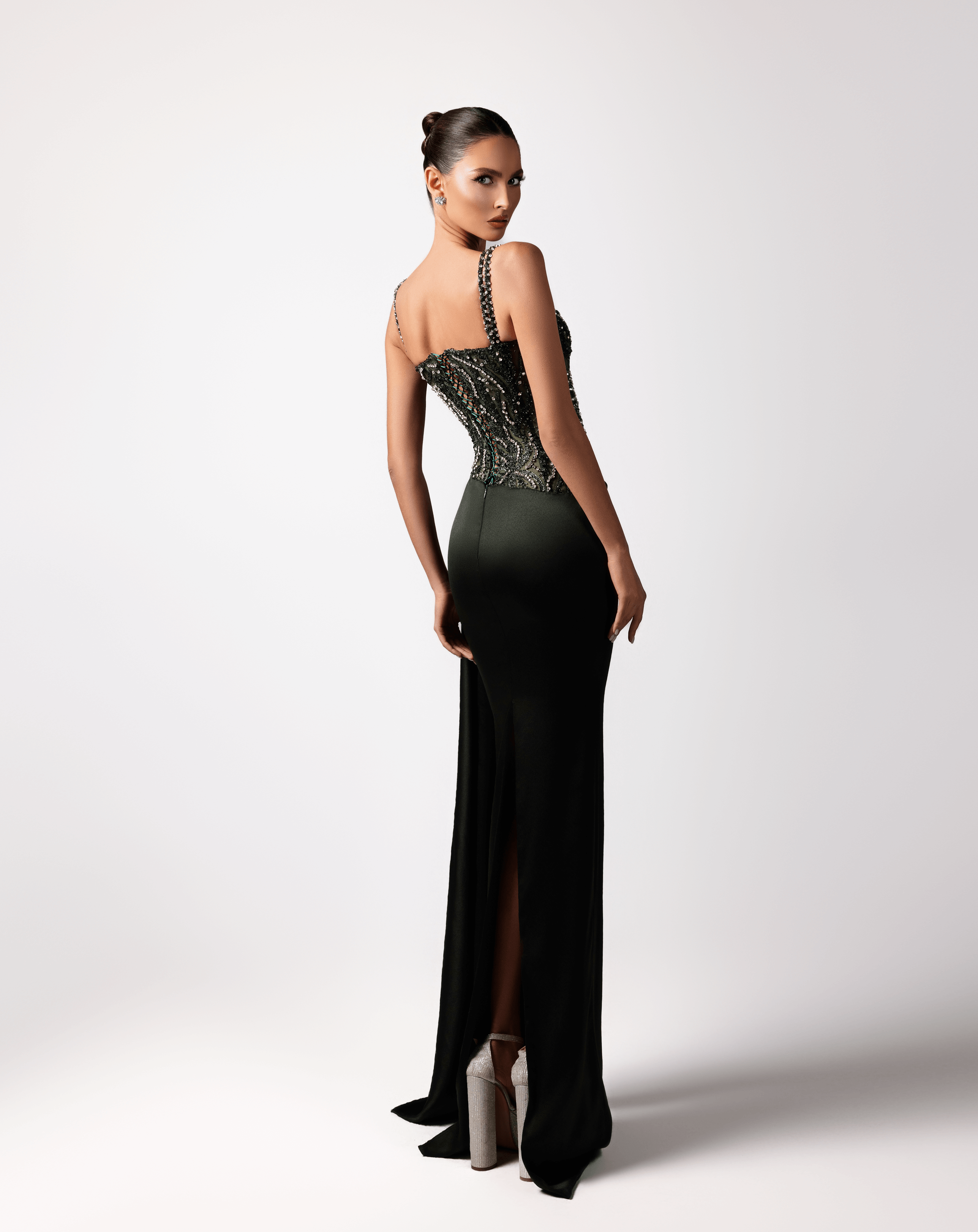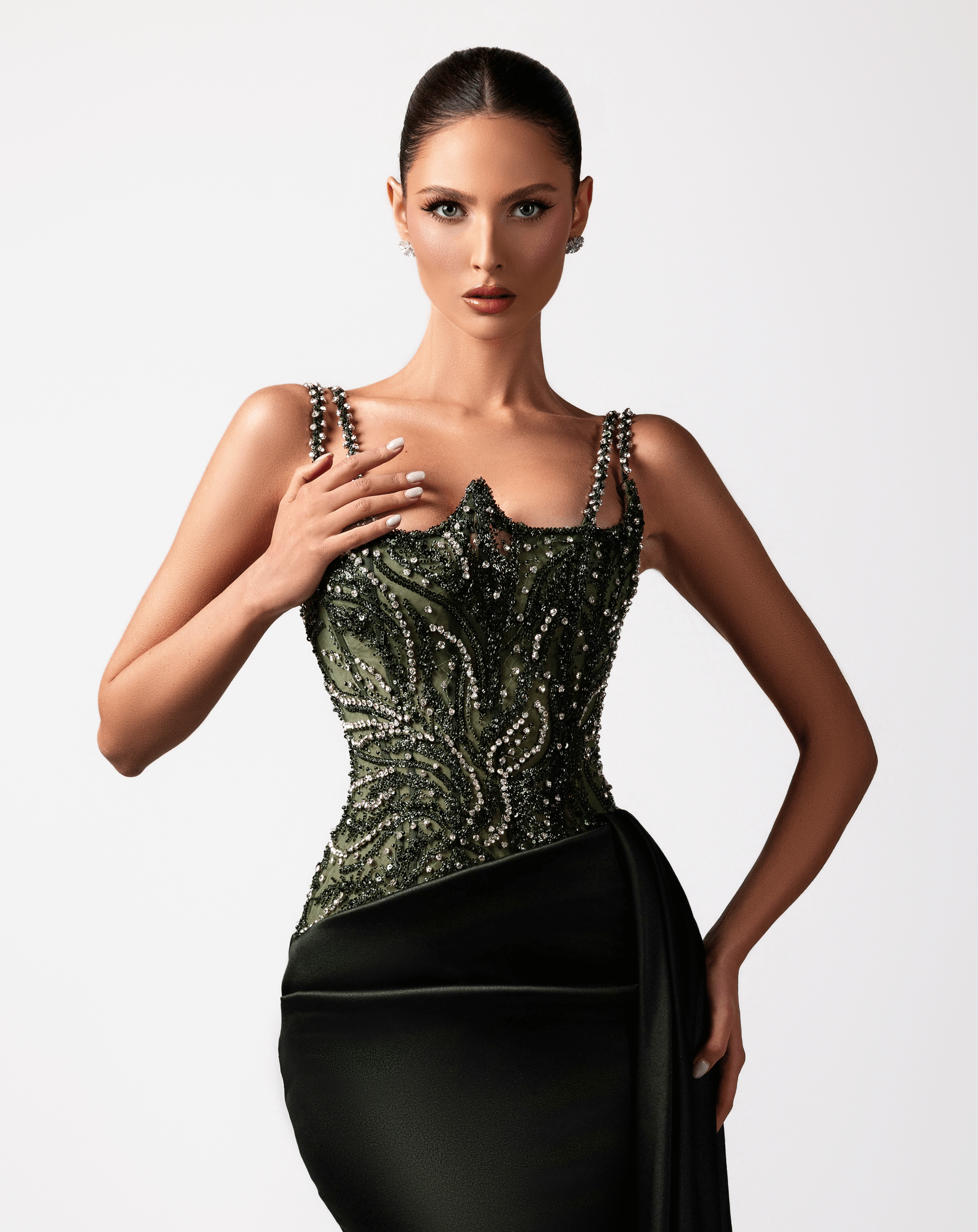 - Intricately beaded corset bodice with silver and green crystal embellishments