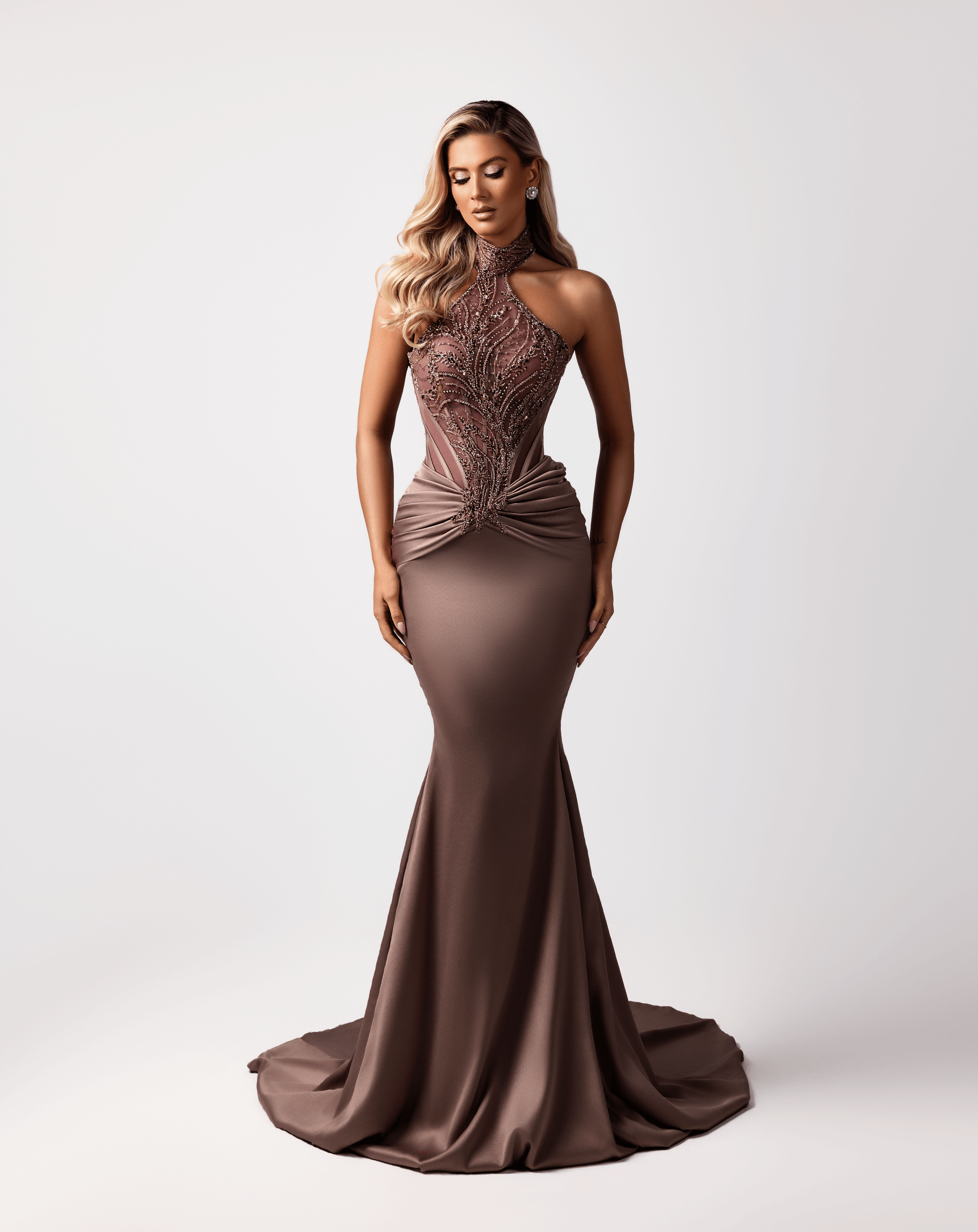 - Intricately beaded halter bodice with bronze and gold crystal embellishments