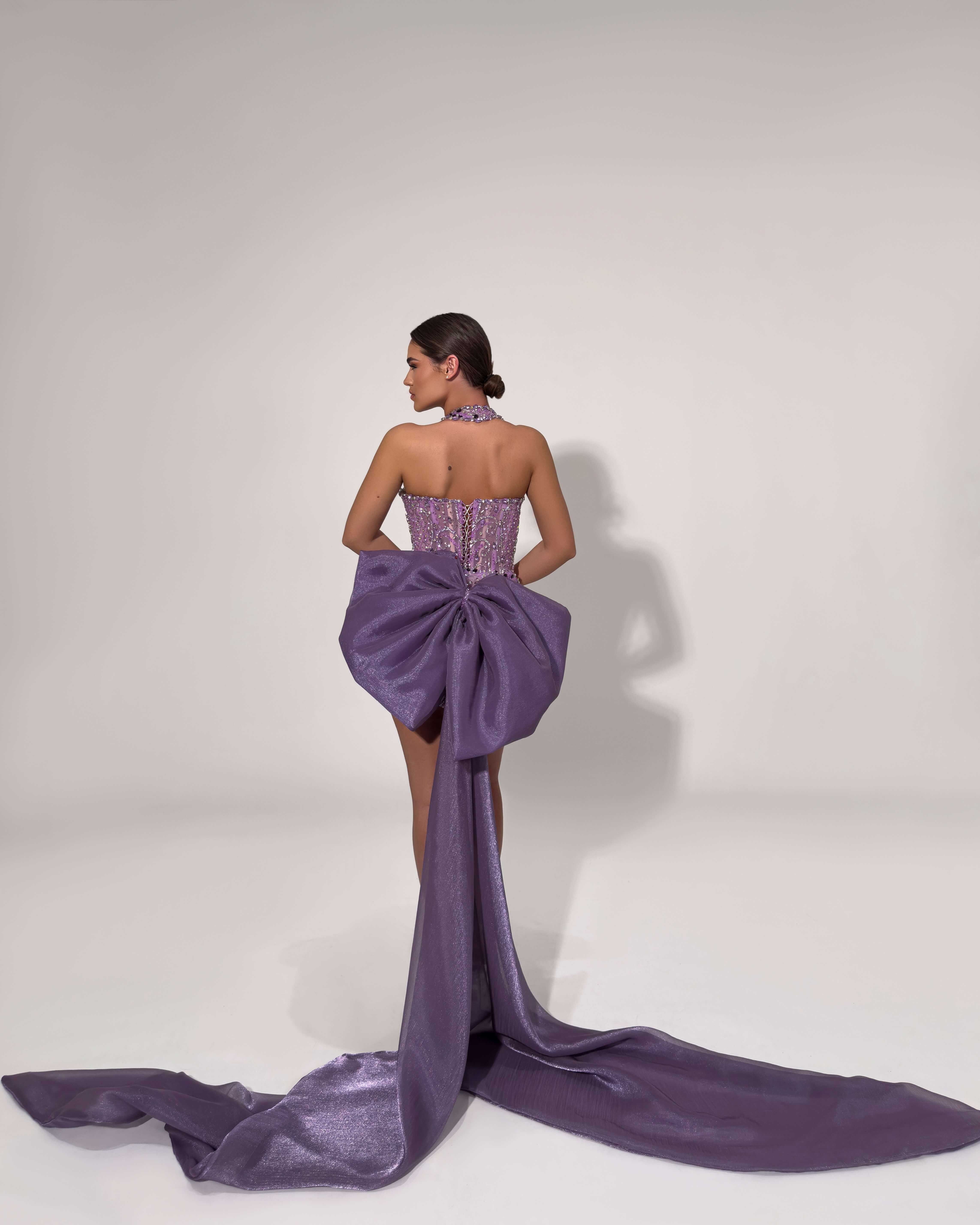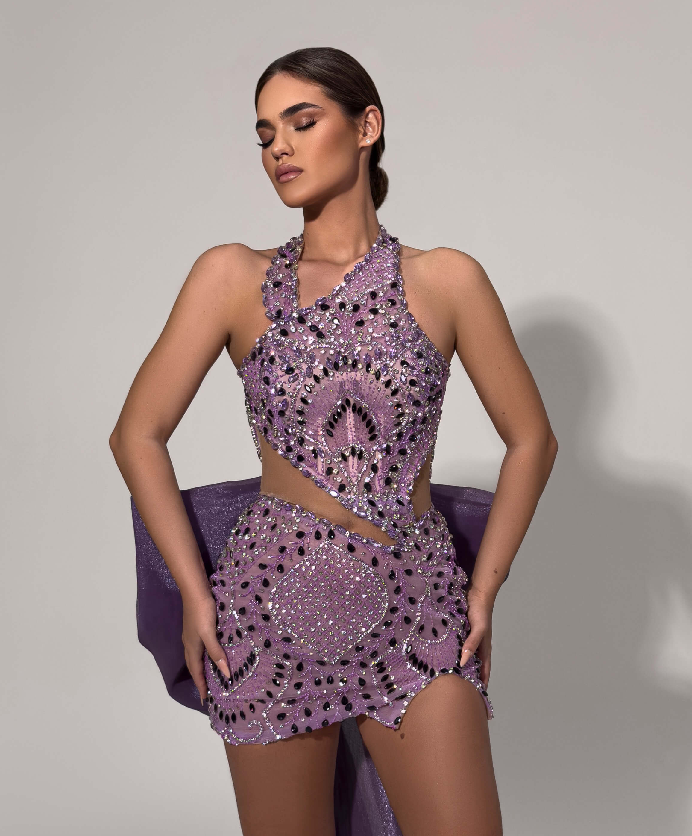This lilac mini dress features bold crystal embellishments, a halter neckline, and cutout detailing at the waist. Finished with a dramatic detachable train that adds a touch of couture flair.