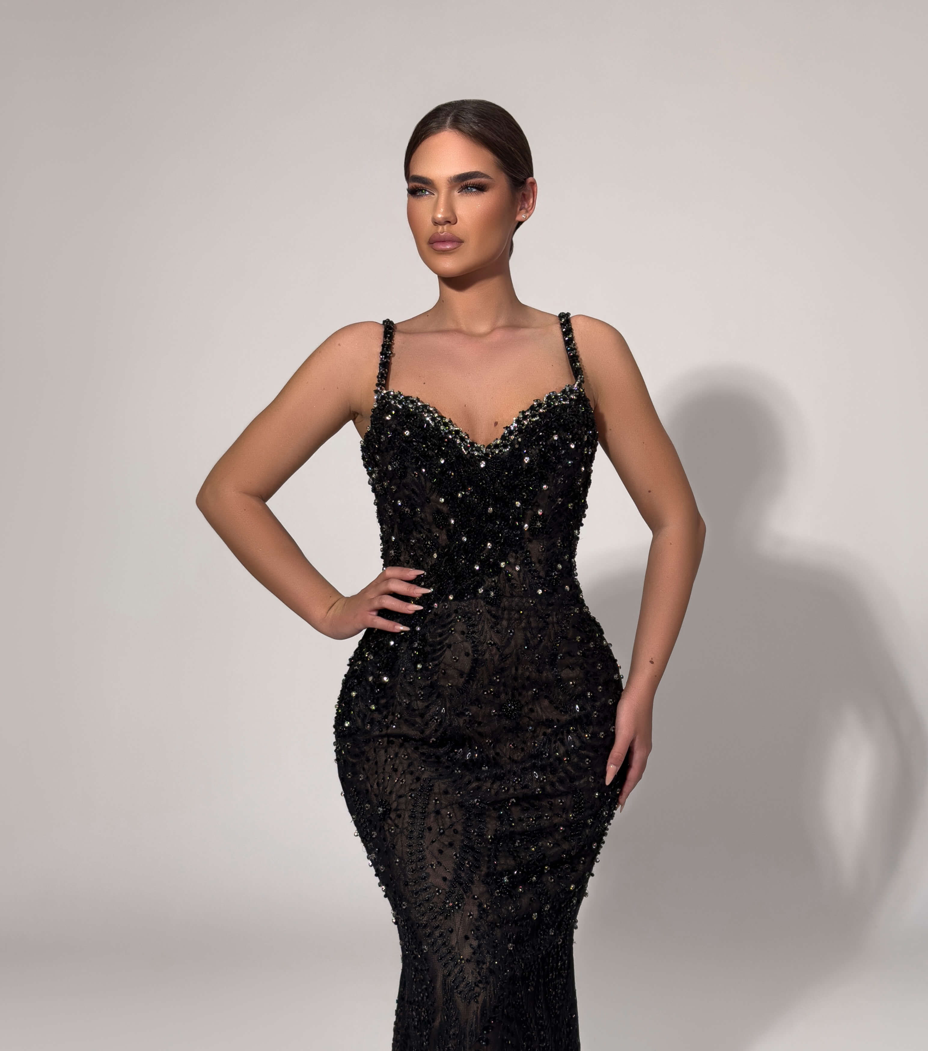 A dramatic black evening gown featuring all-over beaded embellishments on sheer illusion fabric with a structured sweetheart bodice and delicate straps. The figure-hugging mermaid silhouette creates a striking hourglass shape, flowing into a floor-length hem with subtle train for timeless elegance.