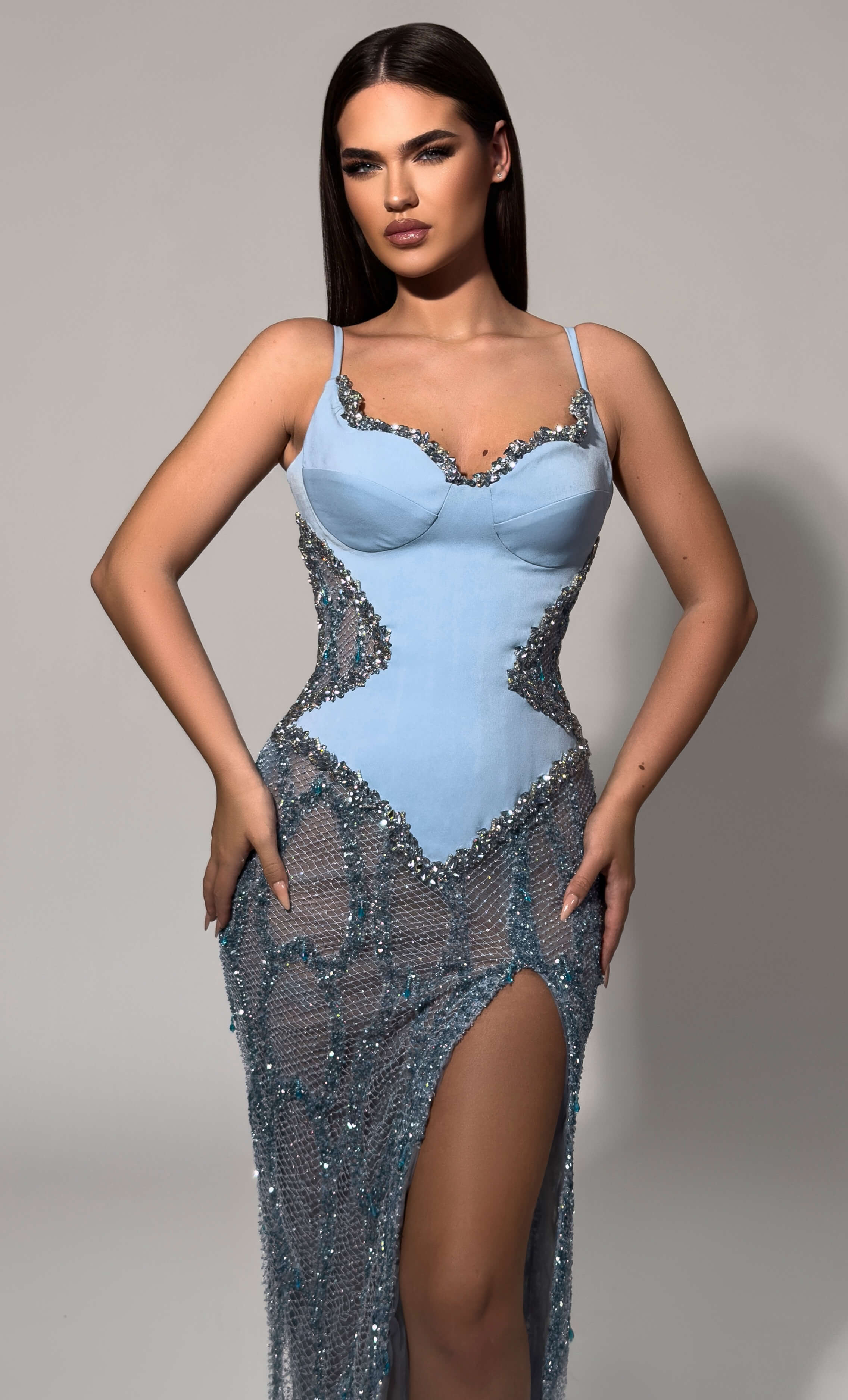 Elegant corset top with crystal embellishments creating a sculpted silhouette.