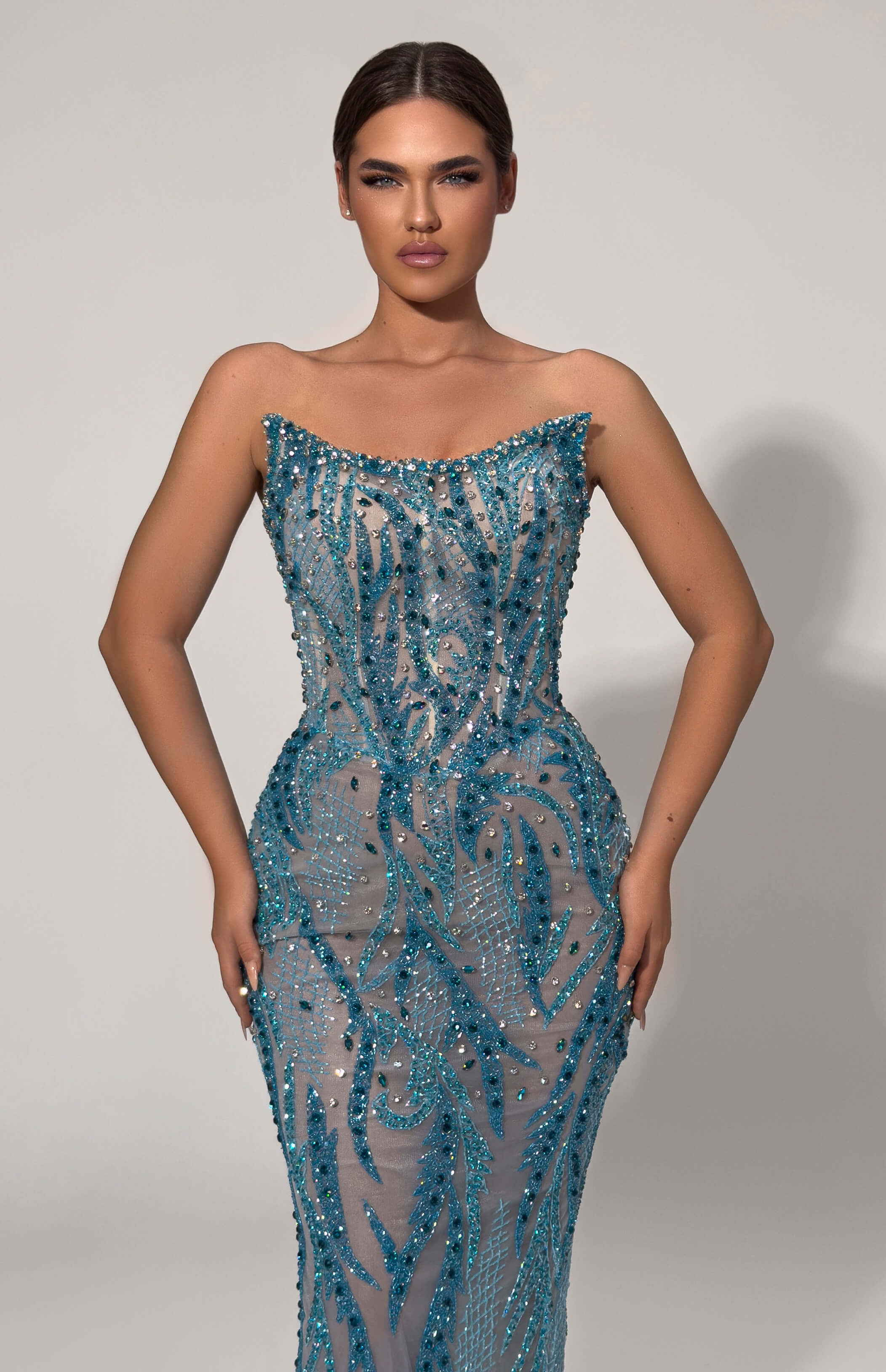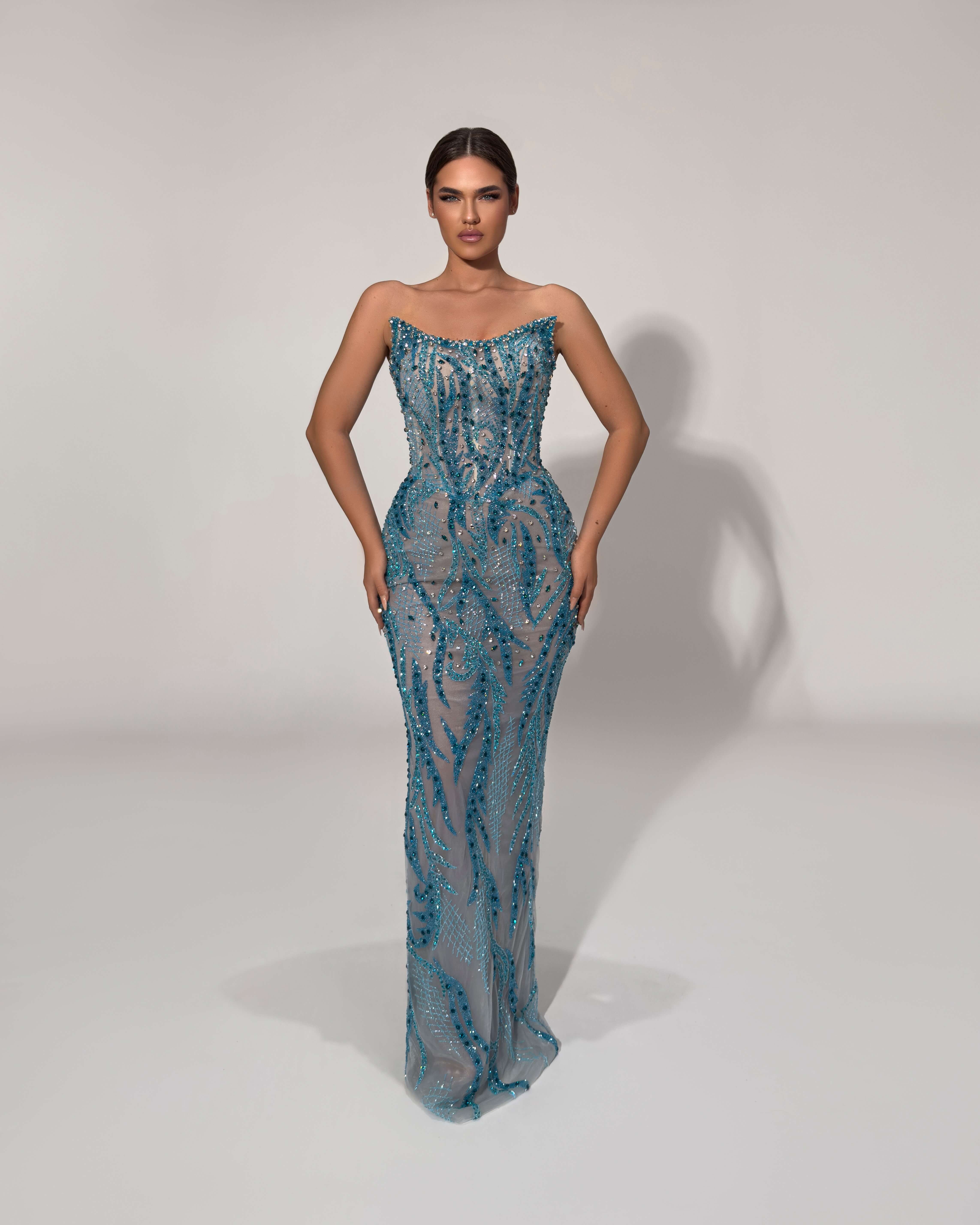 This strapless gown features an elegant fitted silhouette with shimmering turquoise beadwork that creates a graceful, wave-like pattern. Perfect for evening occasions with a refined sparkle.