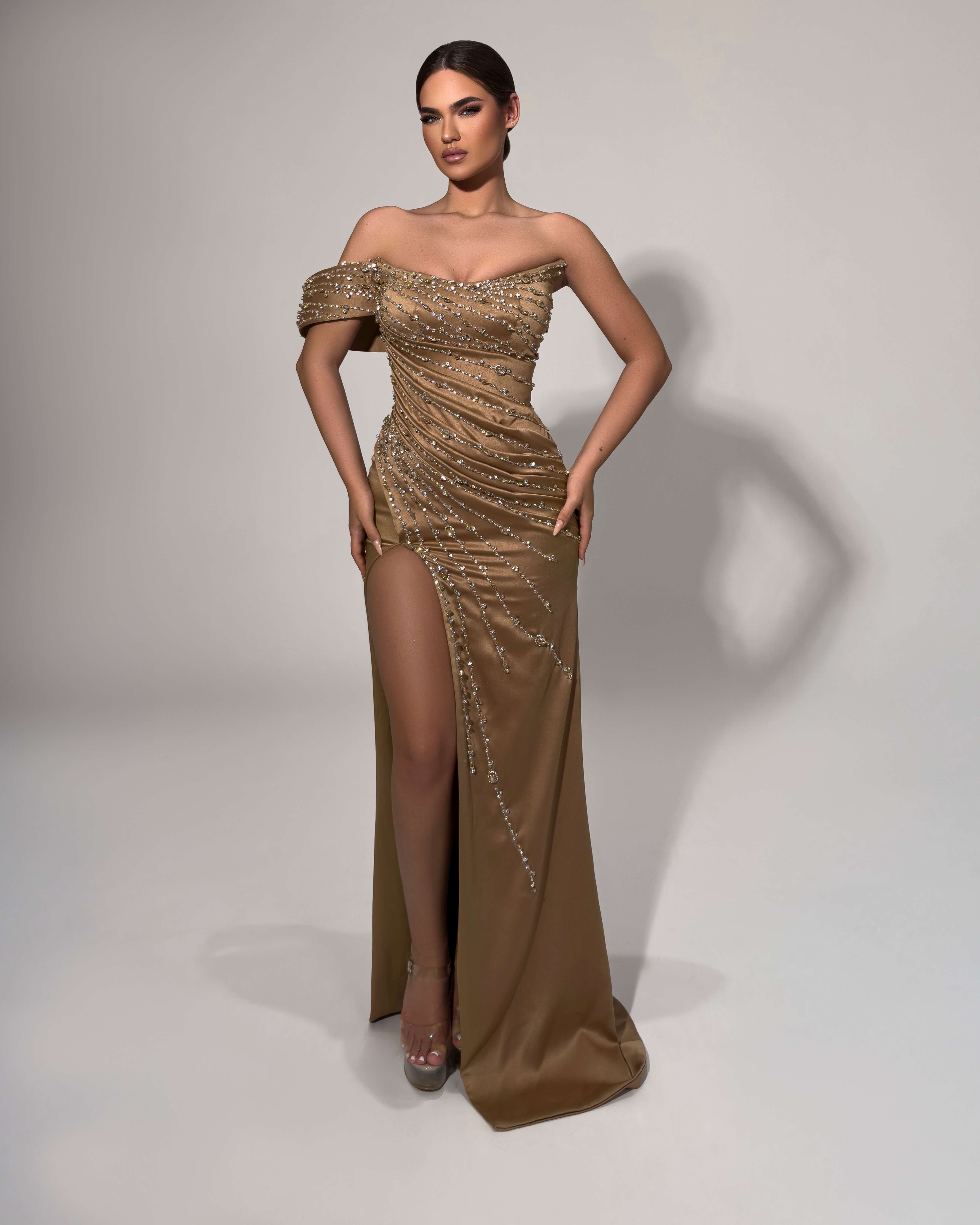 An elegant bronze gown featuring an off-shoulder design with intricate beaded embellishments cascading across the draped bodice and down the fitted silhouette. The figure-hugging design showcases a dramatic high slit and flows to a floor-length hem, combining sophisticated draping with sparkling embellishments for a refined evening look.