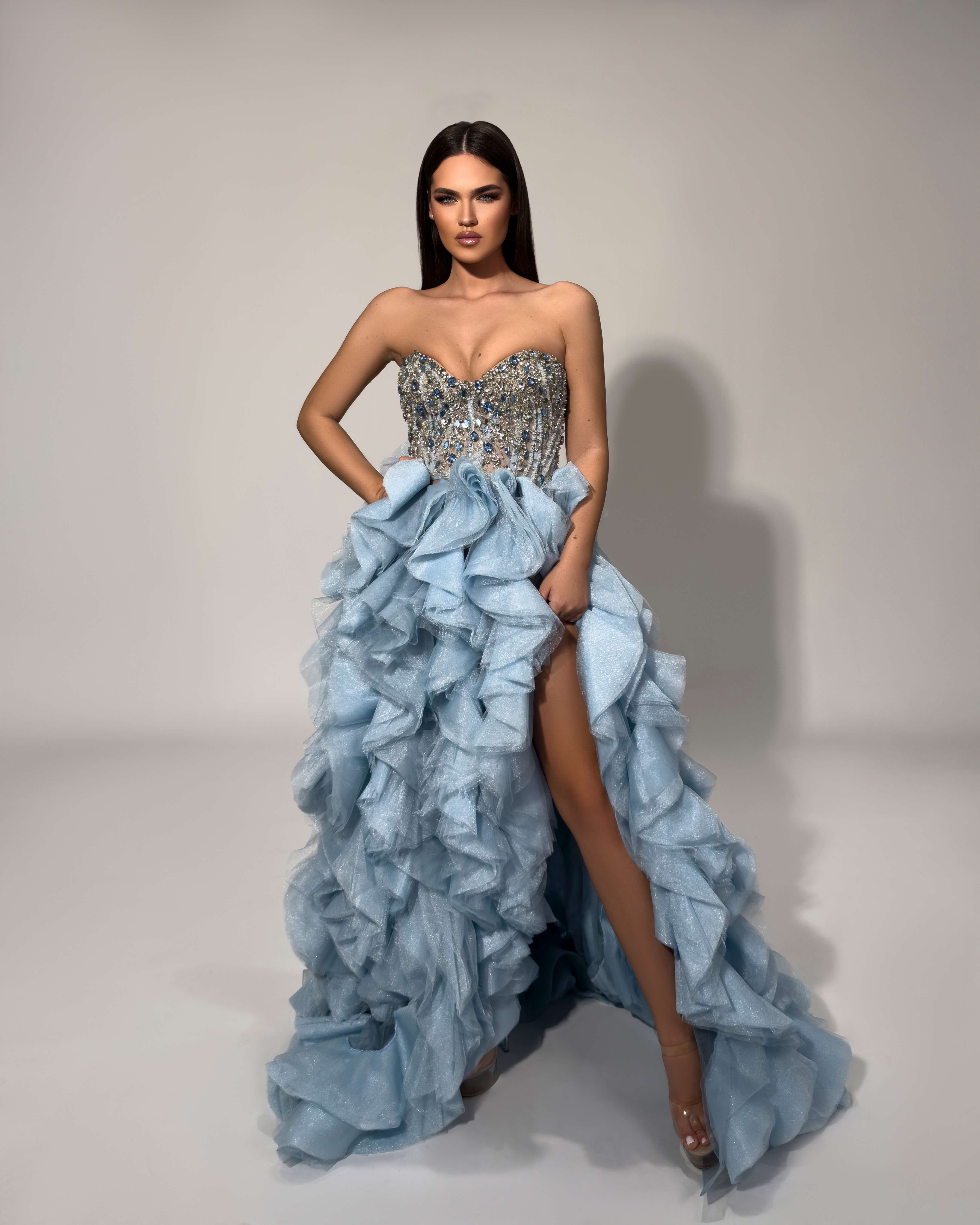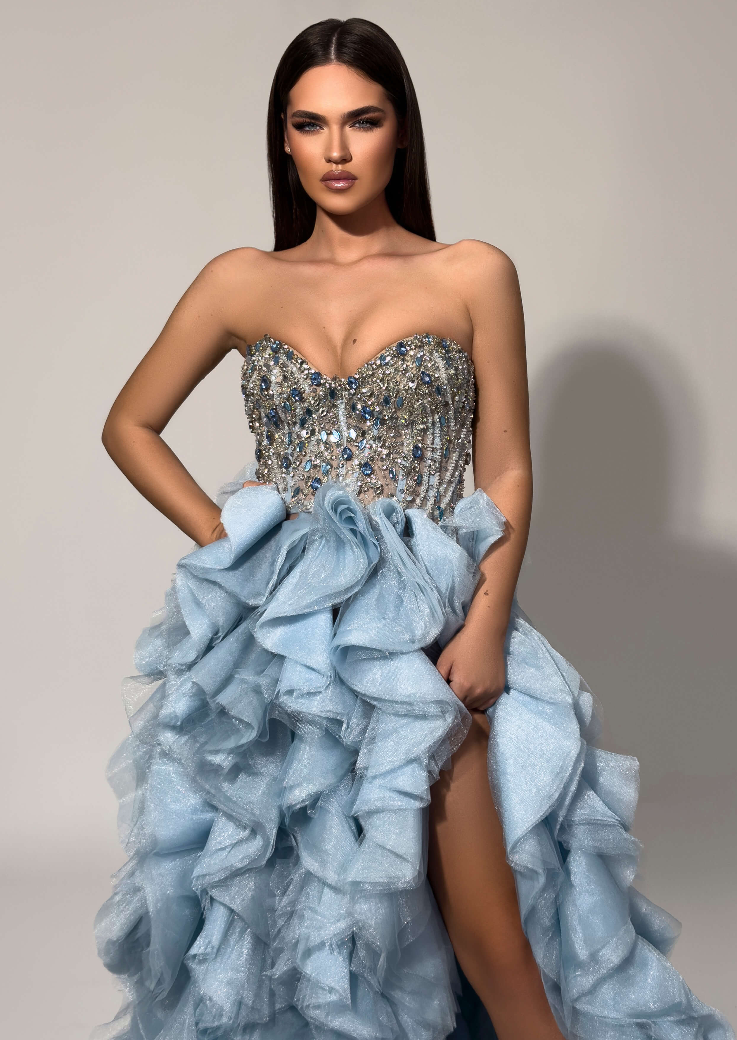 Make an unforgettable statement in this breathtaking powder blue ball gown featuring a heavily embellished crystal bodice with sweetheart neckline and cascading layers of dramatic ruffled tulle. The sheer corset is adorned with shimmering beadwork and crystals, while voluminous ruffles create a couture silhouette. A true showpiece for the woman who demands to be the center of attention.