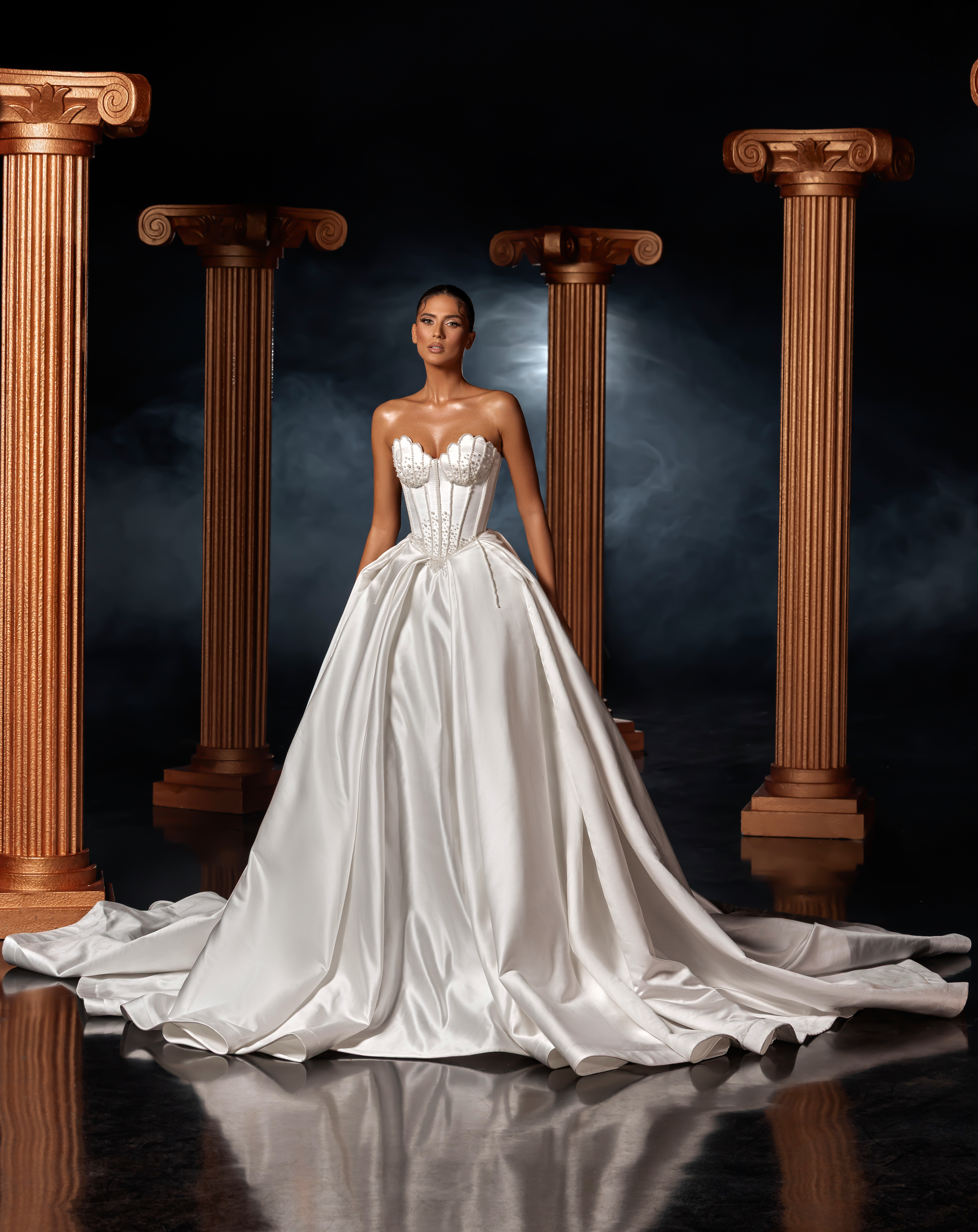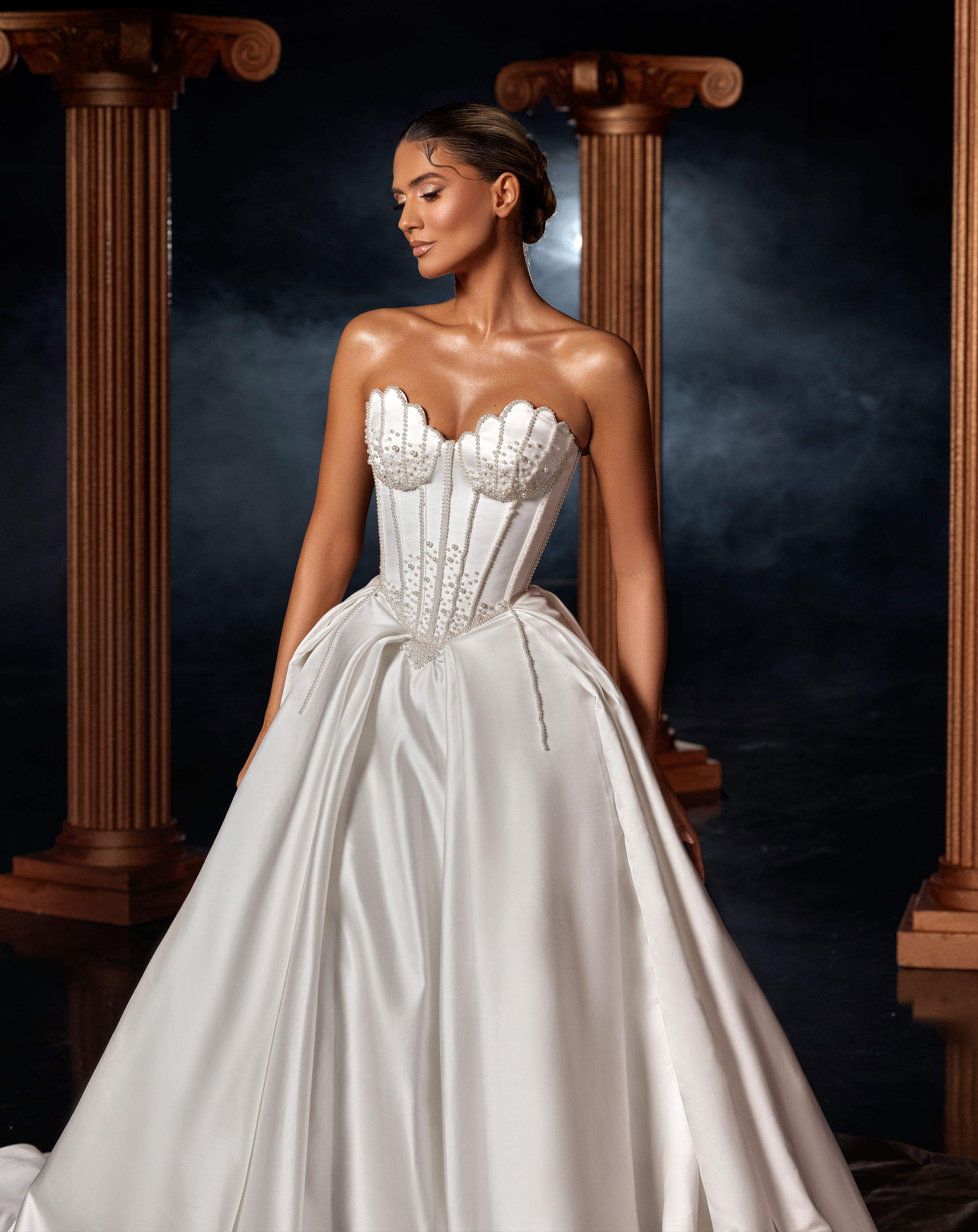 - Structured bodice emphasizing the waistline with boned precision