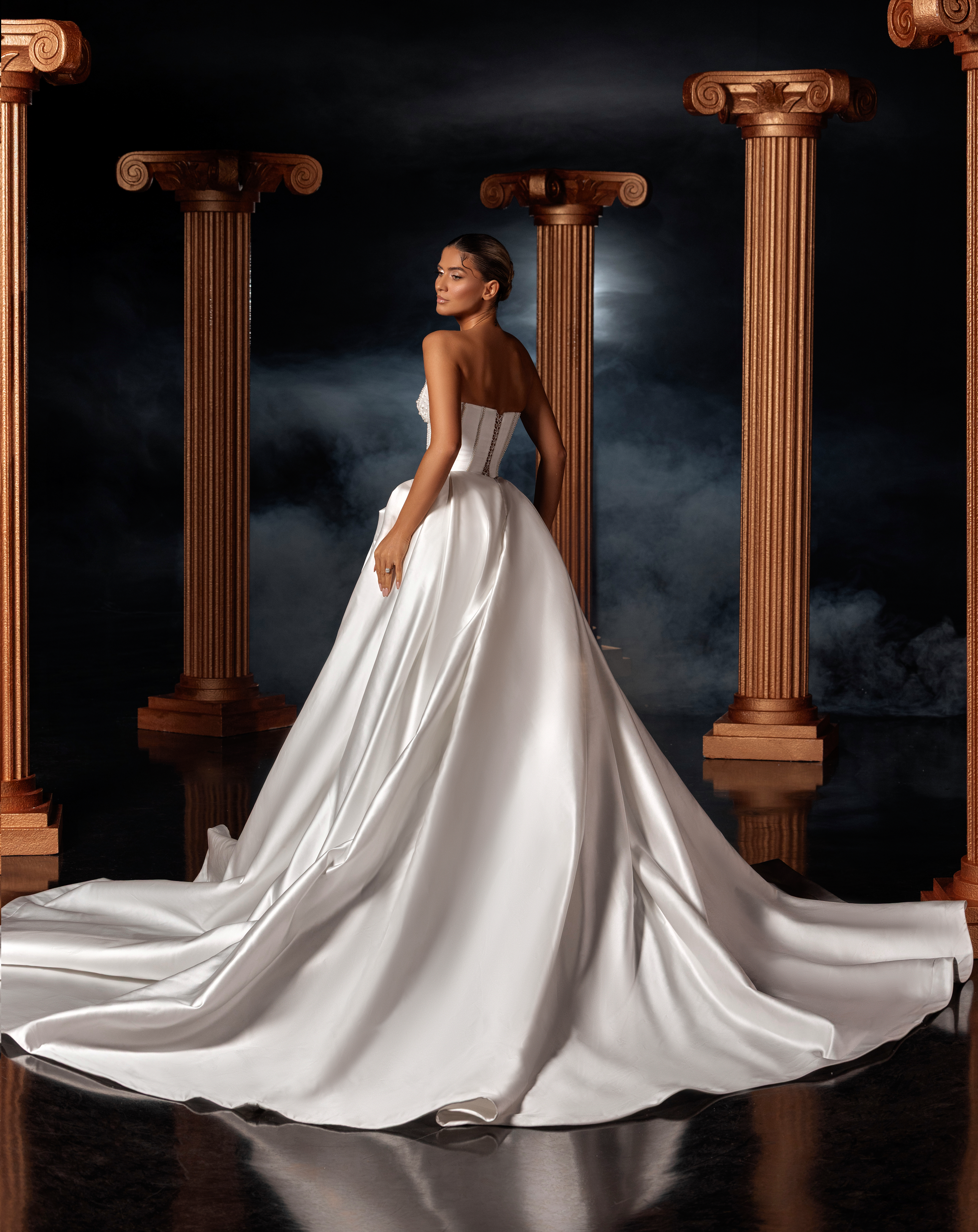 - Full satin ball gown skirt flowing into a majestic train for a royal finish