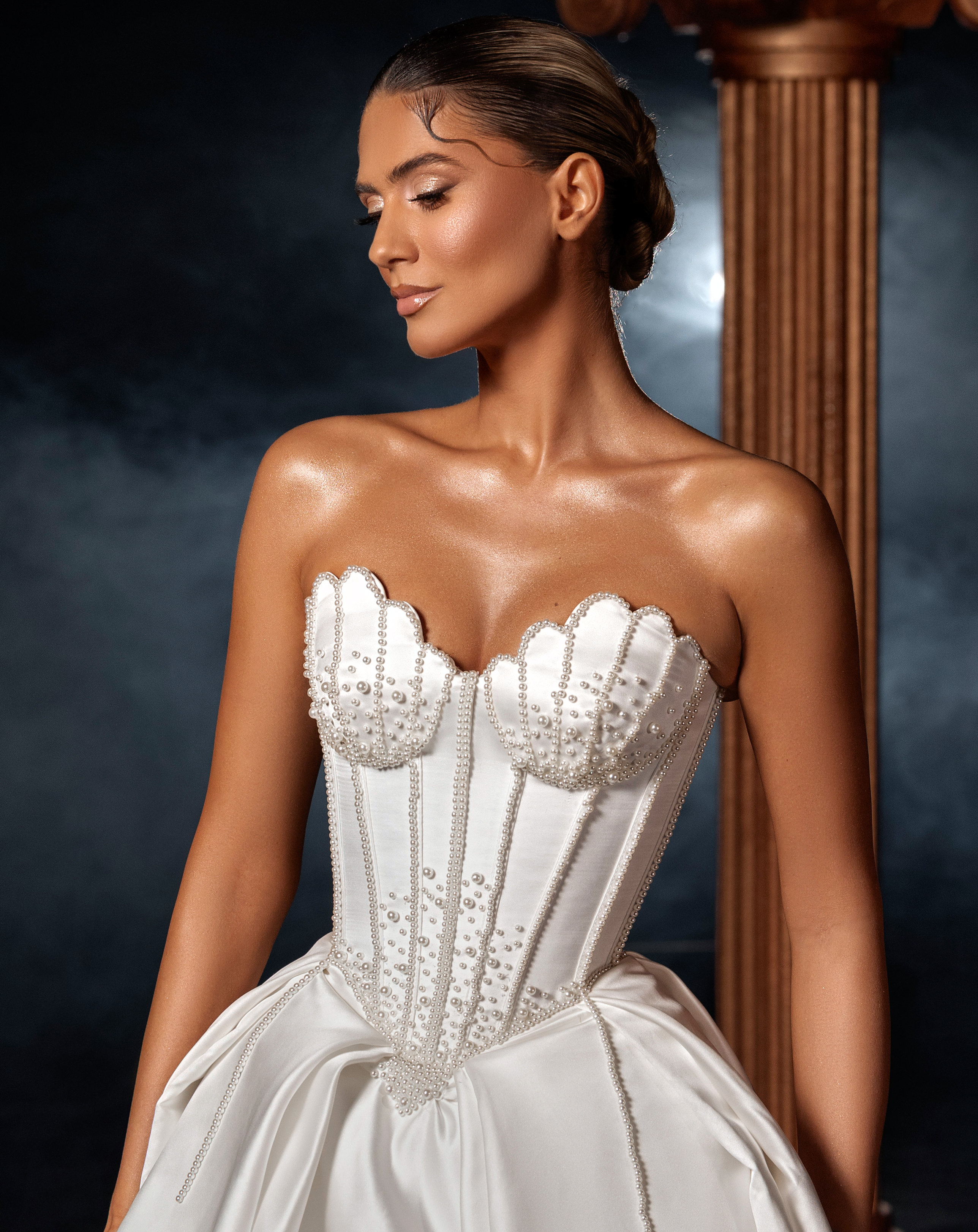 - Strapless corset neckline with sculpted satin cups and embroidered detailing