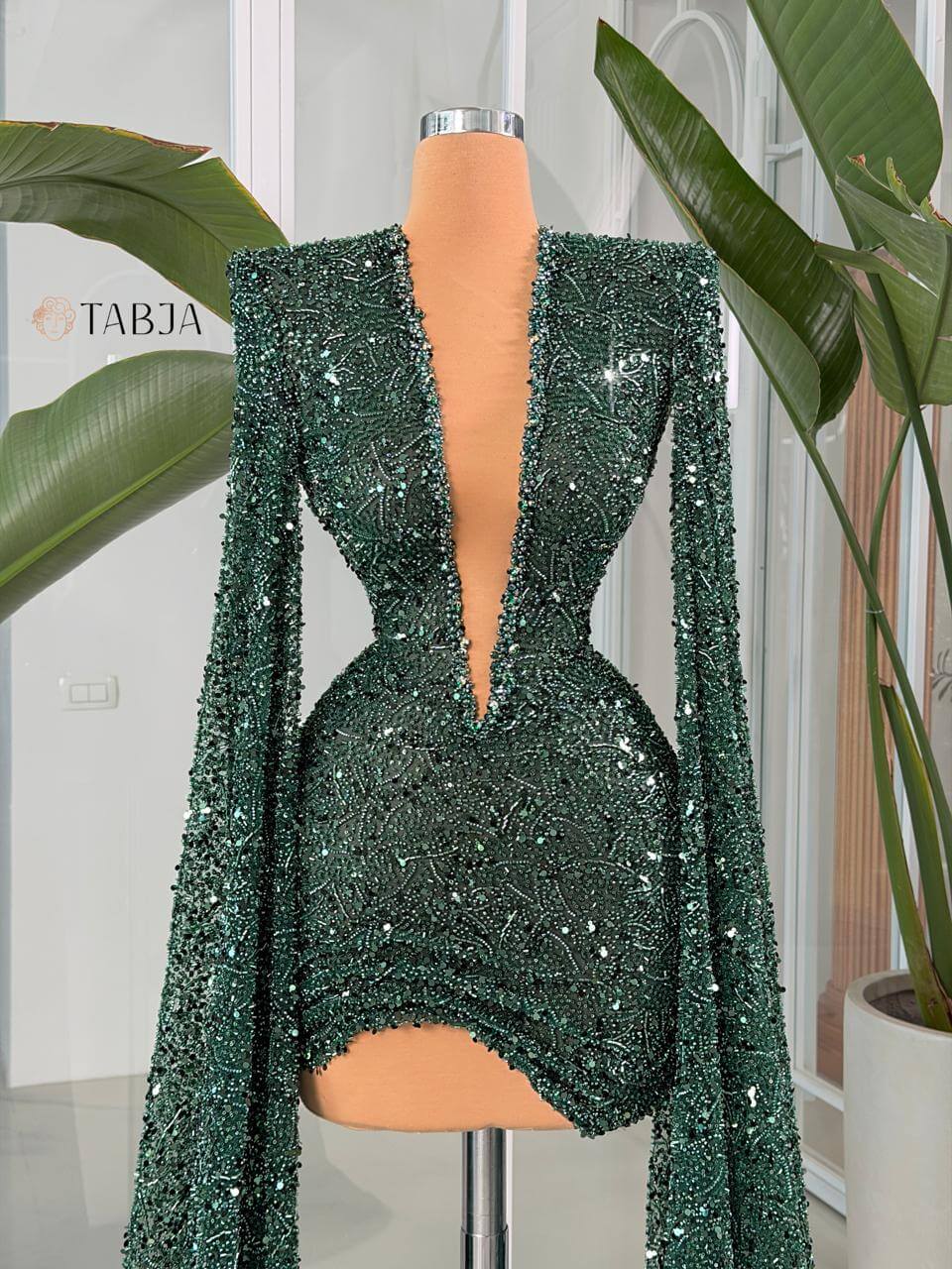 Make a show-stopping entrance in this breathtaking emerald sequin gown. Featuring a daring plunge neckline, dramatic floor-length bell sleeves, and allover shimmering sequin embellishment, this statement piece is designed for the woman who commands attention.
