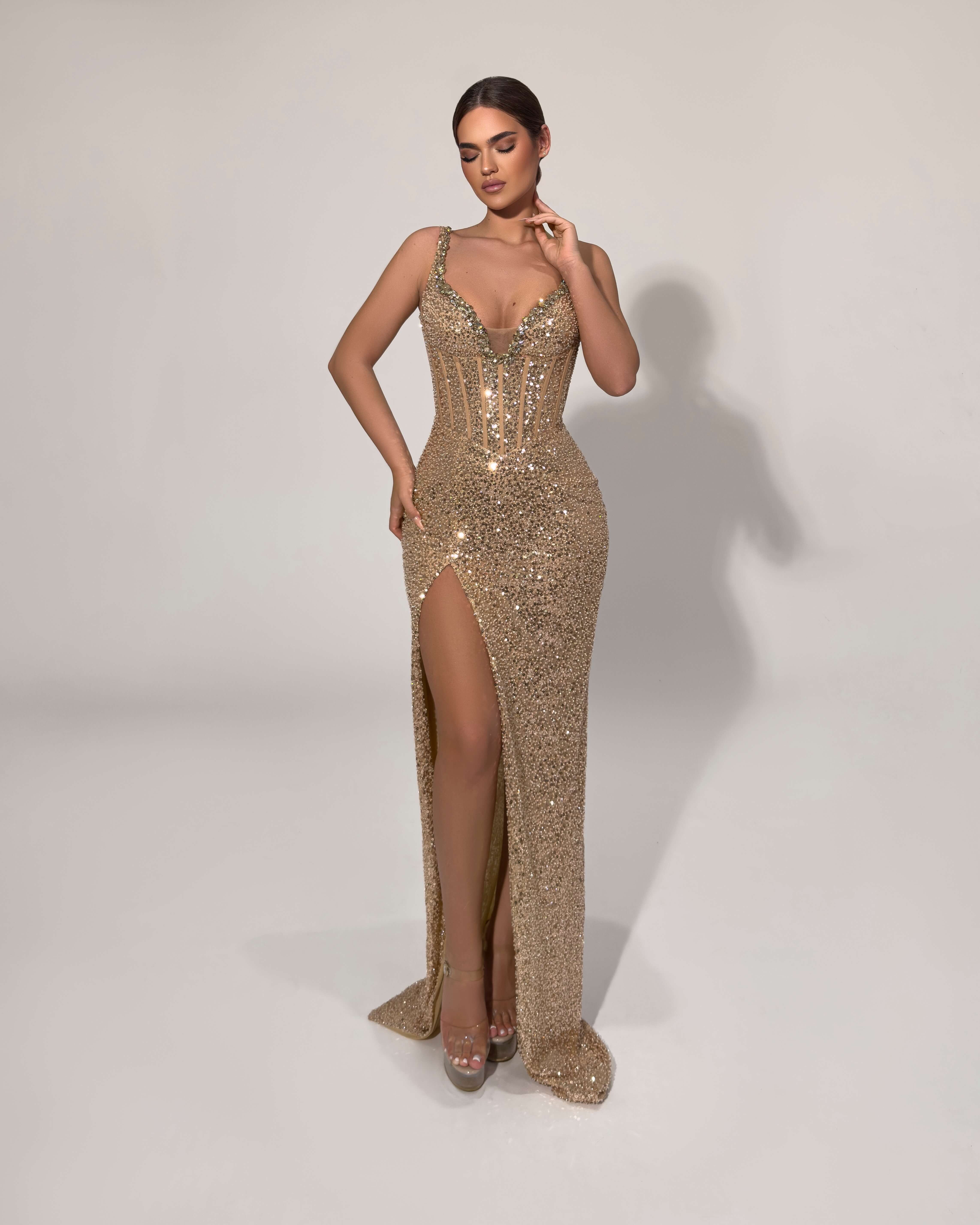 This sparkling gold gown features a deep neckline with a structured bodice and a high slit for a touch of glamour. Fully adorned with sequins, it catches the light beautifully at every angle.