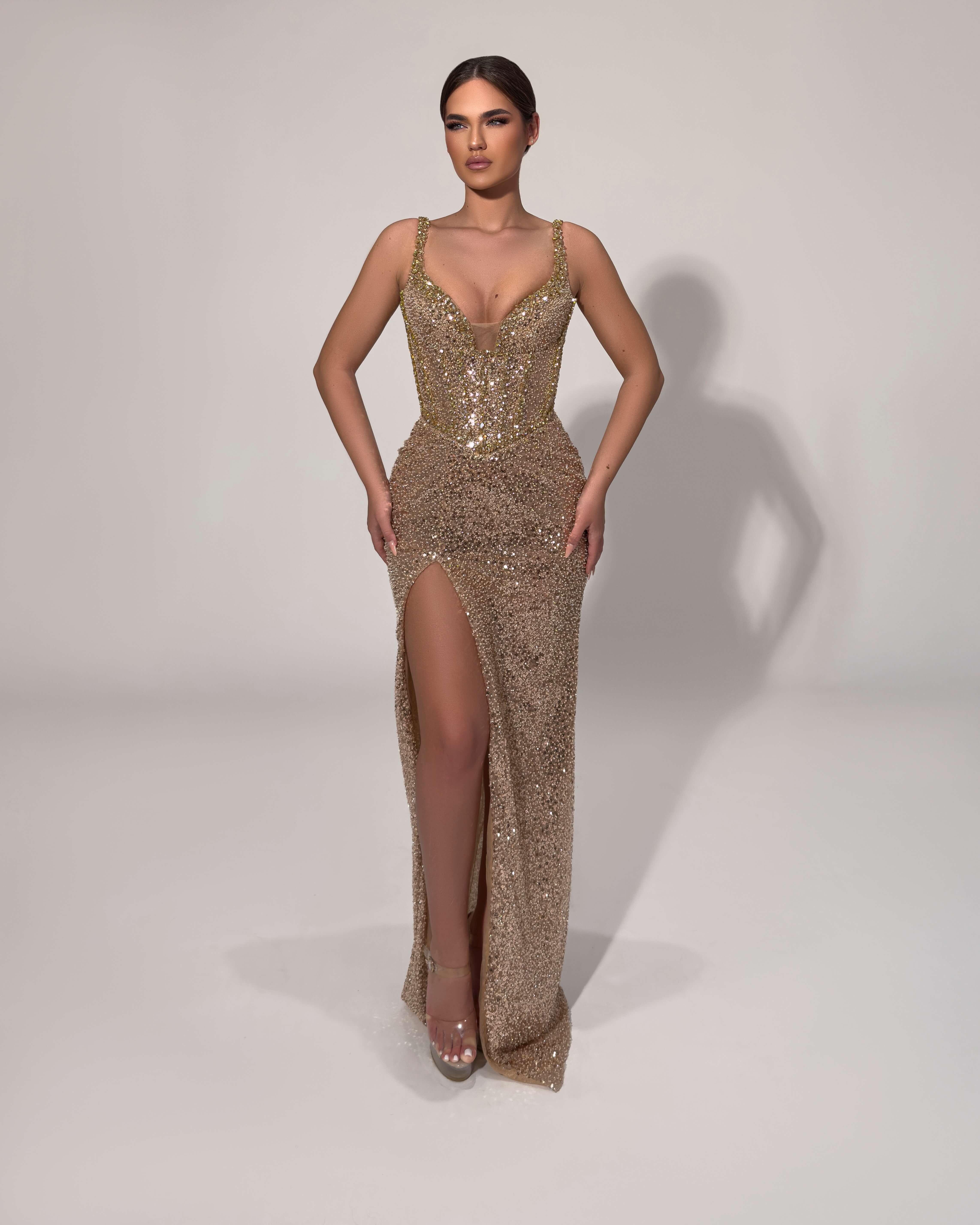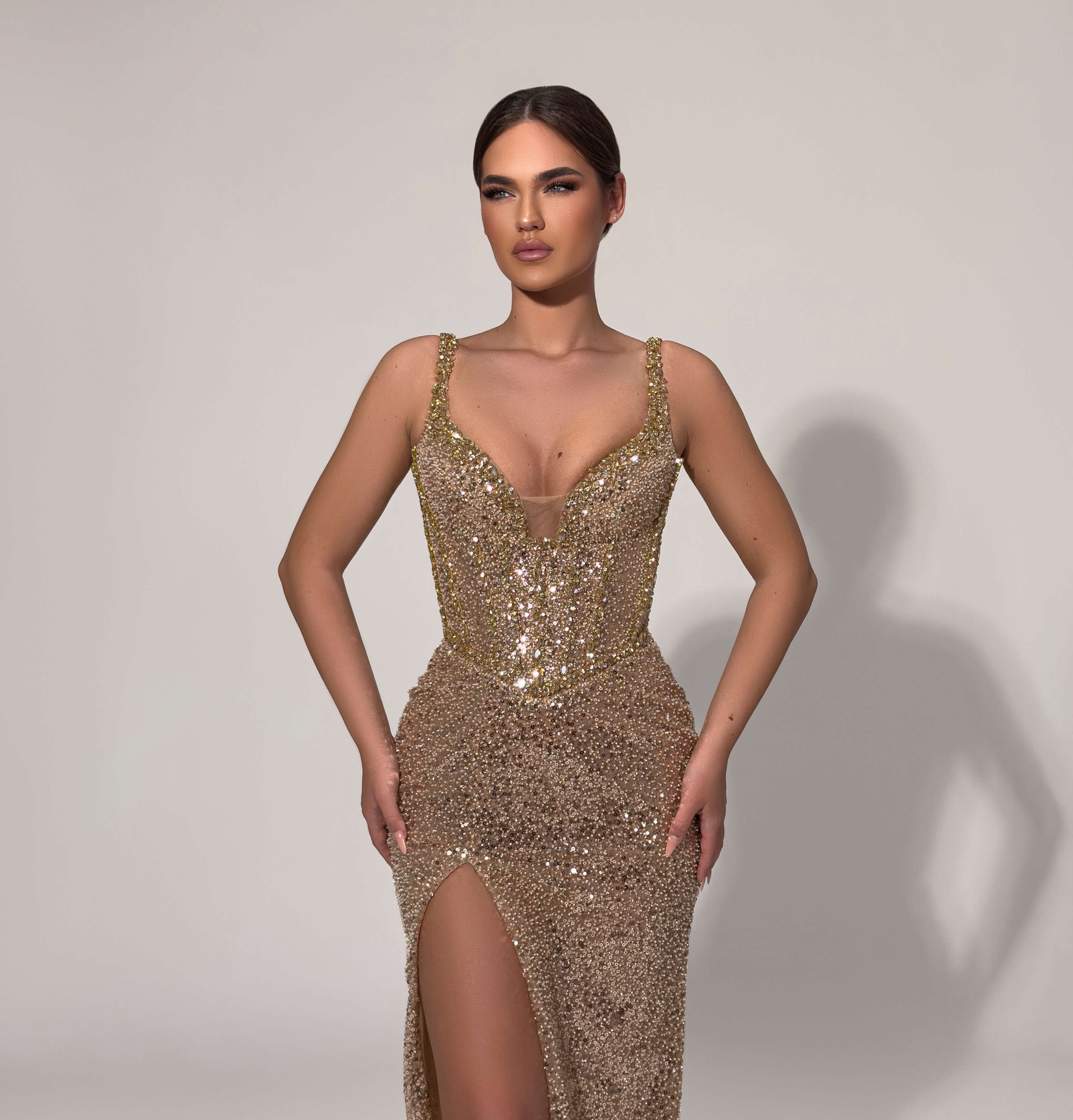 This sparkling gold gown features a deep neckline with a structured bodice and a high slit for a touch of glamour. Fully adorned with sequins, it catches the light beautifully at every angle.