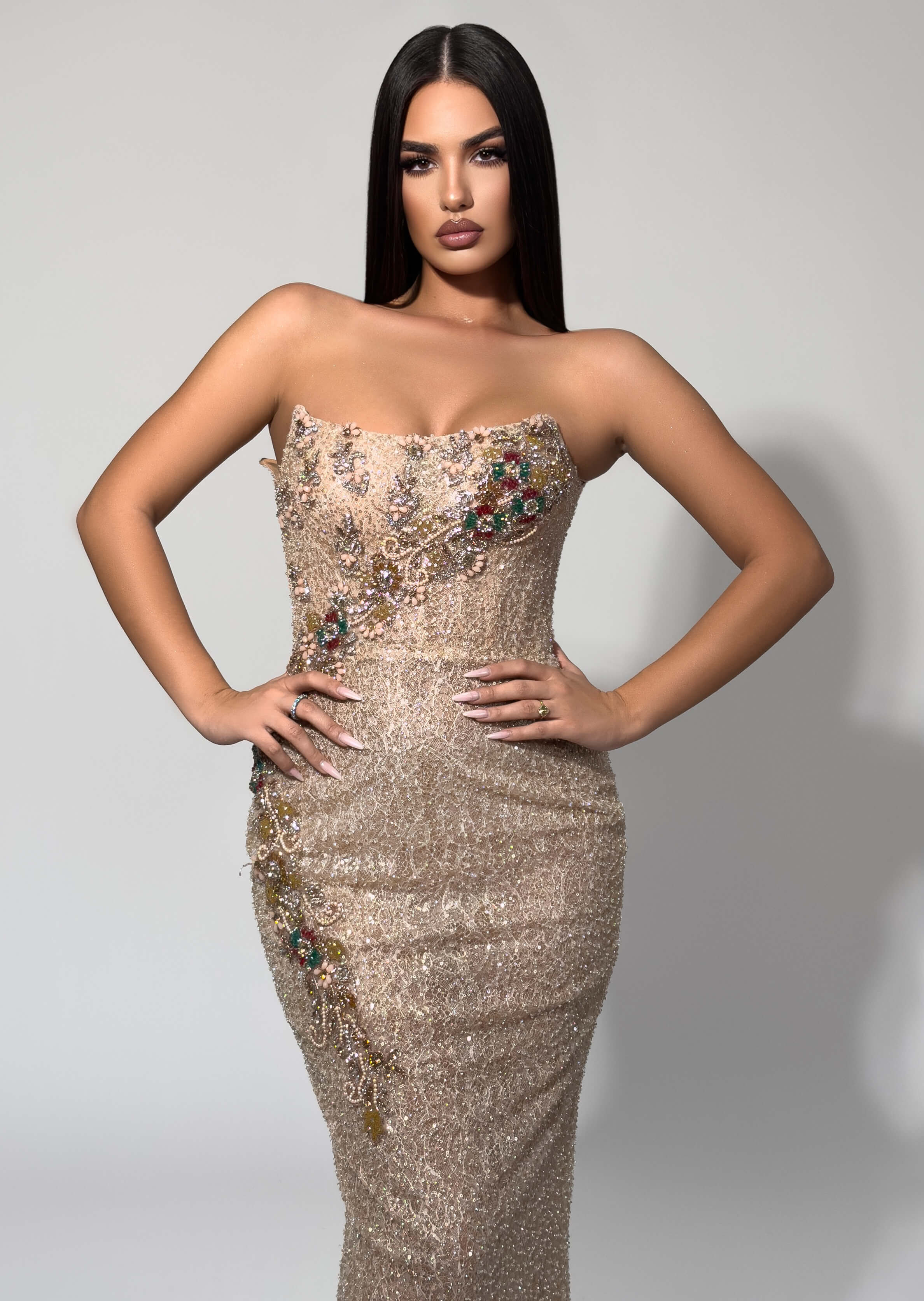 Shine in pure elegance with this stunning gold beaded gown featuring a strapless sweetheart neckline and intricate embellishments throughout. The plunging illusion panel creates a captivating focal point, while the structured bodice with ornate beaded appliqués flatters the figure beautifully. All-over crystal and bead detailing creates a shimmering effect from every angle, and the figure-hugging mermaid silhouette flows into an elegant train. Perfect for galas, award ceremonies, and red carpet events where timeless glamour meets show-stopping luxury.