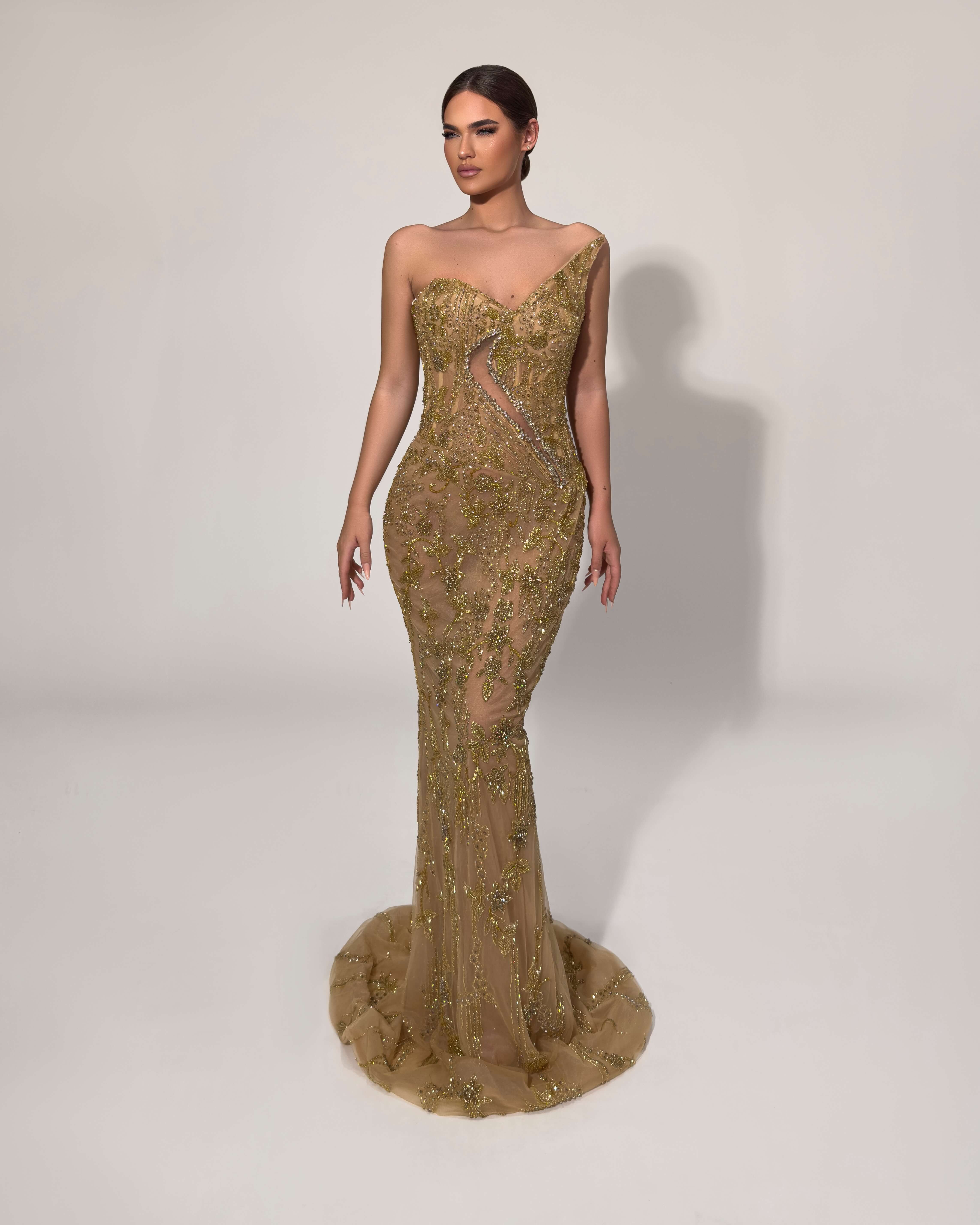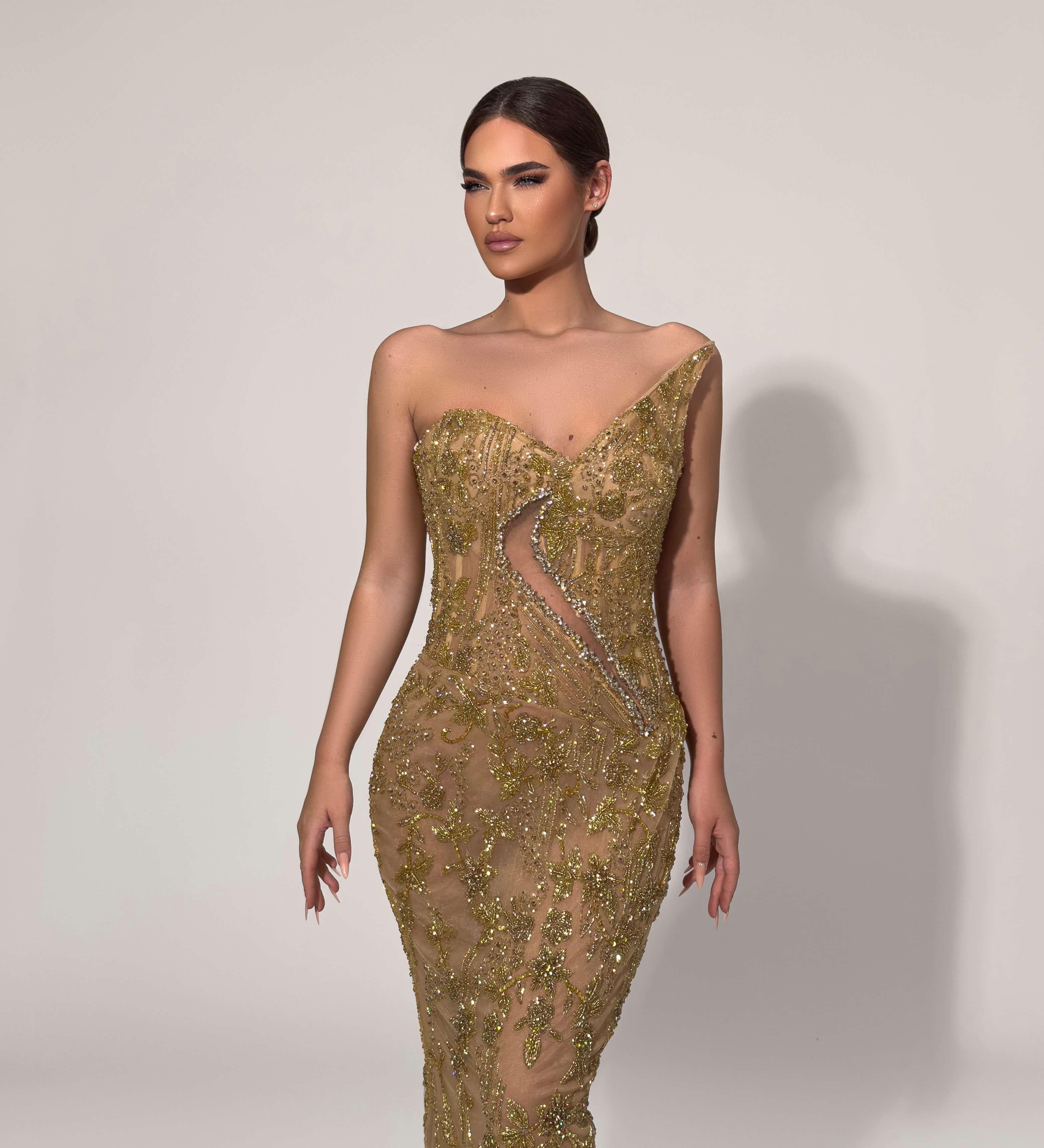 This one-shoulder gown features intricate gold beadwork and crystal embellishments over sheer fabric, creating a radiant and sculpted silhouette. Designed to shimmer beautifully under the light.