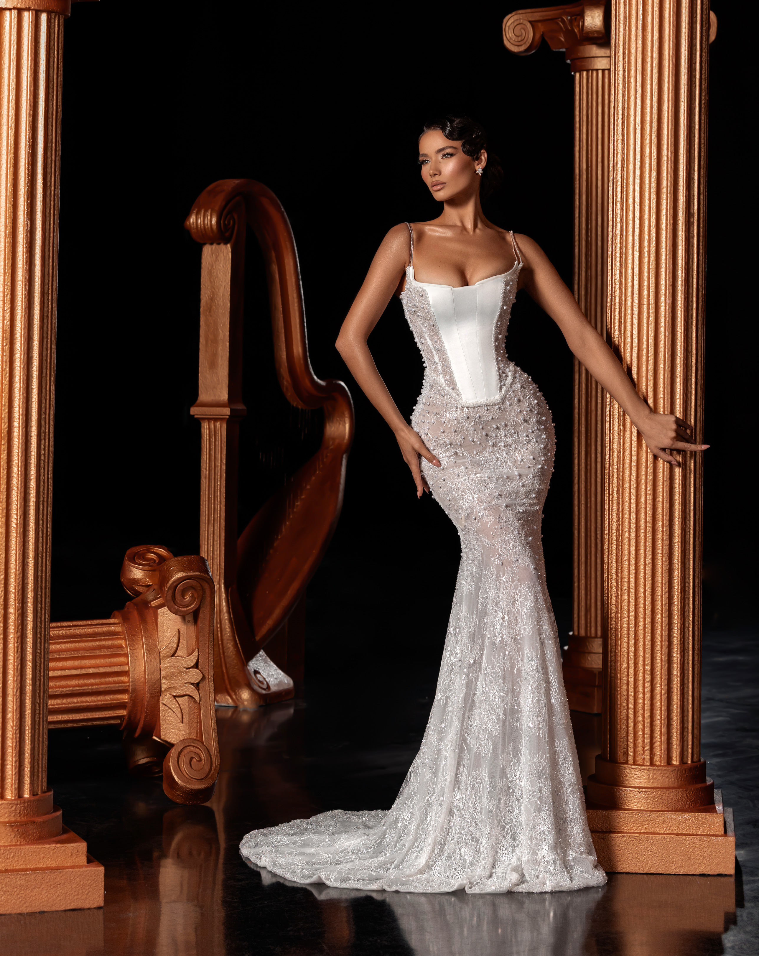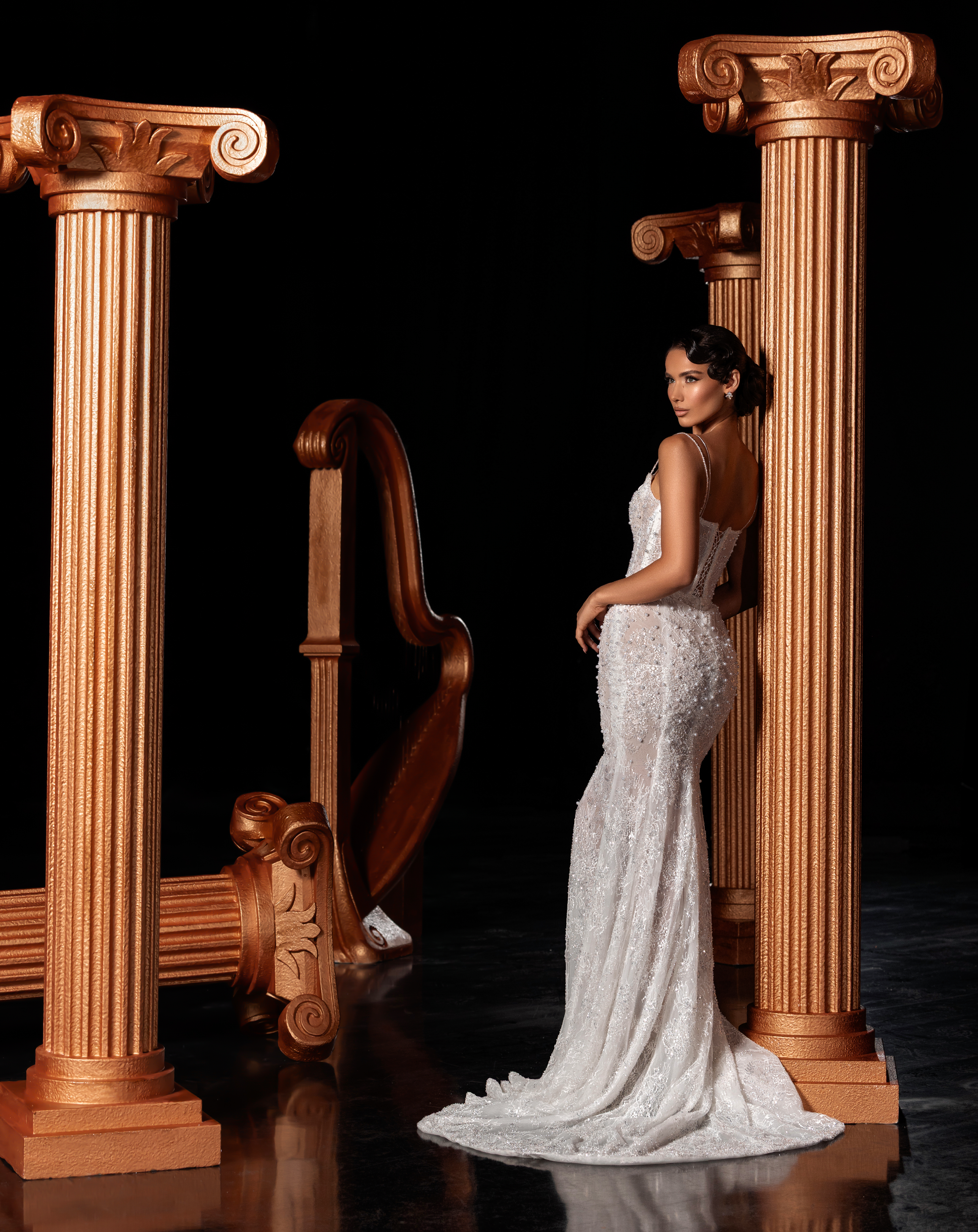 - Floor-length silhouette with subtle train adding timeless sophistication