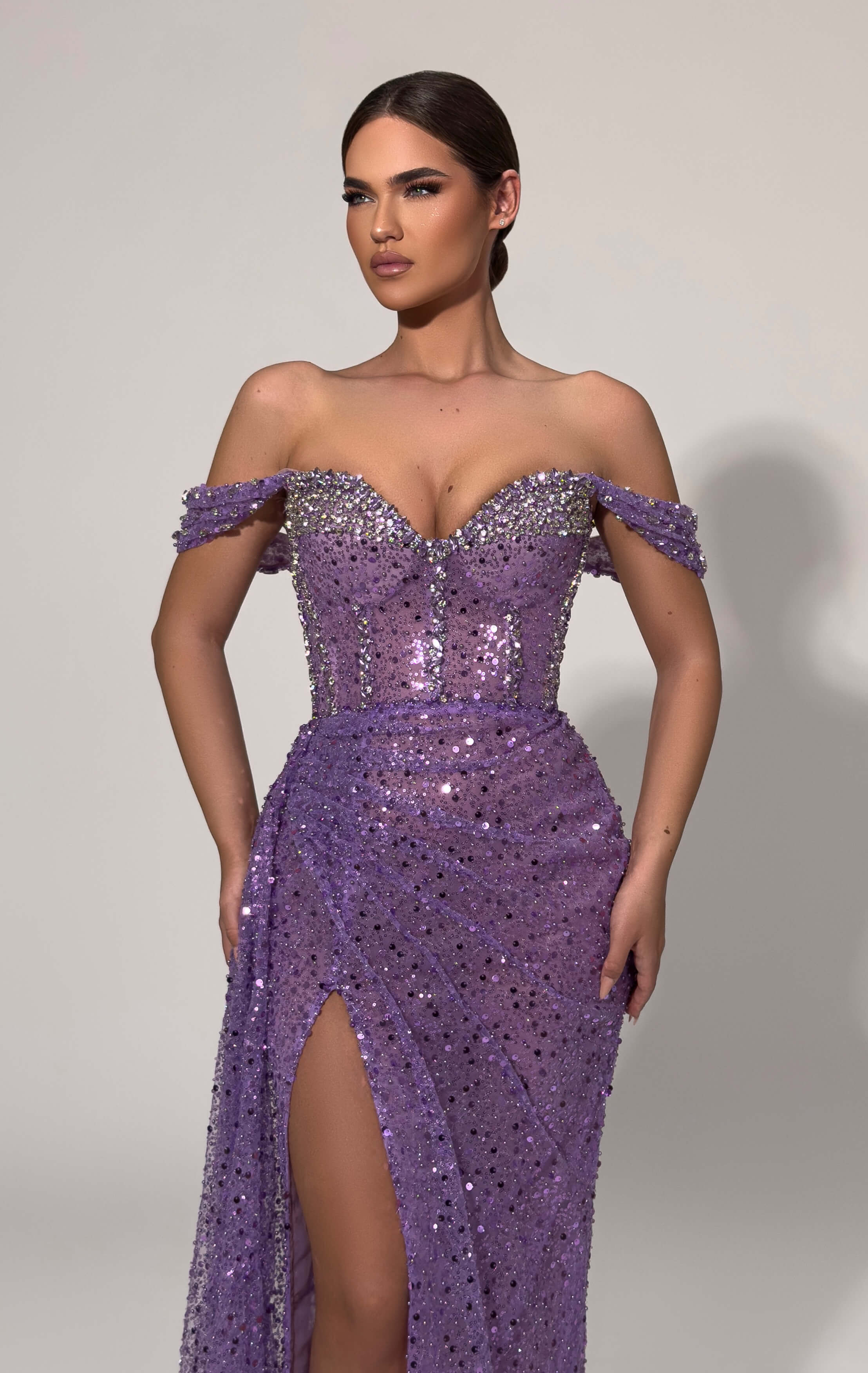 This off-shoulder lilac gown features a sparkling sequin fabric, sweetheart neckline, and high slit for a refined yet daring look. The corset bodice adds a sculpted fit and graceful charm.