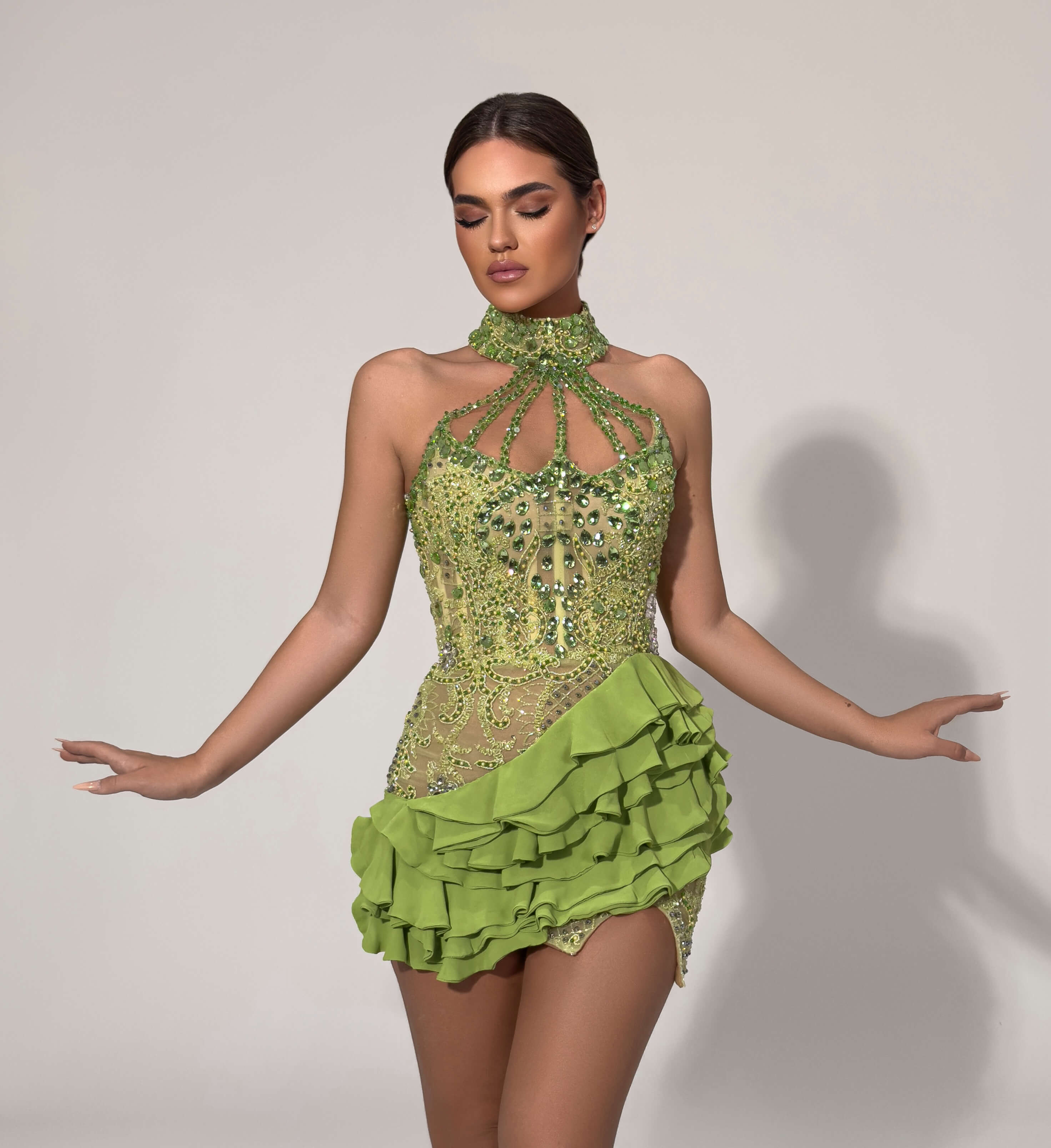 This vibrant green mini dress features a halter neckline with crystal embellishments and layered ruffles on one side, creating a playful yet elegant silhouette.