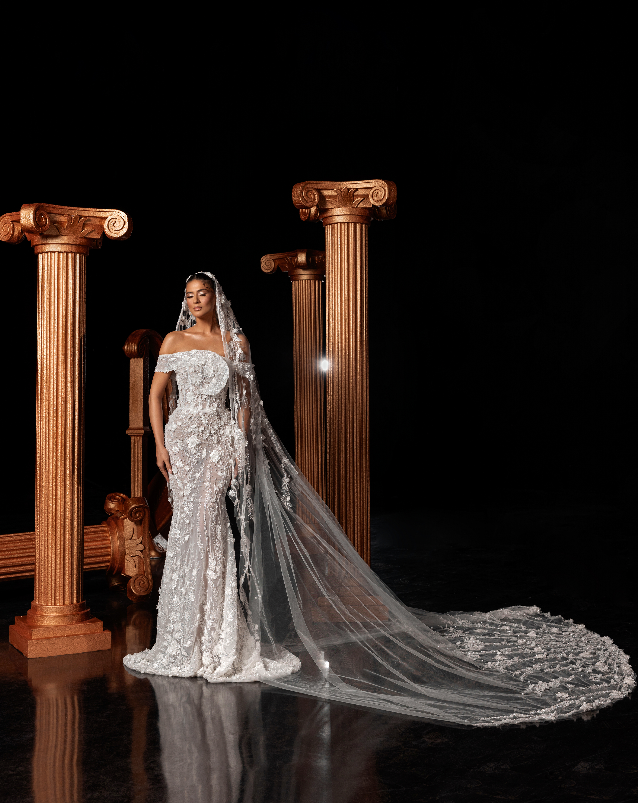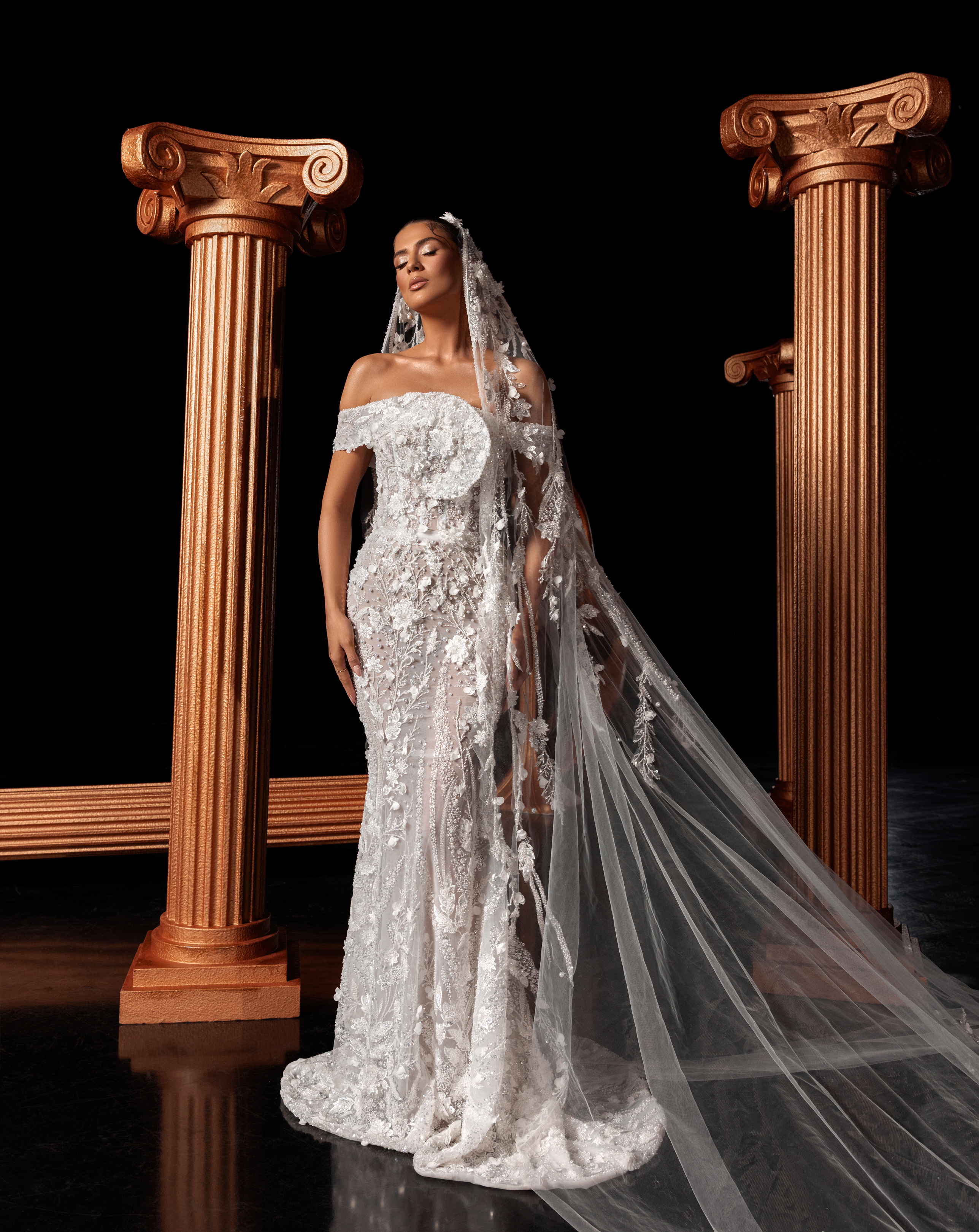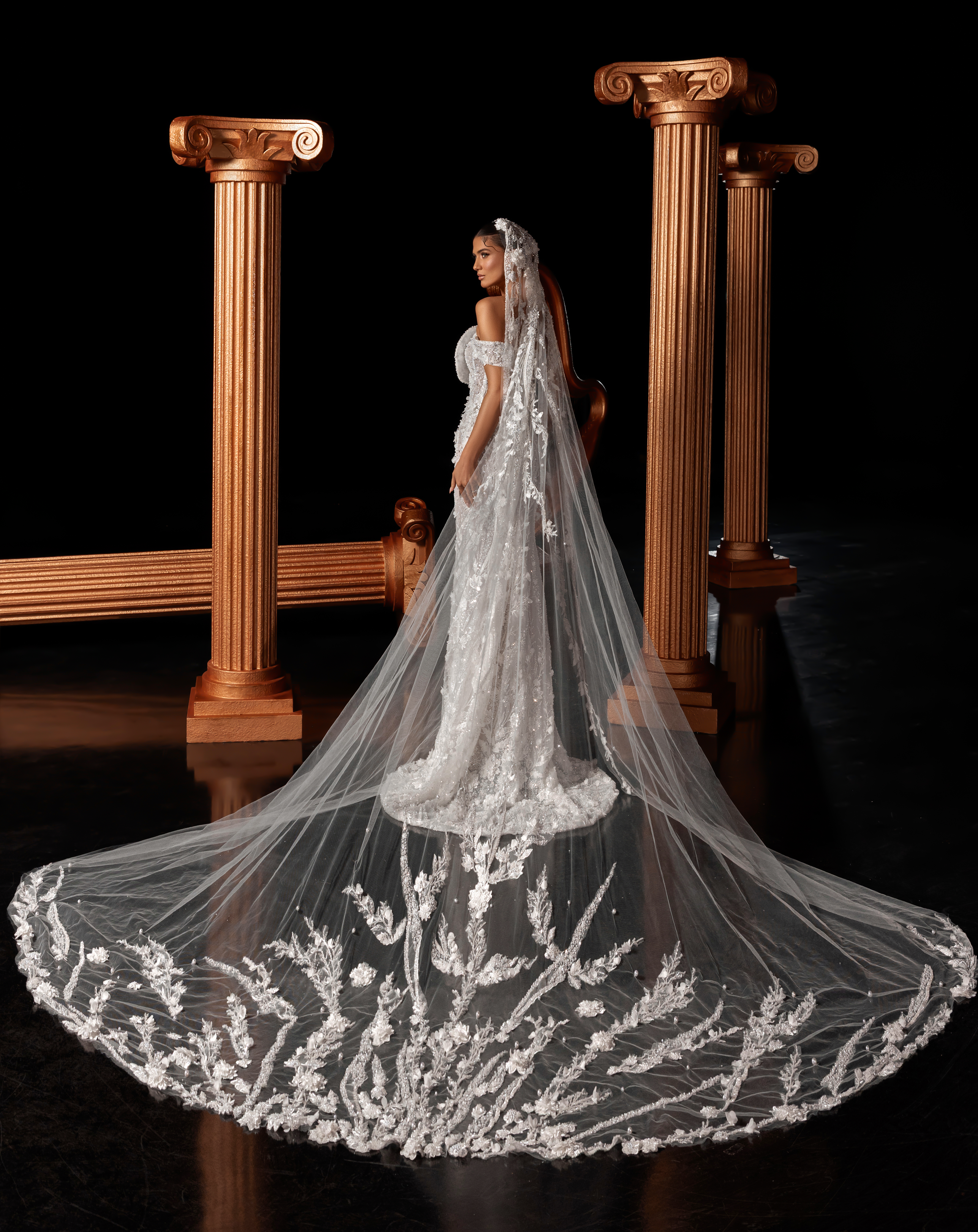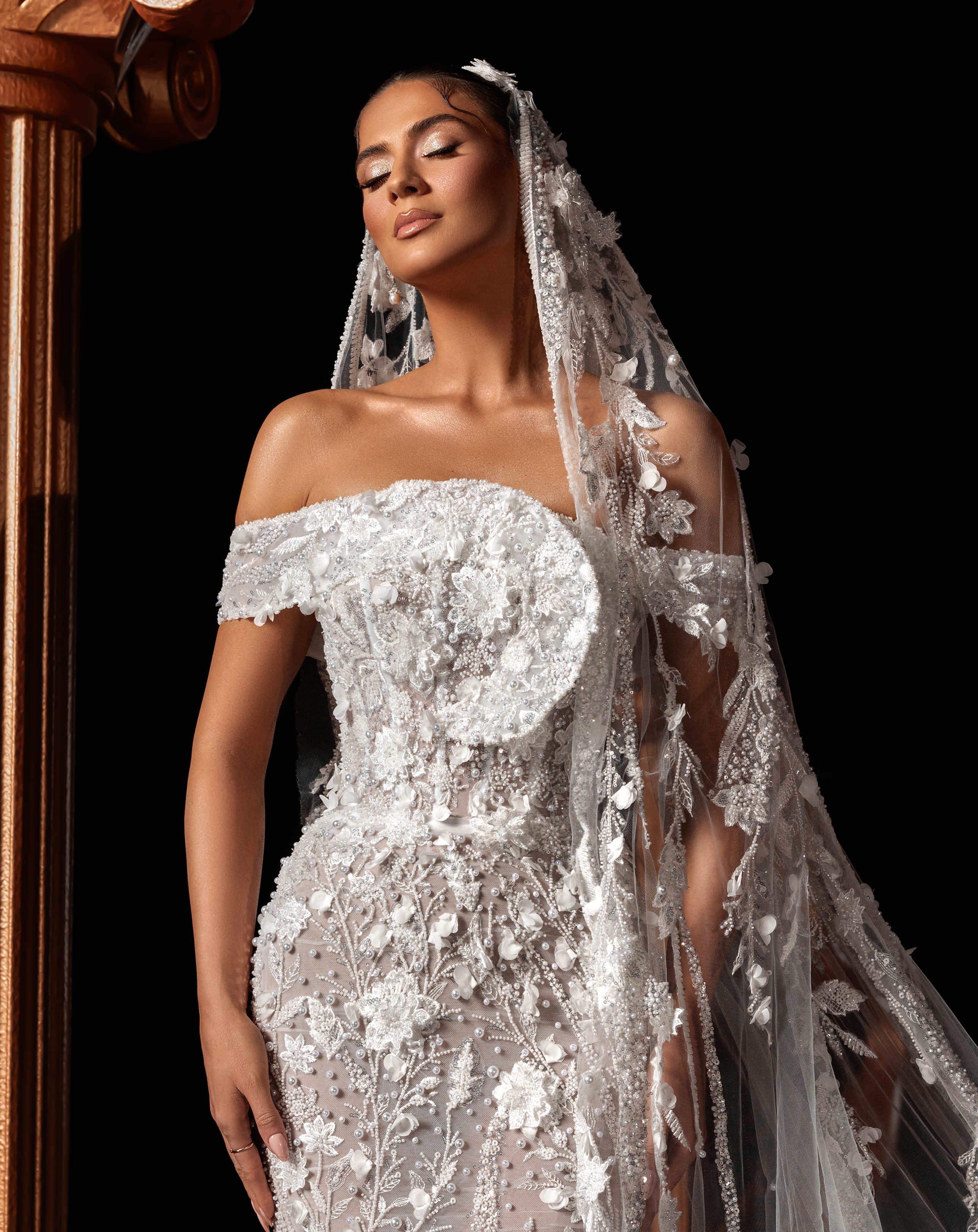 - Paired with a dramatic embroidered veil for a romantic bridal statement