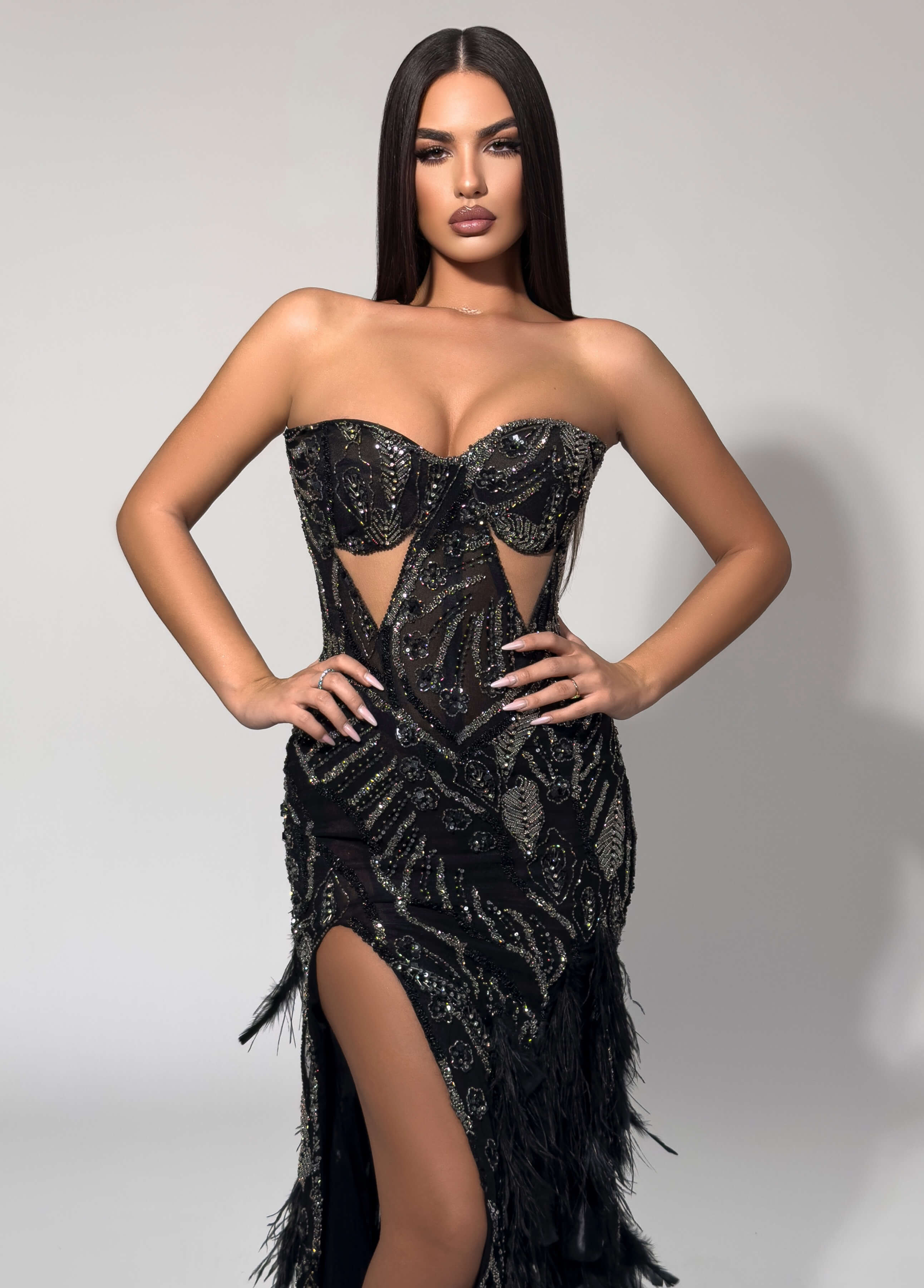 The dramatic thigh-high slit offers effortless movement and red-carpet allure, while cascading layers of luxurious black feathers create a breathtaking train that flows behind you. Each feather is carefully placed to create maximum volume and movement, ensuring you'll be the center of attention at any event.
