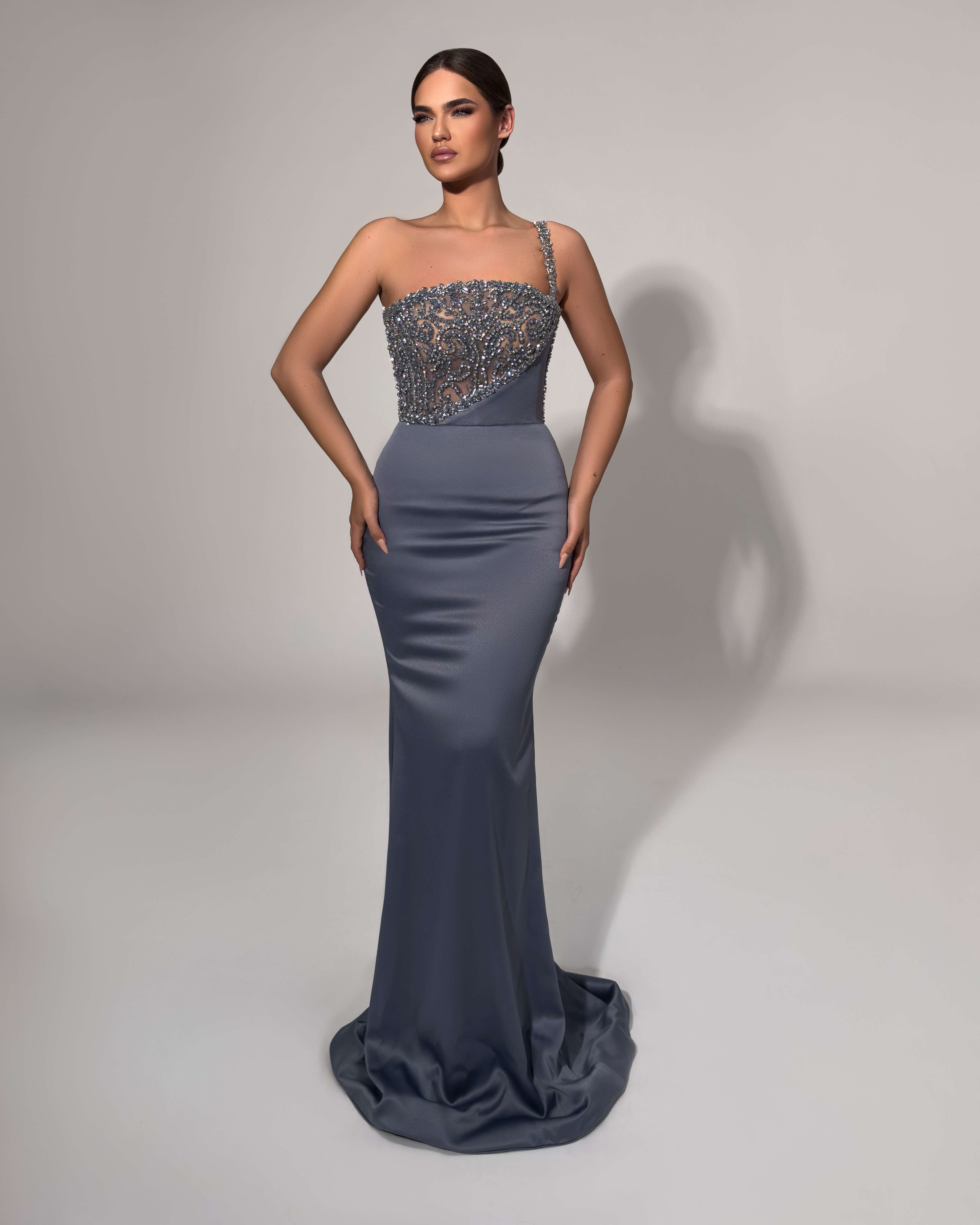 This elegant one-shoulder gown features a beaded bodice with intricate crystal detailing and a smooth satin skirt that flows to the floor. Designed to accentuate the silhouette with timeless sophistication.