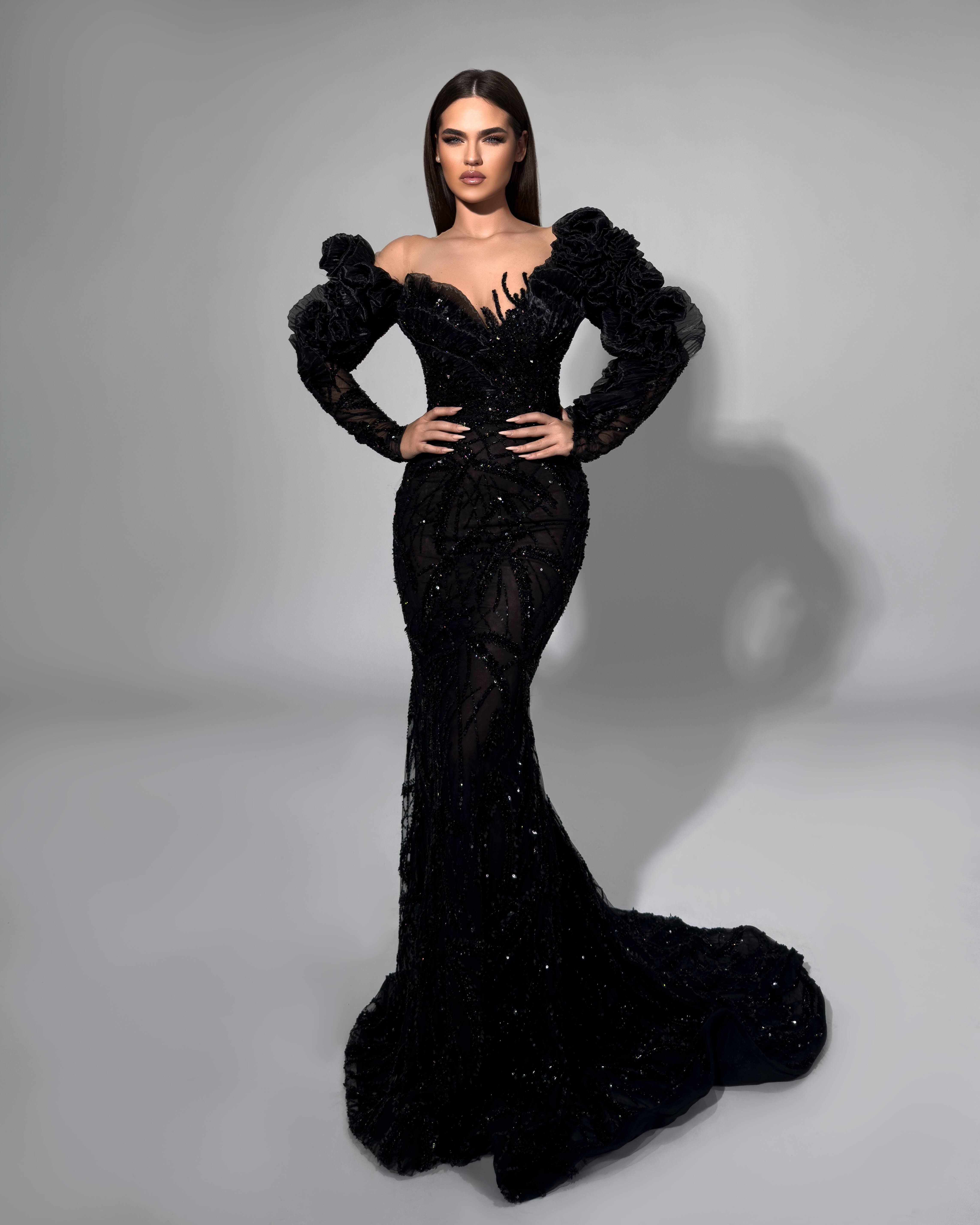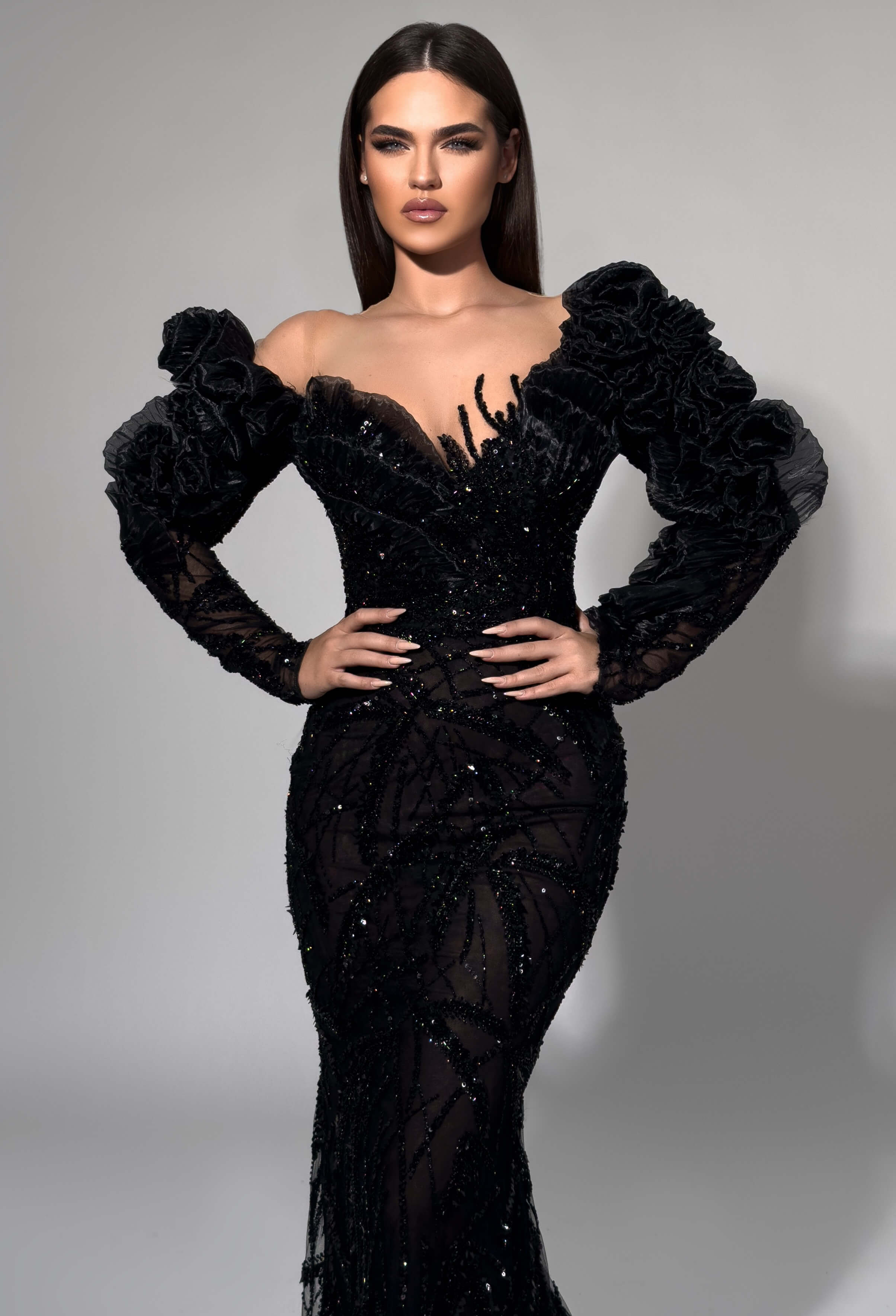 Embrace dramatic sophistication in this stunning black gown featuring voluminous ruffled sleeves and a figure-hugging silhouette. The off-shoulder design with exaggerated organza sleeves creates a bold statement, while the sheer beaded bodice and mermaid skirt ensure a captivating silhouette. Perfect for galas, black-tie events, and exclusive evening occasions where luxury meets modern glamour.