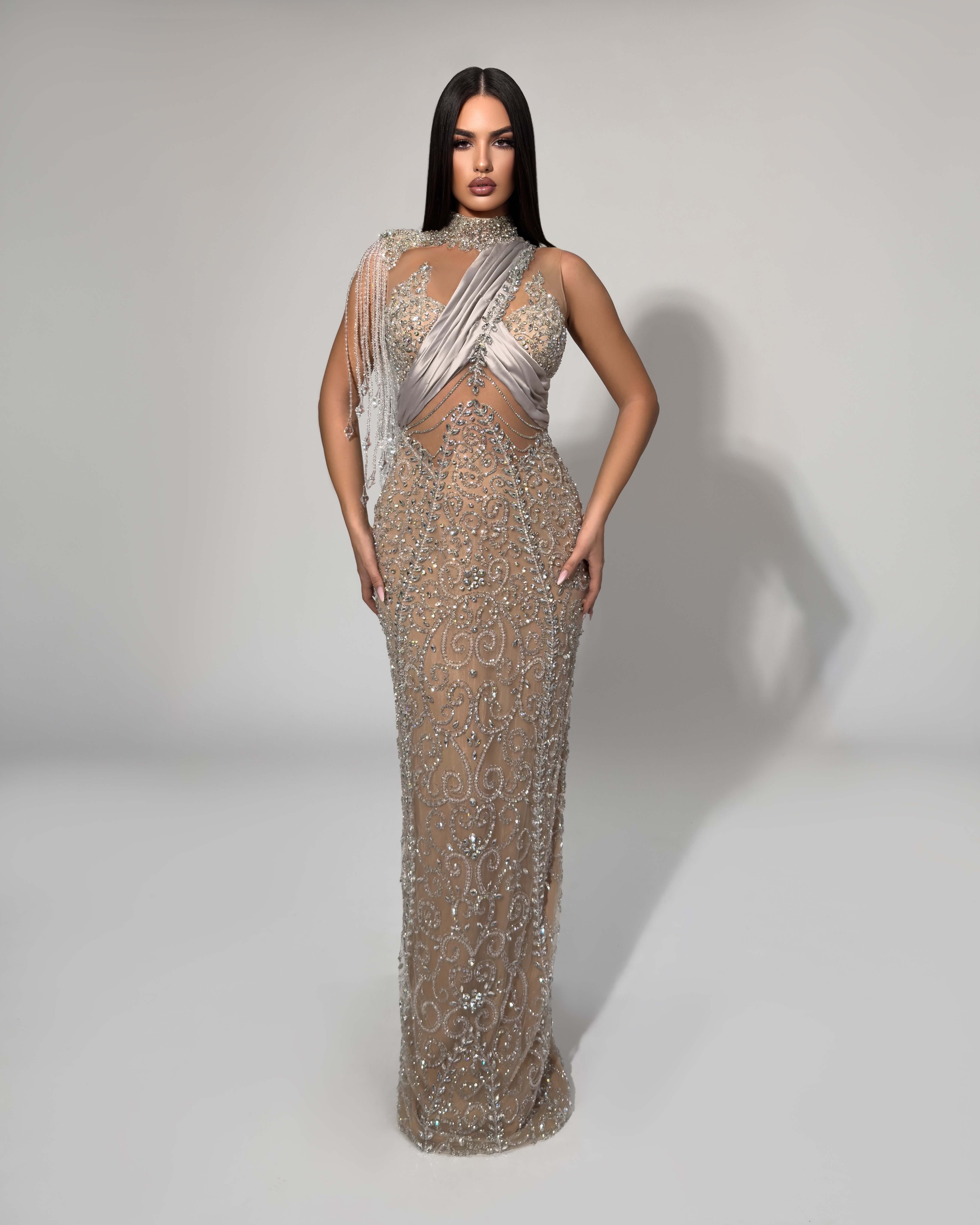 Exude timeless elegance in this show-stopping high-neck gown that masterfully blends classic sophistication with modern allure. The sculptural neckline features luxurious draped satin and cascading crystal fringe that frames the décolletage, while intricate beadwork adorns the sheer illusion bodice and skirt.