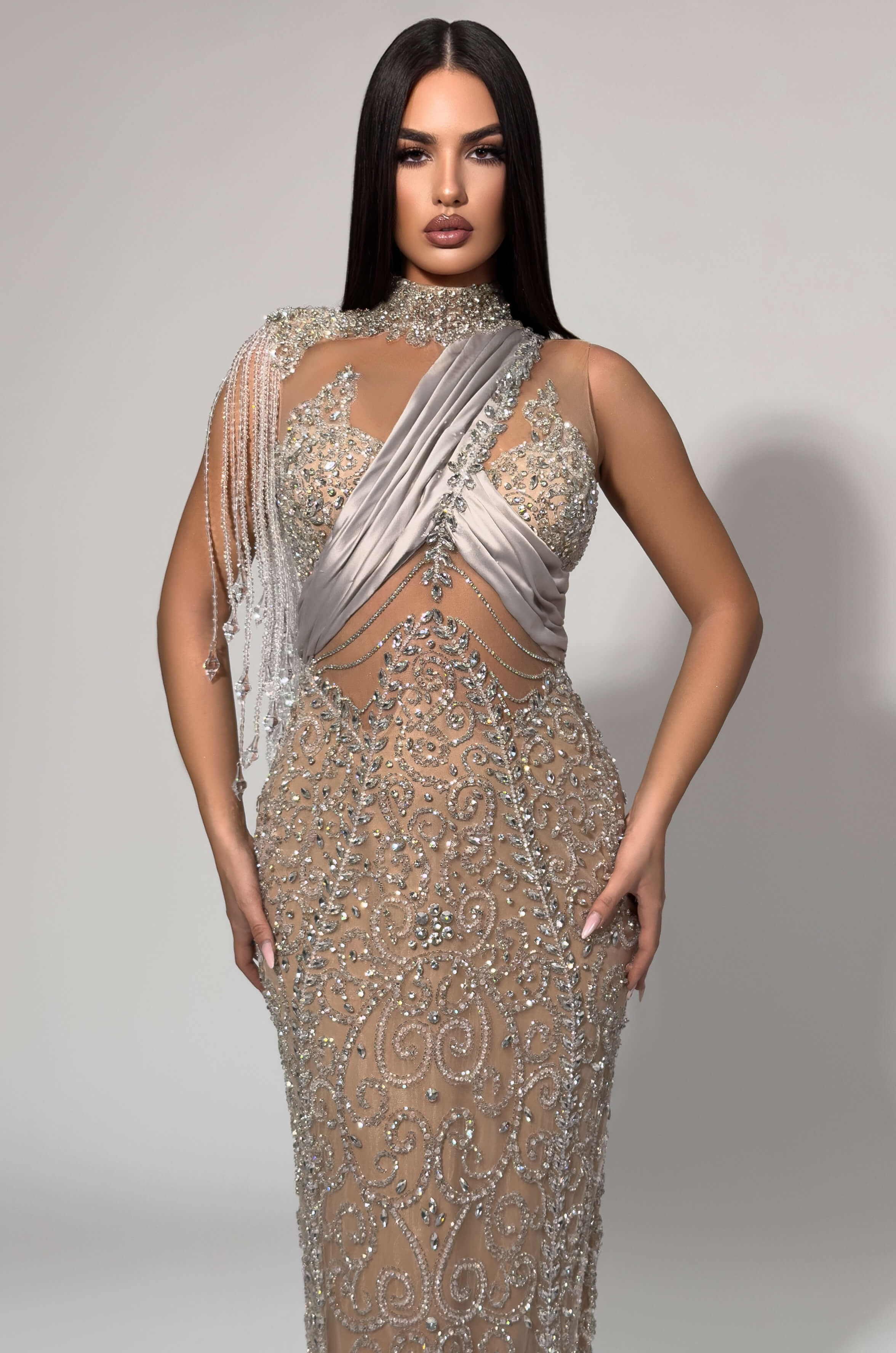 Hand-embellished with champagne and silver beading in ornate scrollwork patterns, this column silhouette creates a luminous, second-skin effect. The dramatic fringe detailing adds movement and dimension, ensuring you captivate from every angle at galas, premieres, and the most prestigious events