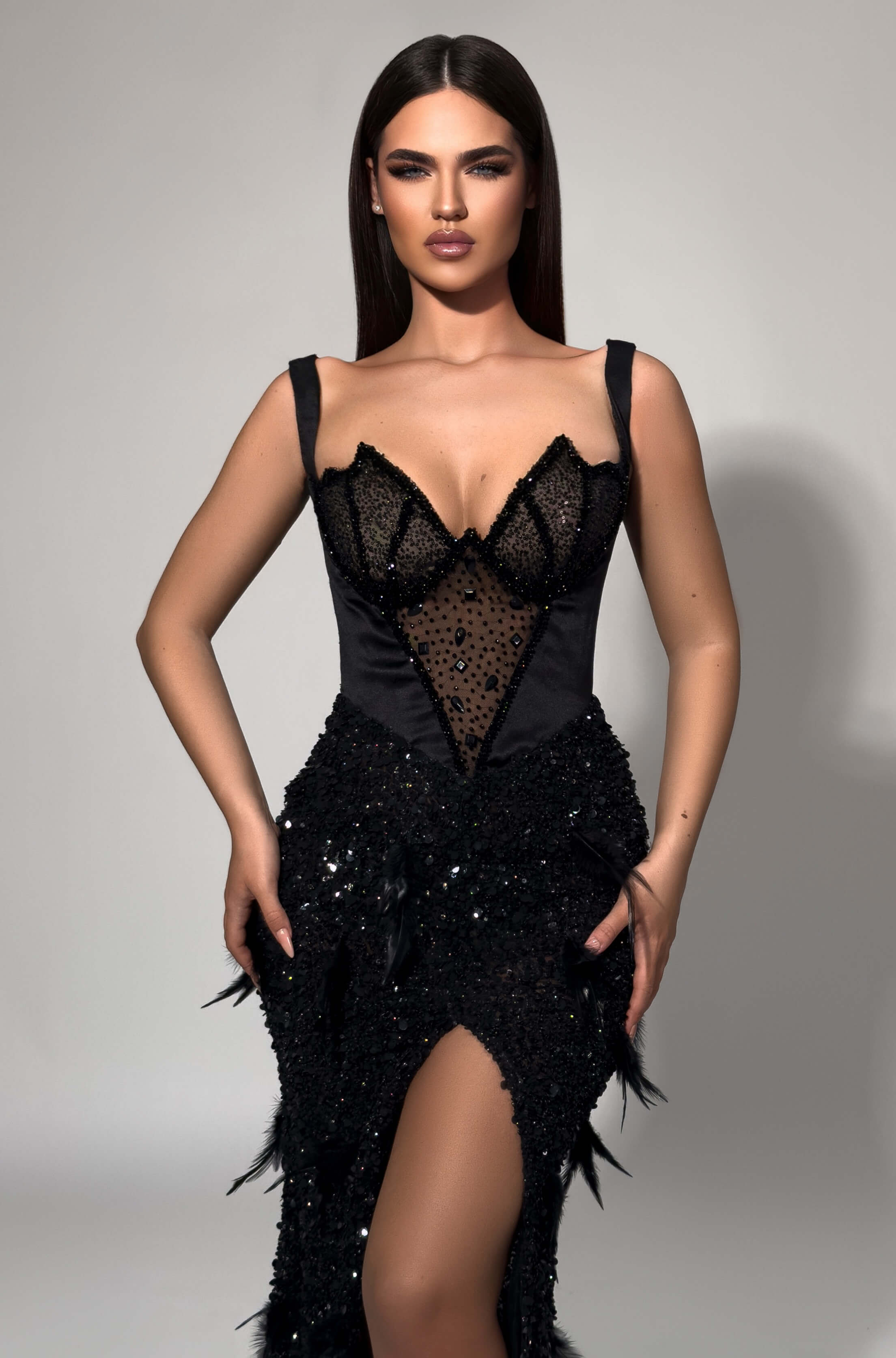 Embrace bold glamour in this show-stopping black gown featuring a structured corset bodice with sheer lace detailing and dramatic feather embellishments. The sweetheart neckline and wide straps create a confident silhouette, while cascading feathers along the skirt and train add movement and texture. The daring front slit ensures effortless elegance with every step. Perfect for galas, black-tie events, and red carpet moments where luxury meets unforgettable drama.