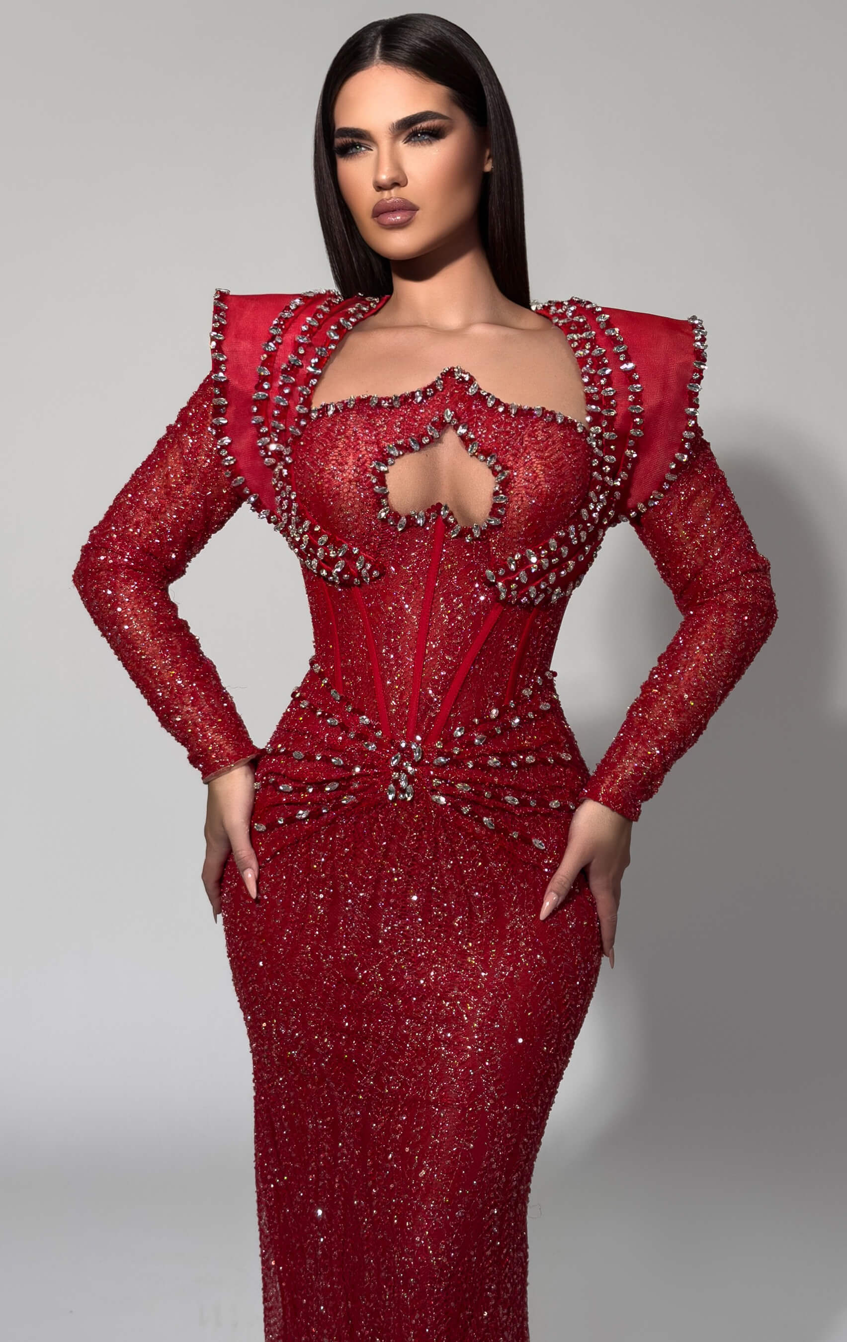 Statement long-sleeve gown with structured shoulders and a keyhole neckline.