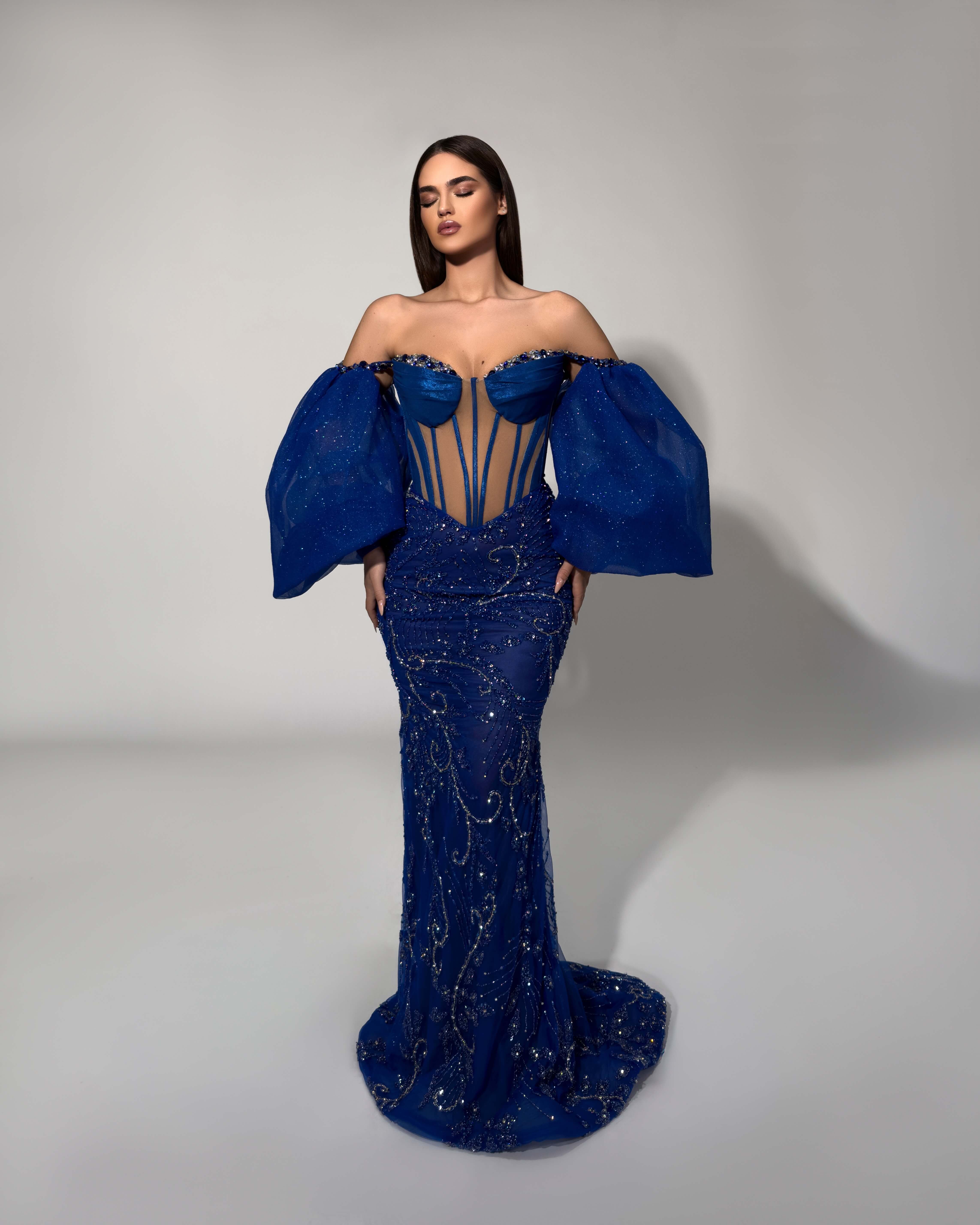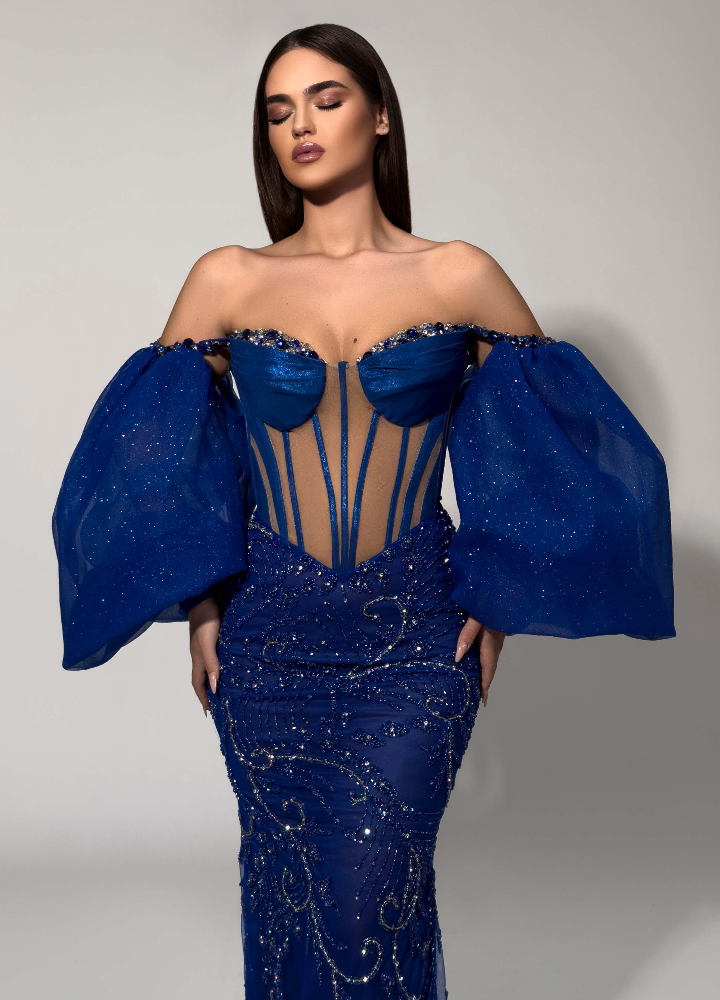 Command the room in this breathtaking royal blue gown featuring dramatic oversized bell sleeves and a daring sheer corset bodice with crystal trim. The figure-hugging embellished skirt is adorned with shimmering beadwork in an intricate pattern, flowing into an elegant train. A bold masterpiece for the woman who isn't afraid to make an unforgettable entrance.