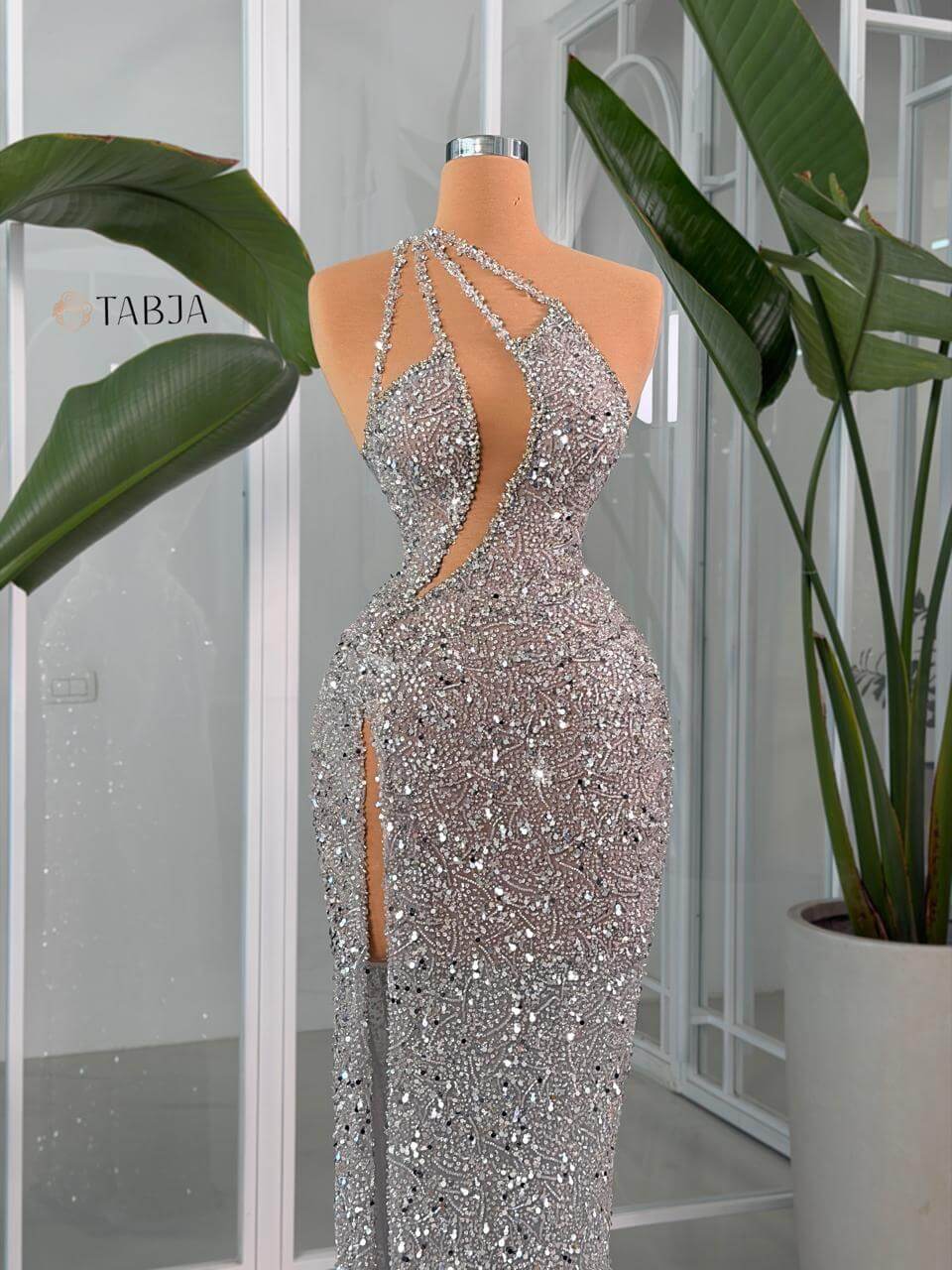 Make an unforgettable entrance in this show-stopping silver sequined gown. Featuring a daring halter neckline with delicate chain detailing and a figure-hugging silhouette, this floor-length dress is fully embellished with shimmering sequins that catch the light from every angle. A sultry thigh-high slit adds modern elegance, while the open back creates a dramatic statement. Perfect for galas, red carpet events, or any occasion where you want to shine.