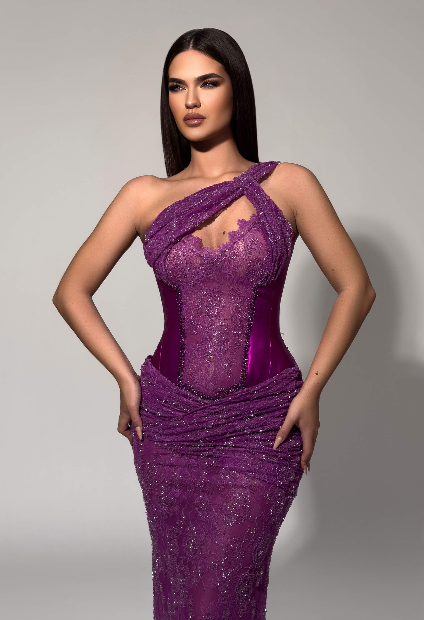Turn heads in this captivating violet gown featuring a daring asymmetric one-shoulder design with intricate cutout detailing. The sheer embellished bodice is adorned with shimmering sequins and beadwork, while ruched fabric at the waist creates a flattering silhouette. A bold choice for the confident woman who commands attention at every event.