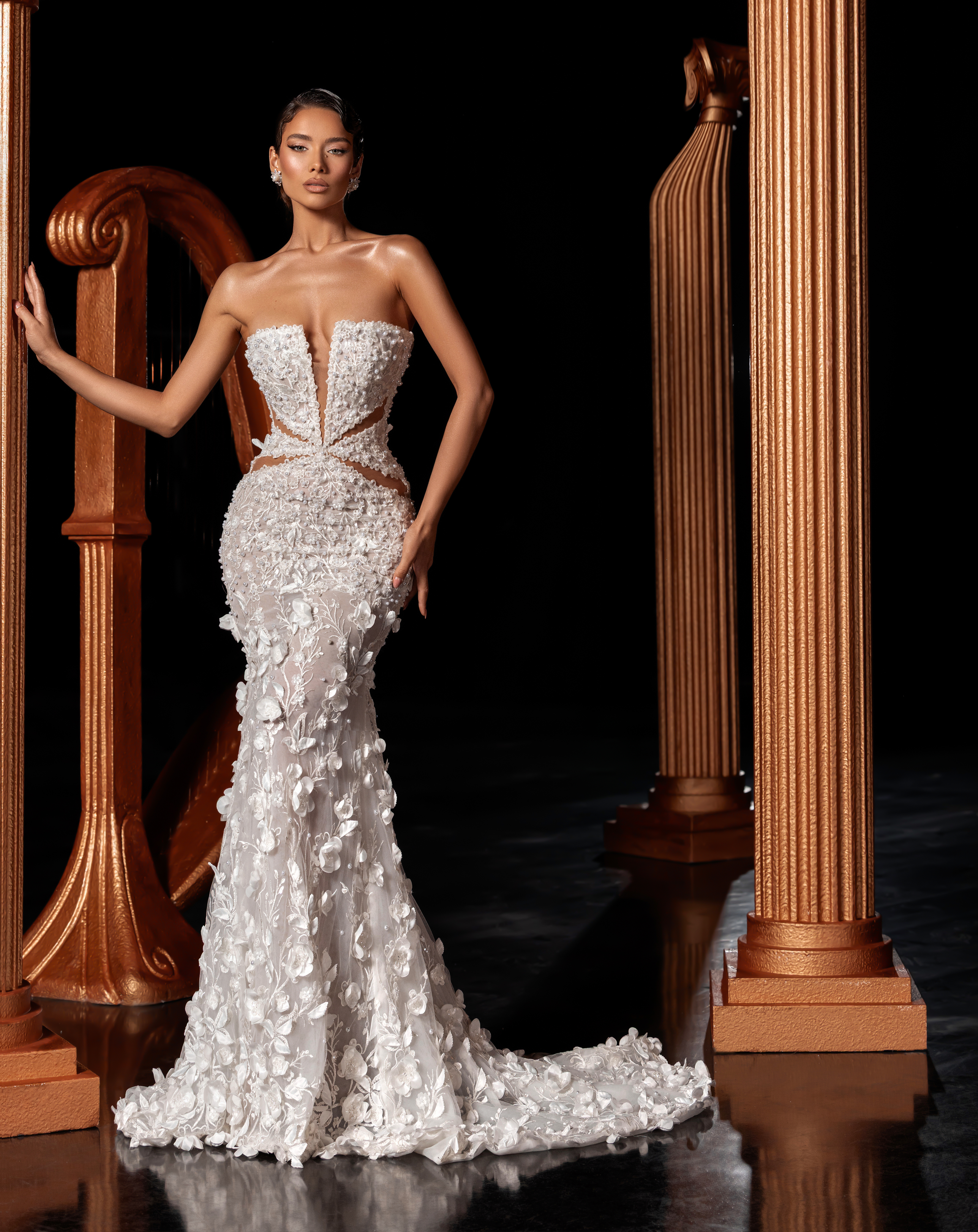 - Deep-plunge neckline with sculpted corset and sheer cutout details