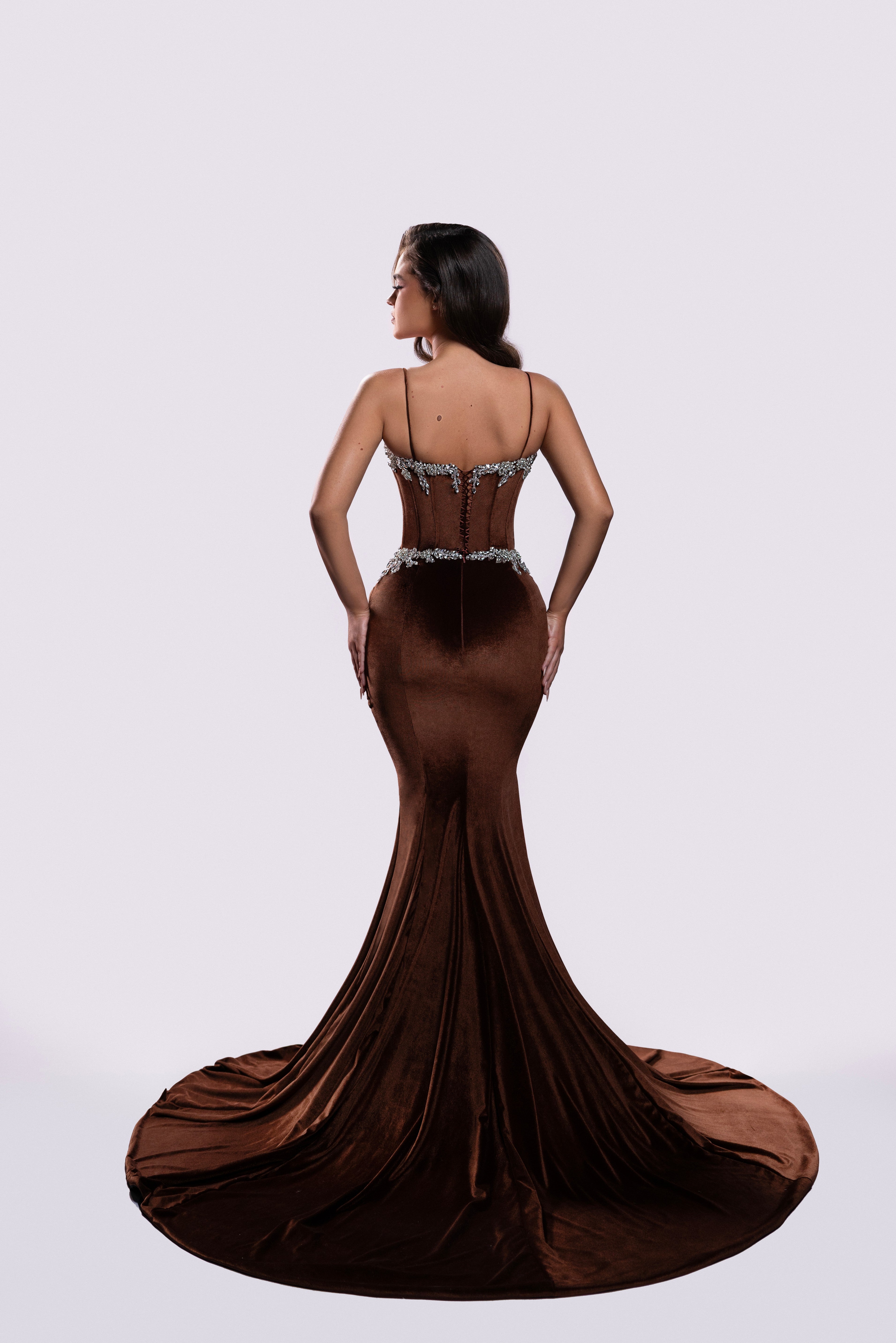 - Velvet corset bodice with crystal applique detailing