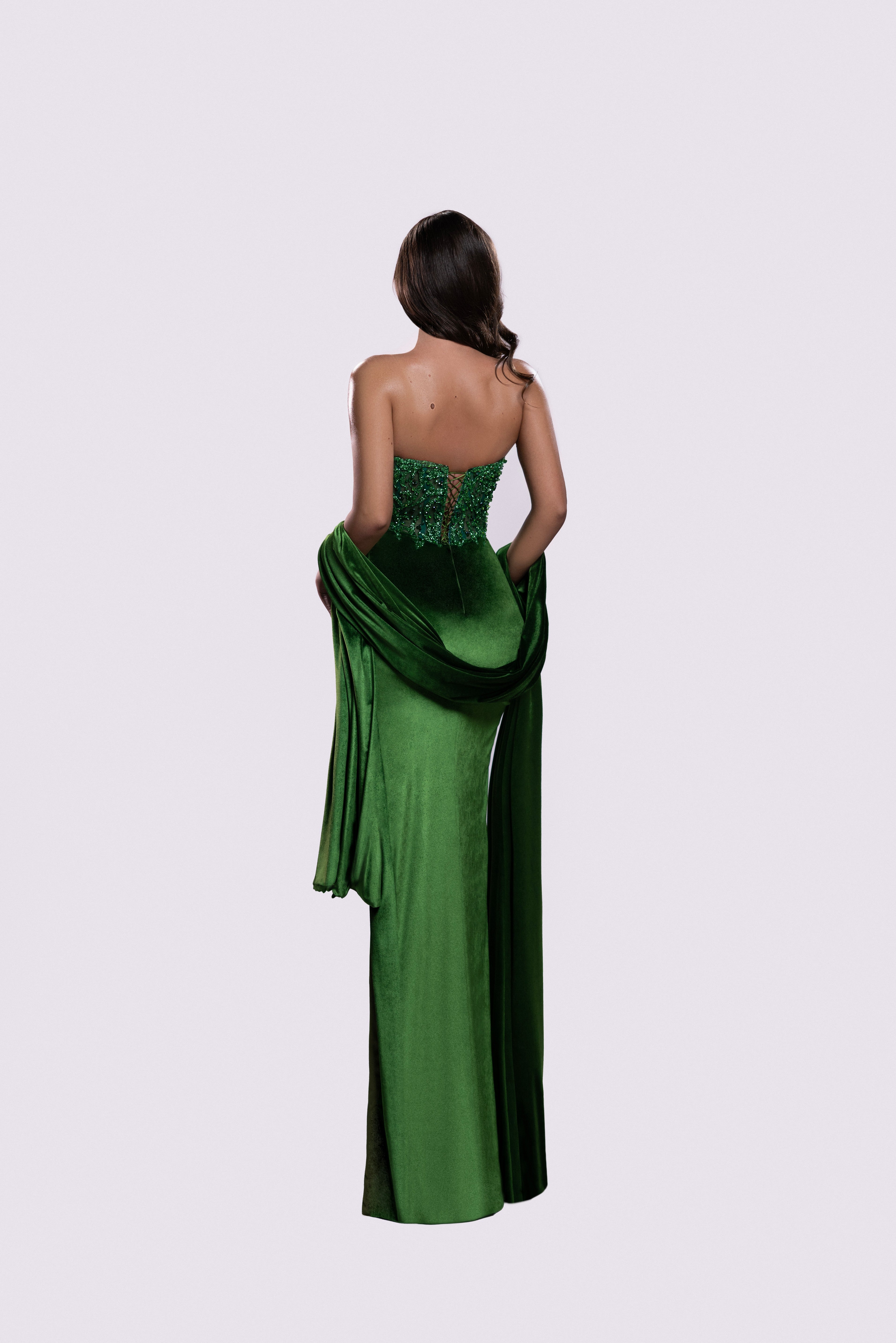 - Fitted silhouette with a soft train