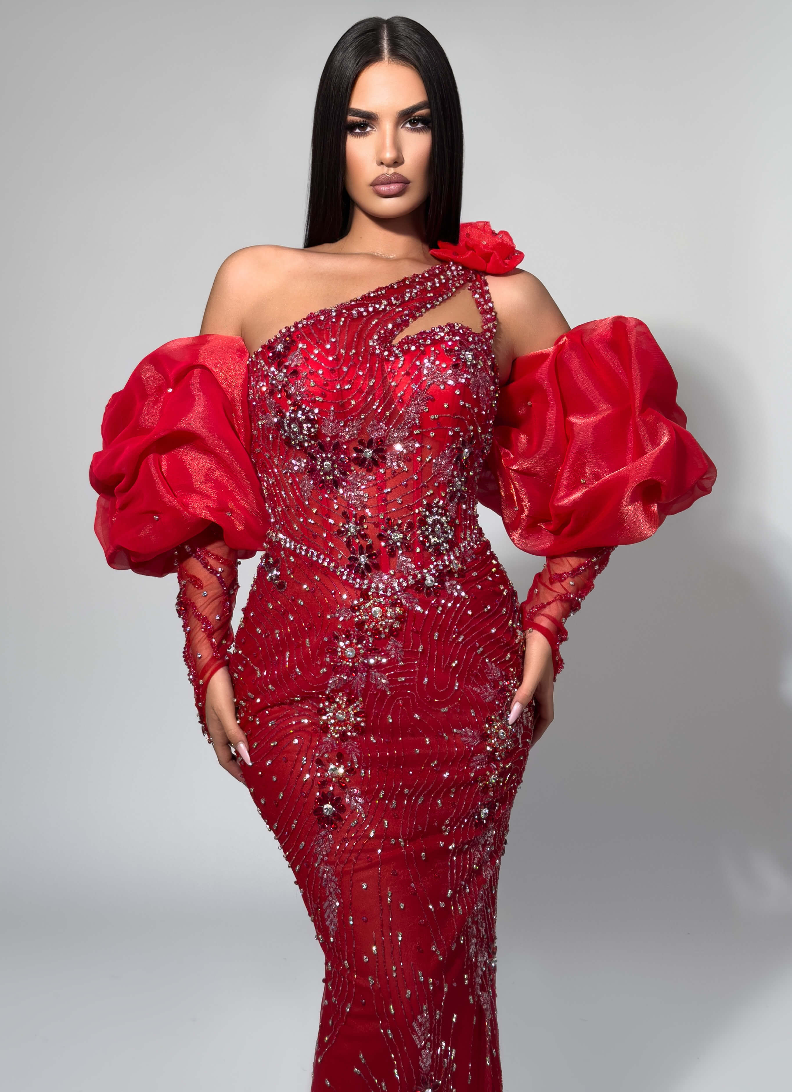 A show-stopping one-shoulder gown in vibrant red, featuring an illusion bodice with intricate silver and crystal beading in ornate patterns. The dramatic detachable organza puff sleeves and beaded long sleeves create a couture statement, while the figure-hugging mermaid silhouette ensures red-carpet glamour. Perfect for galas, award ceremonies, and unforgettable moments.