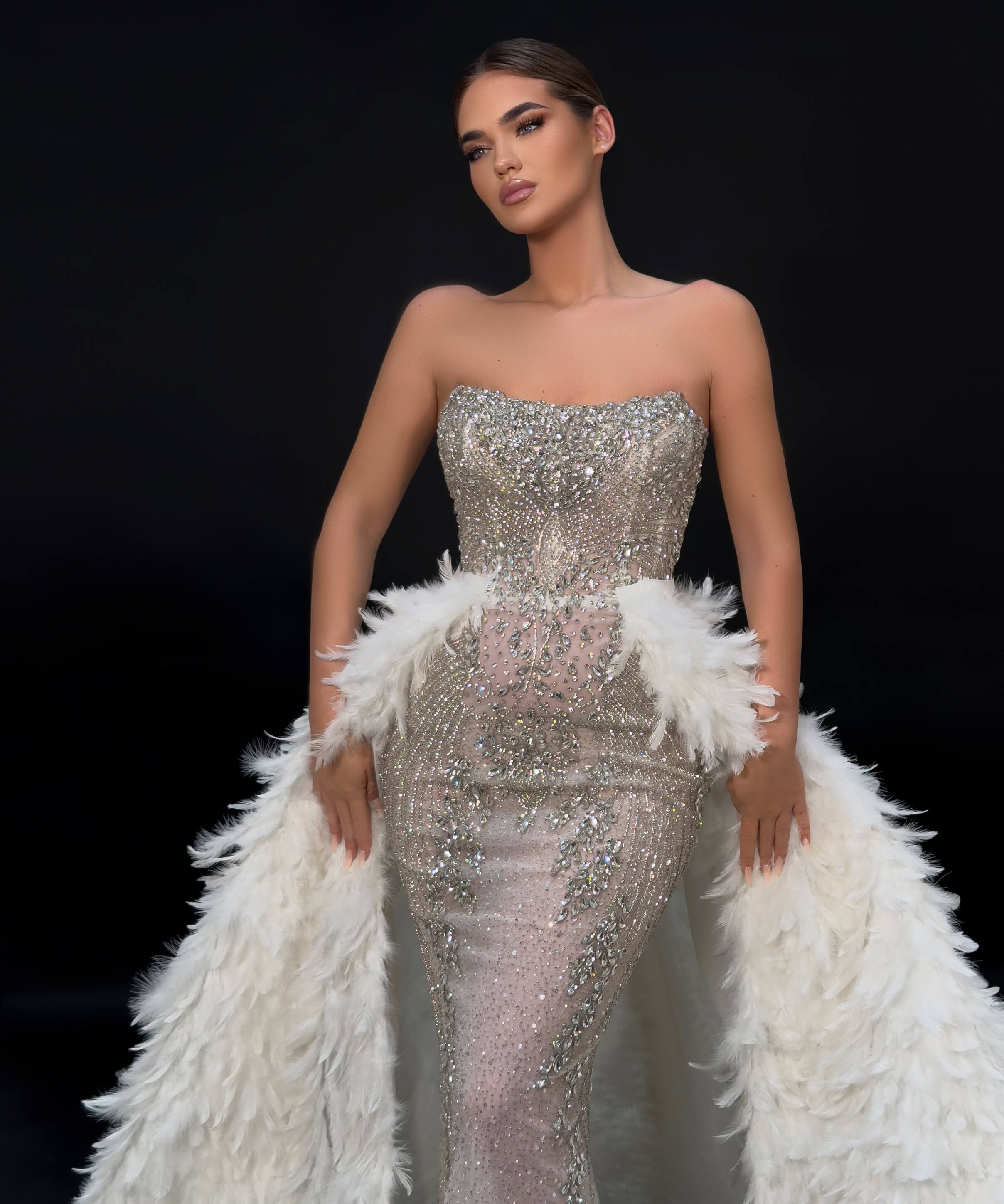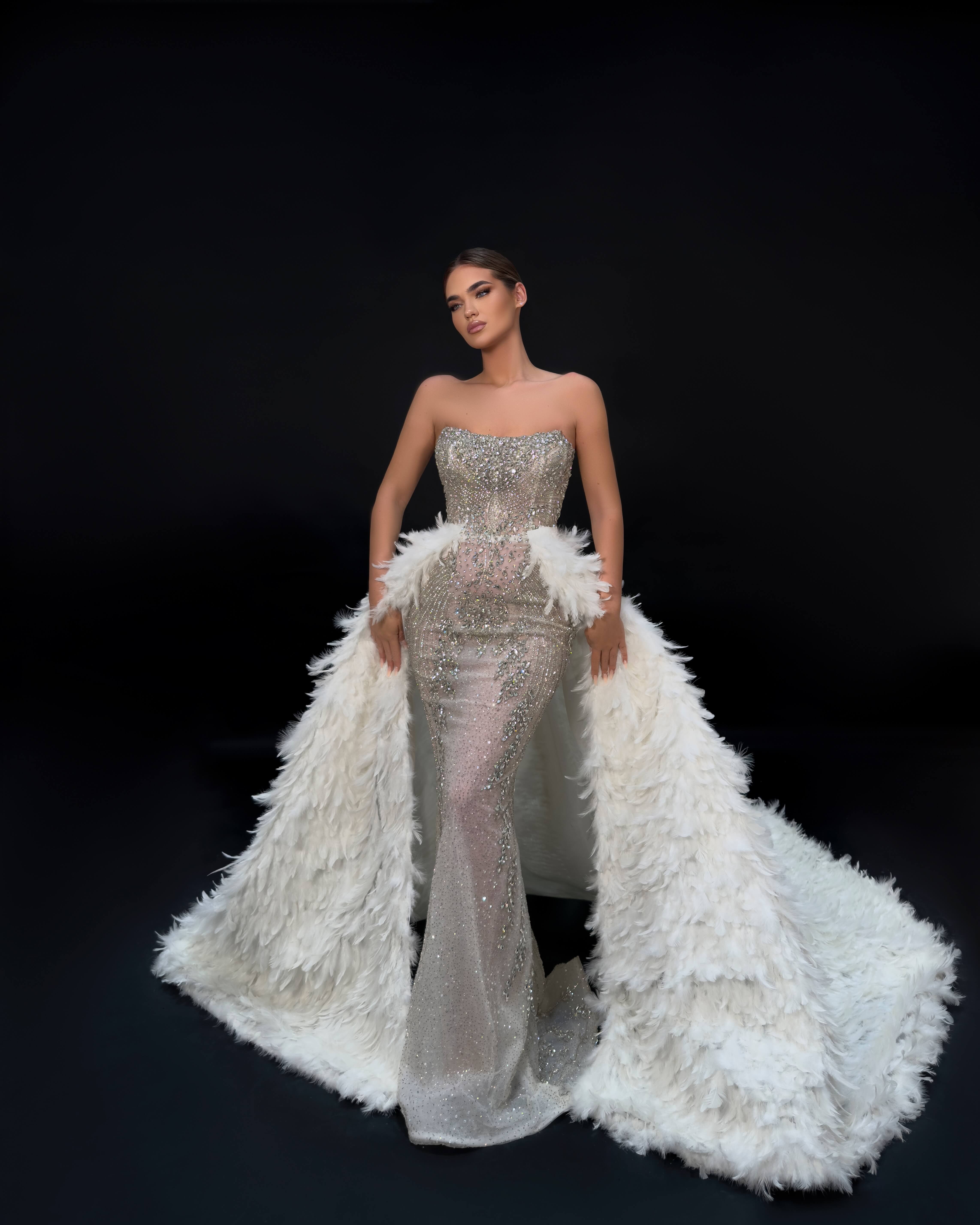 - Dramatic detachable feather overskirt for two looks in one