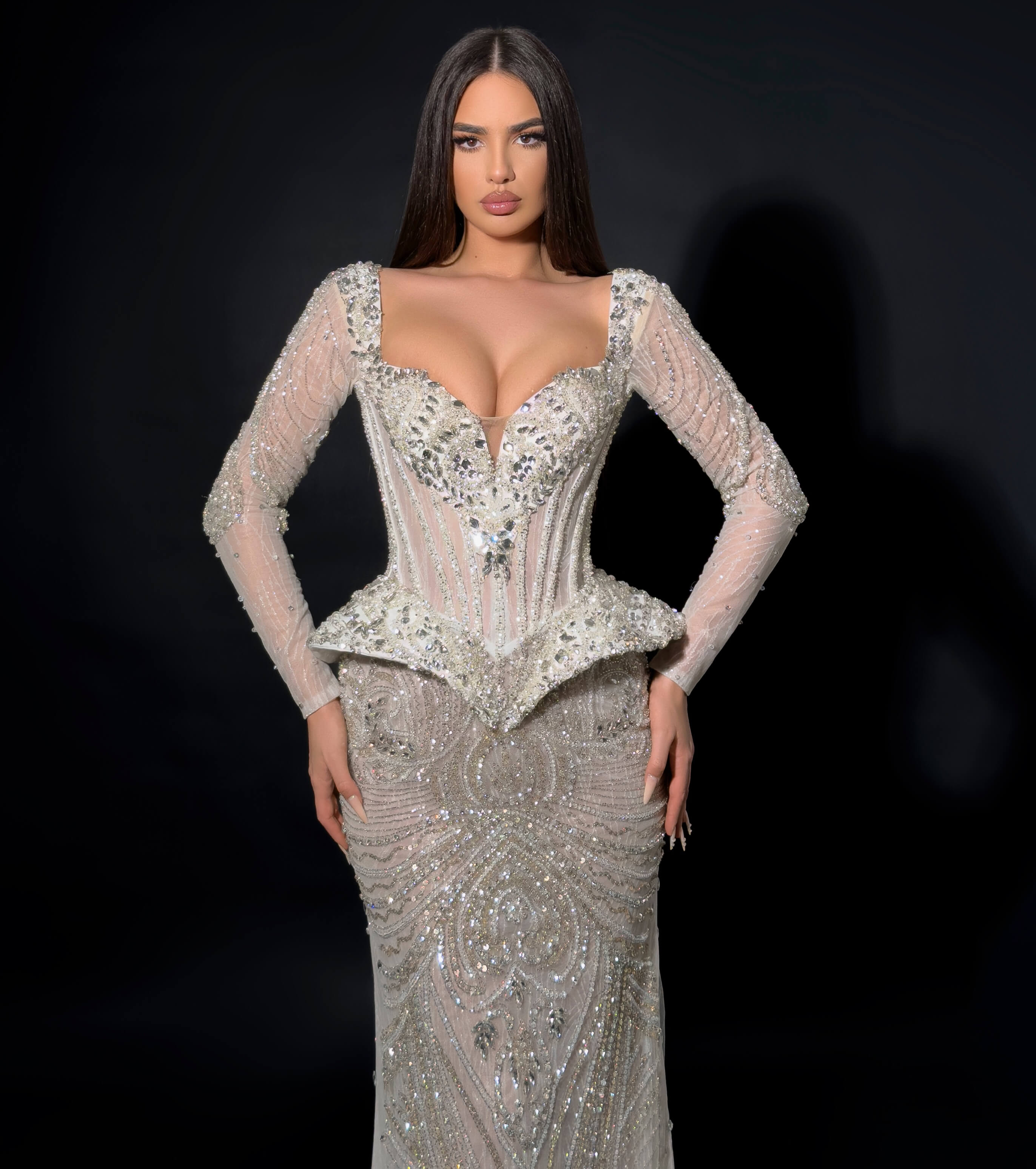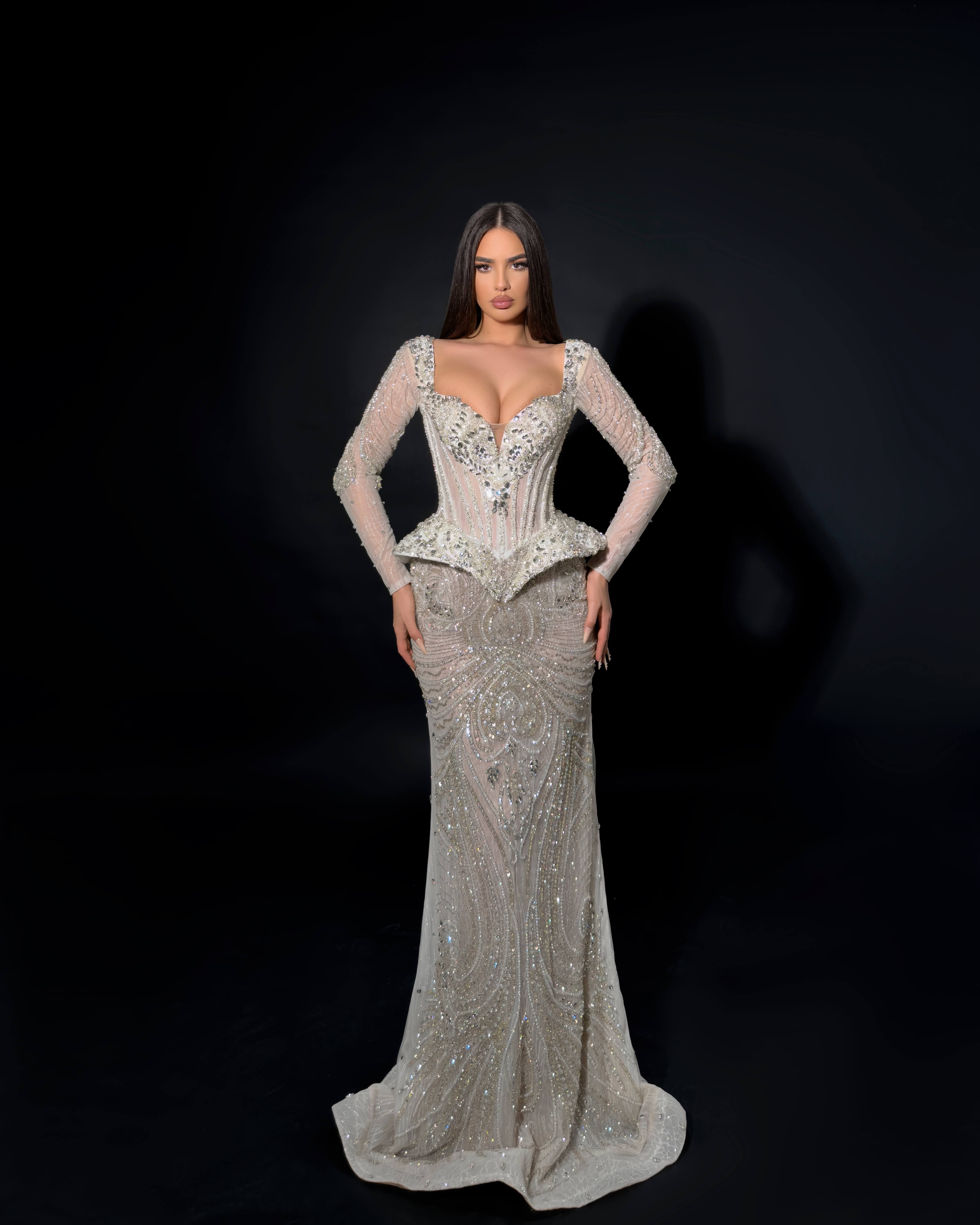- Hand-applied crystal and bead embellishments throughout entire gown