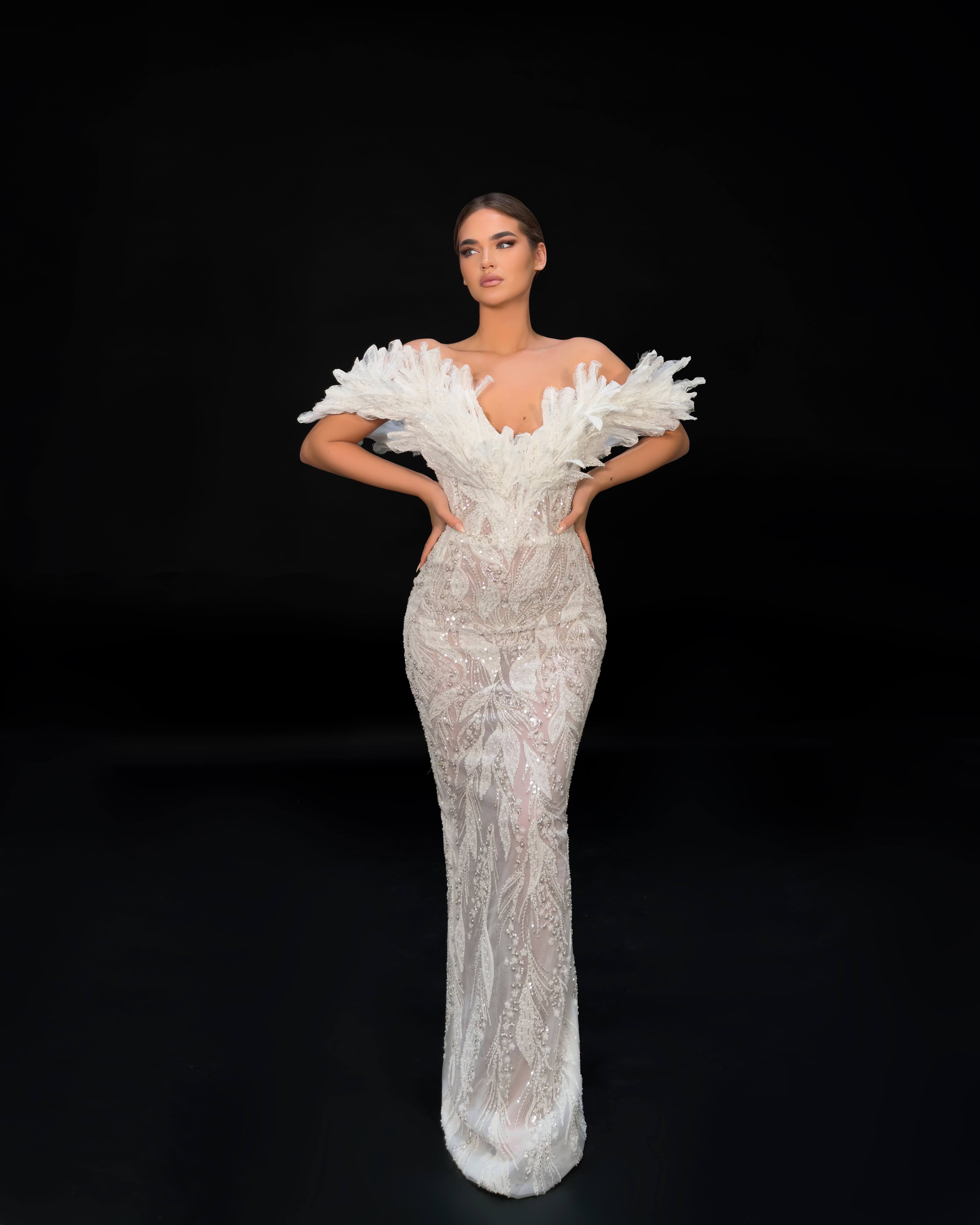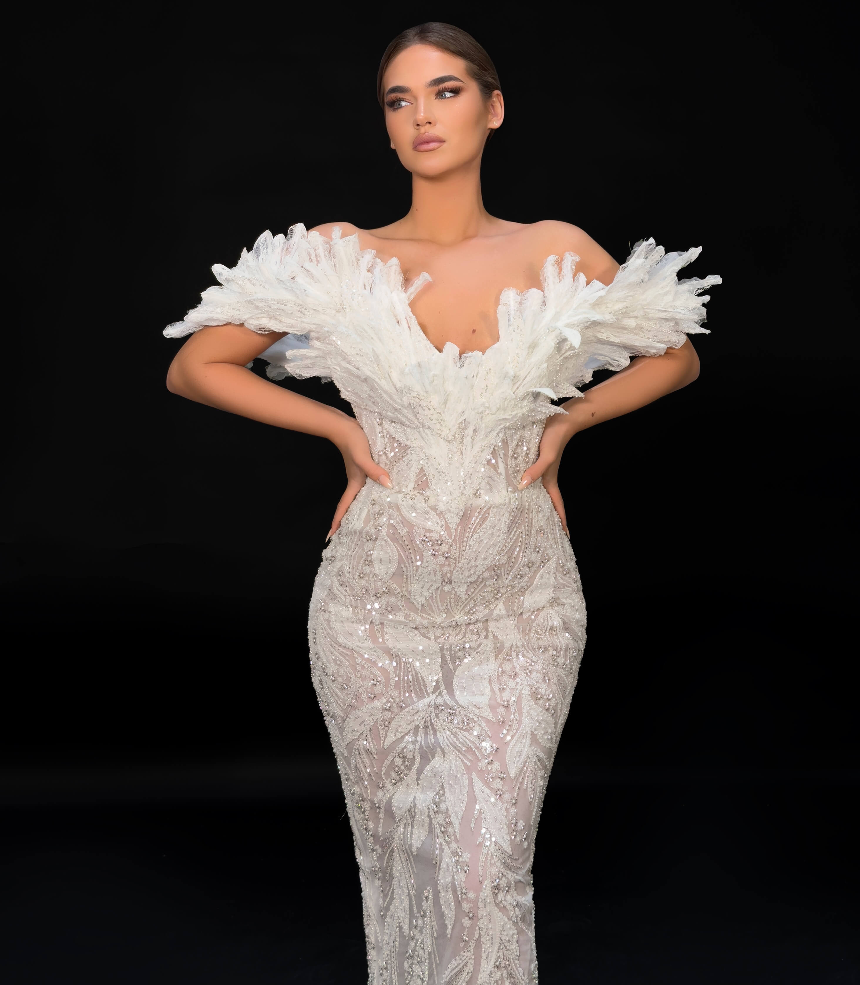 Feathered Sleeve Beaded Gown