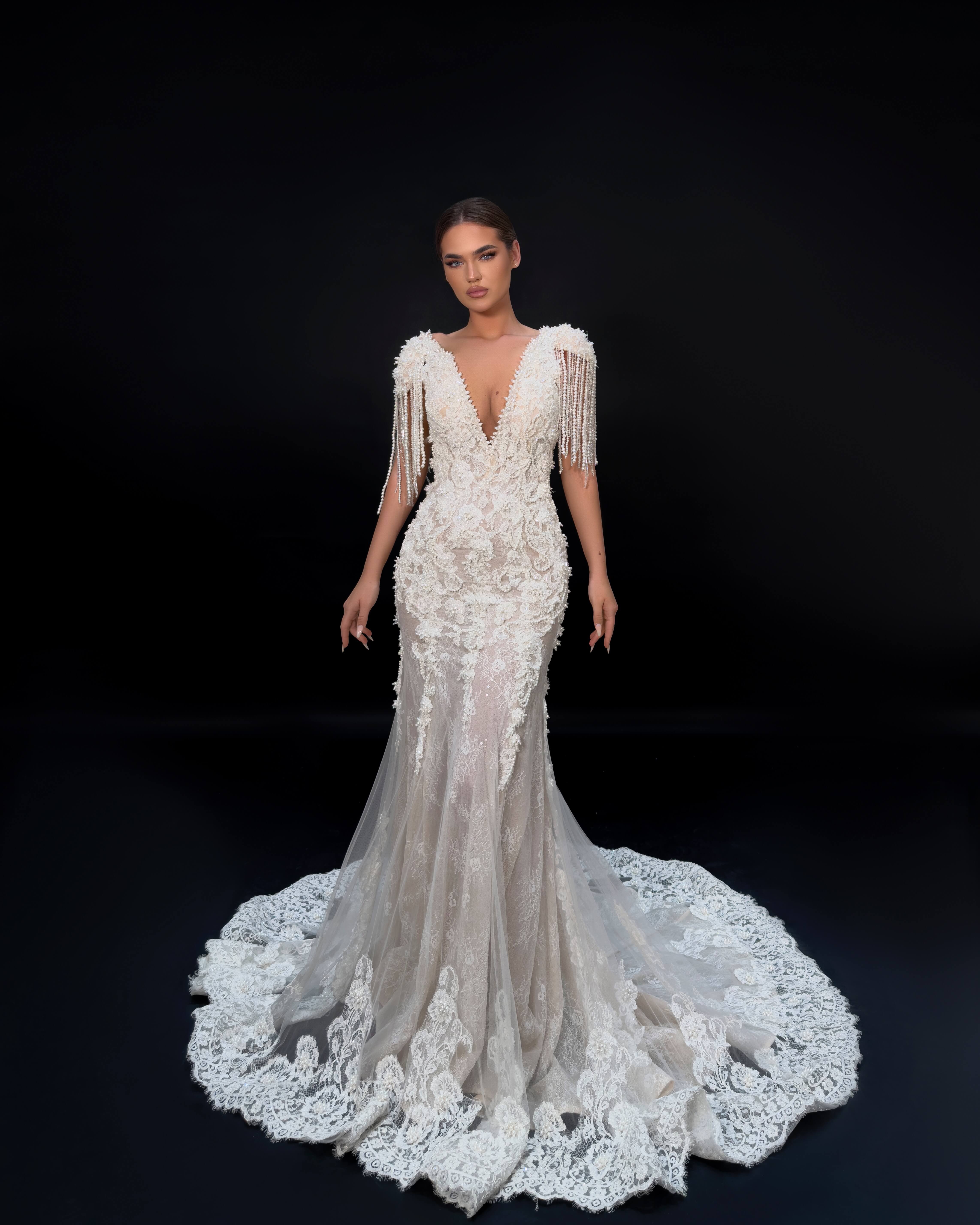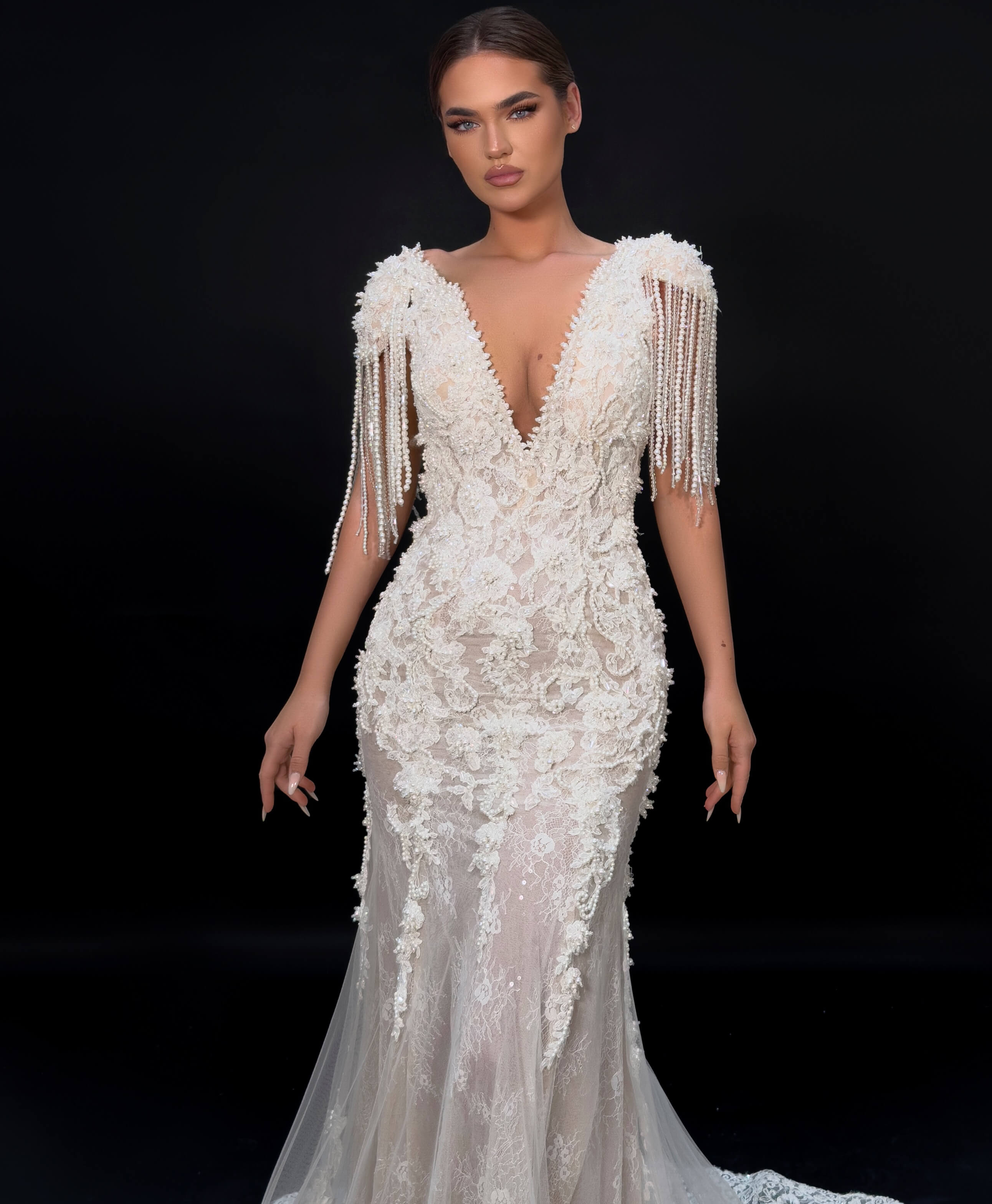 • Elegant mermaid silhouette with fitted bodice and flared hem