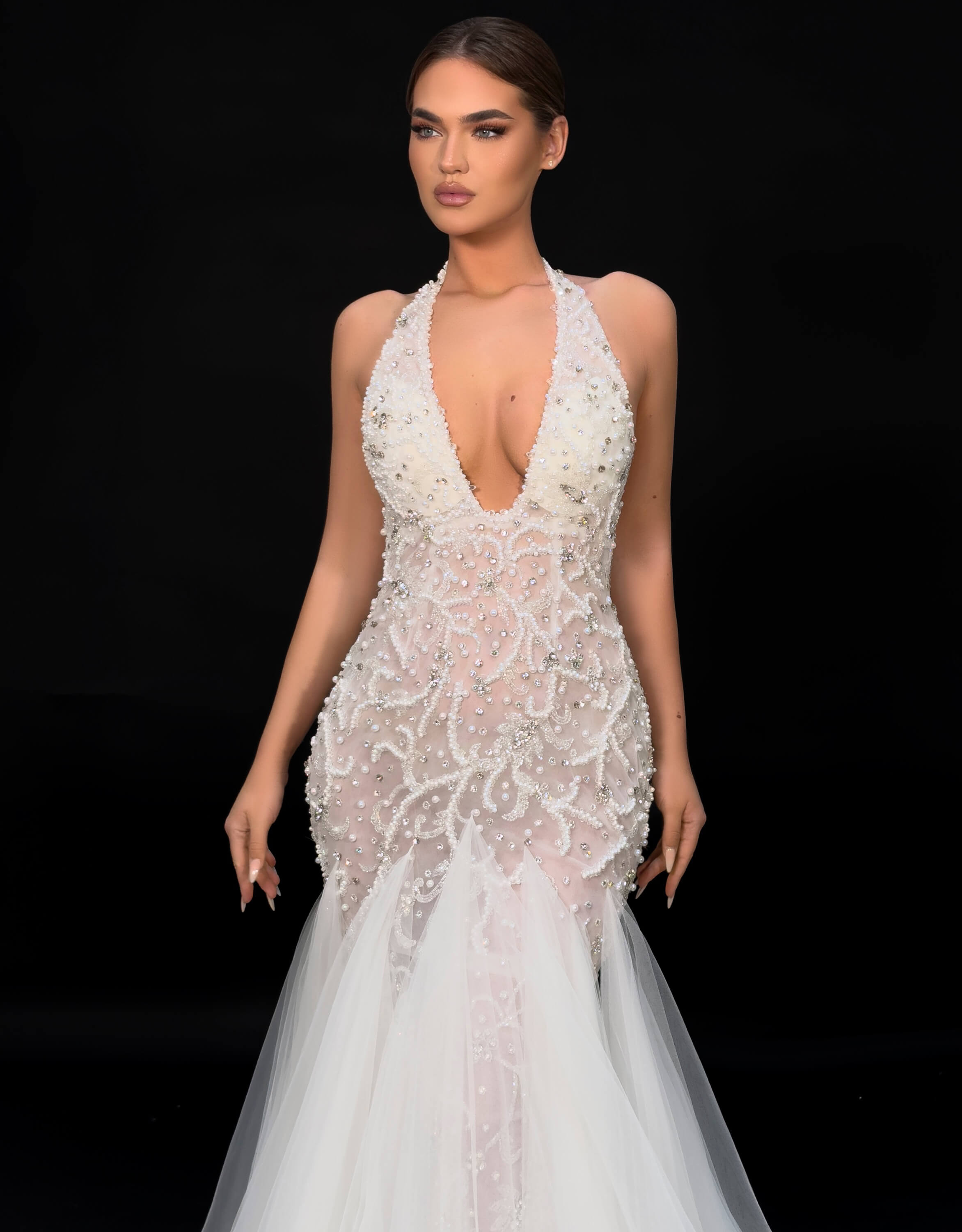• Plunging halter neckline with crystal-beaded bodice