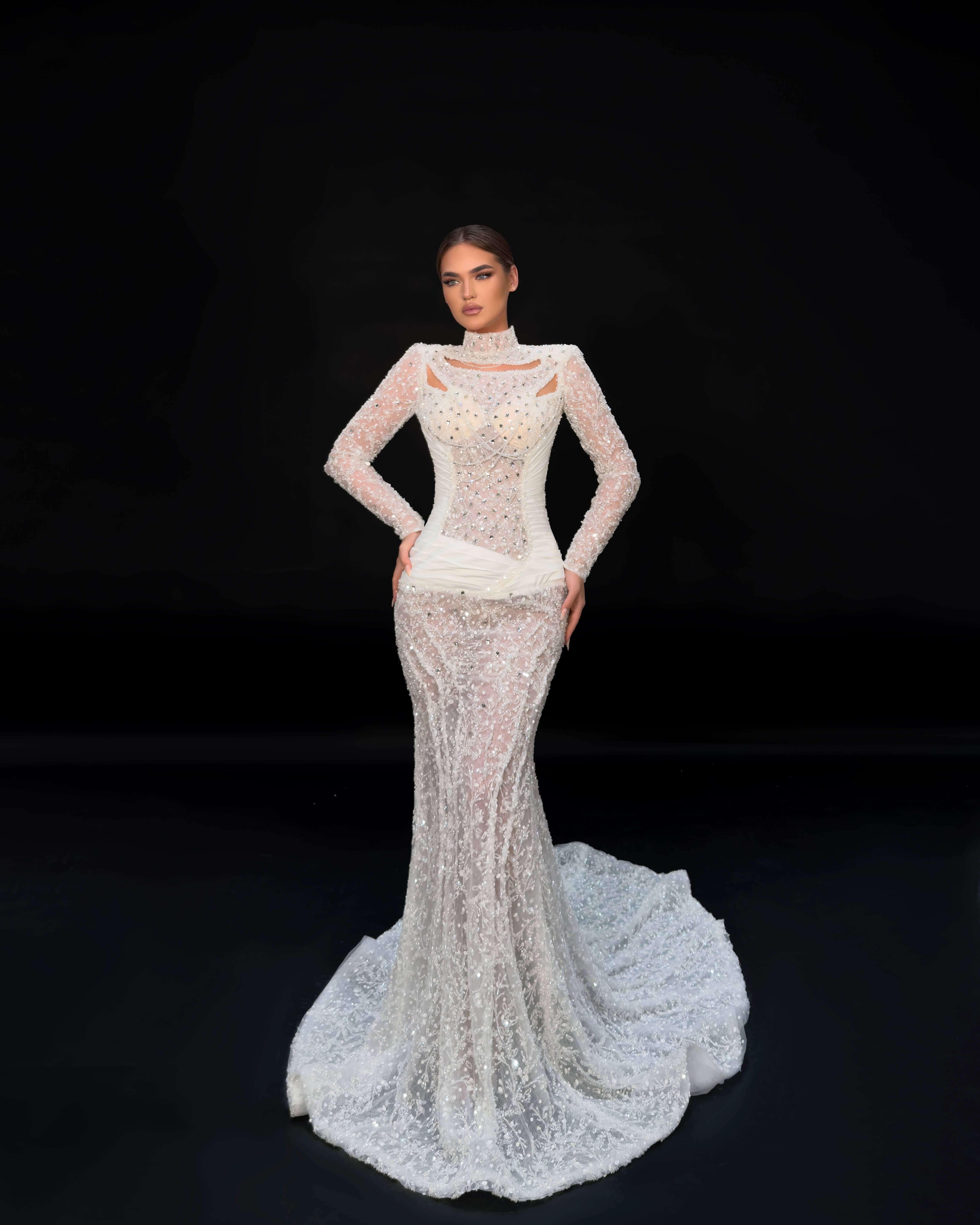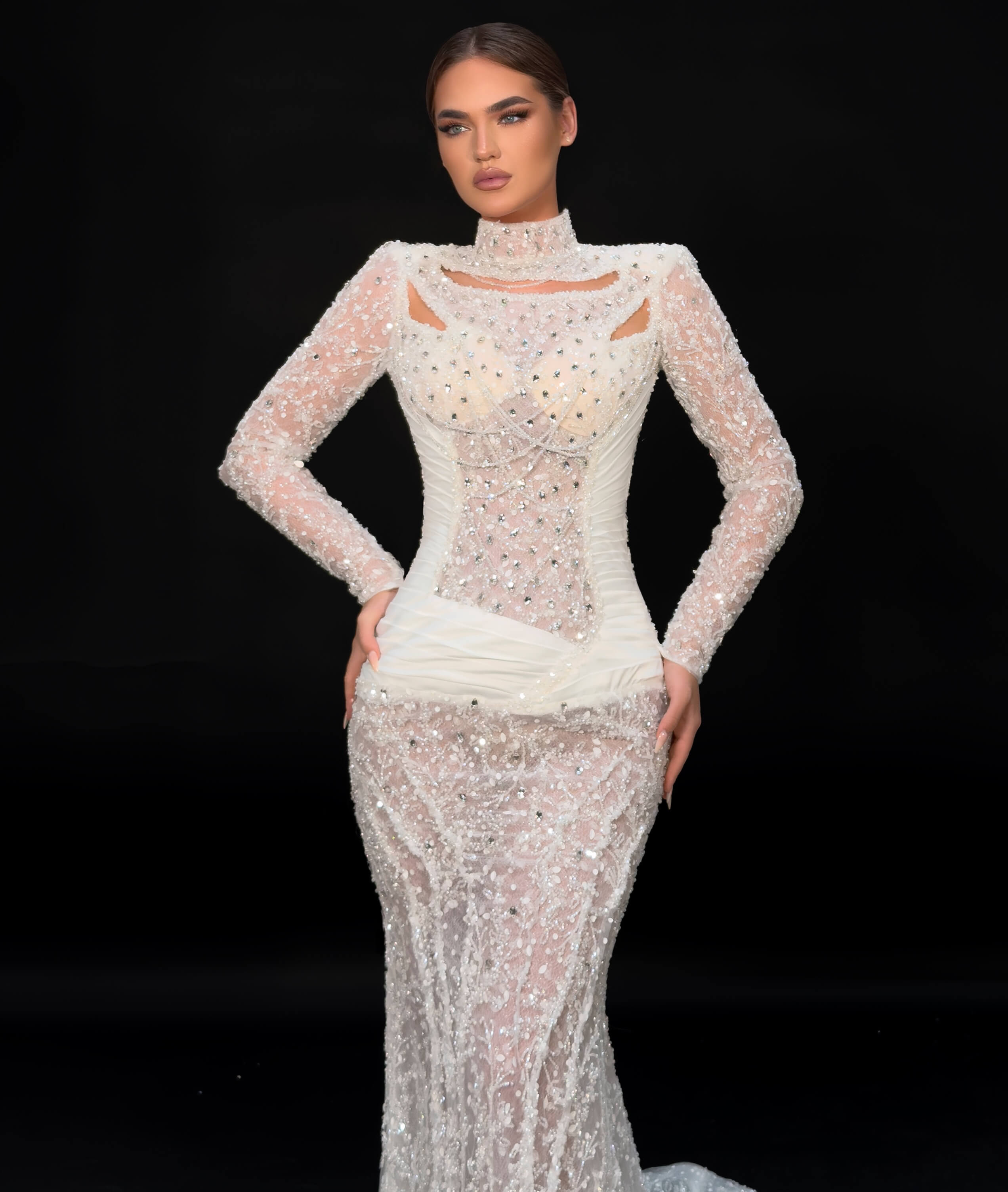 • Sheer illusion long sleeves with crystal embellishment