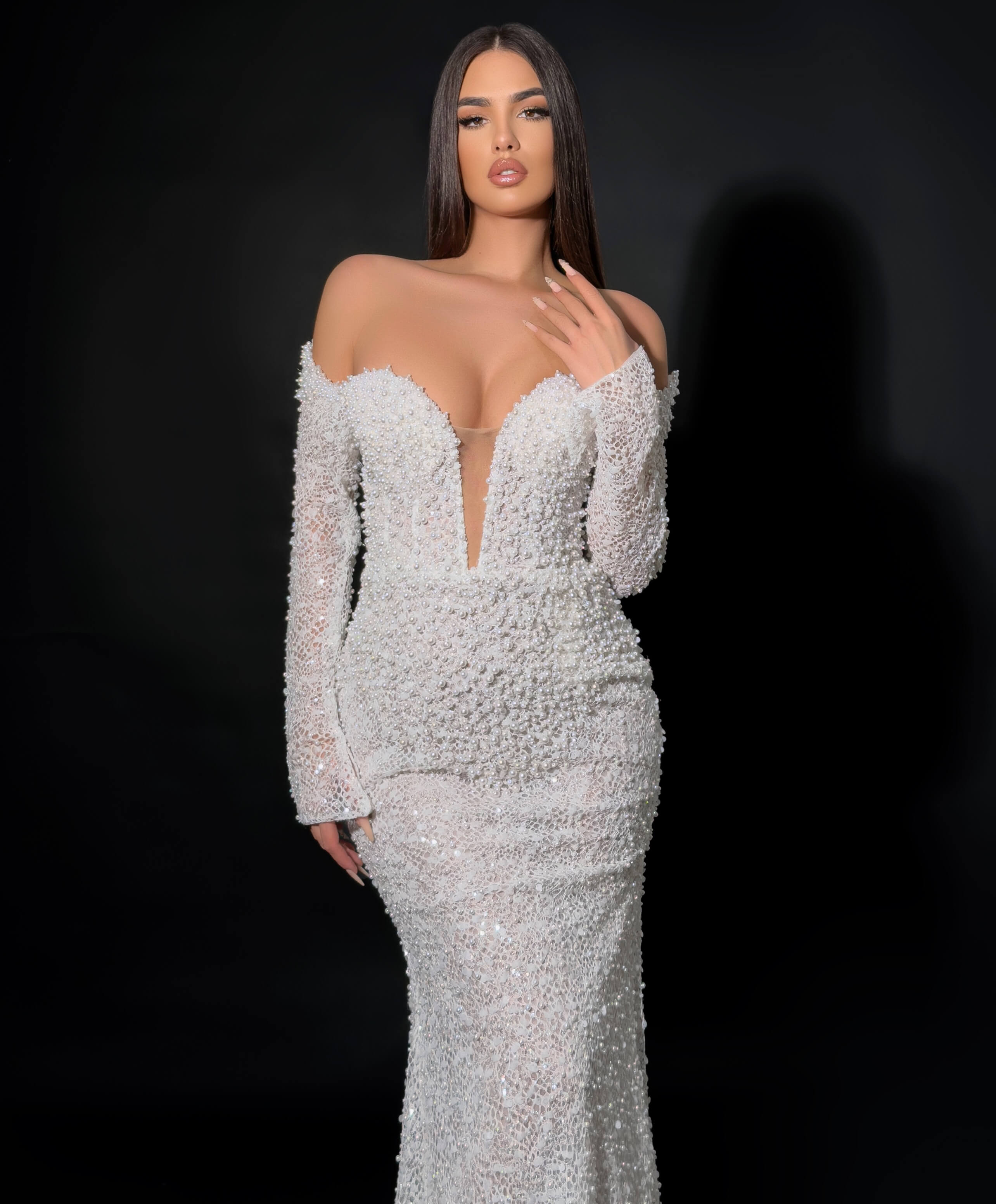 • Long sheer sleeves adorned with dense pearl and crystal embellishments