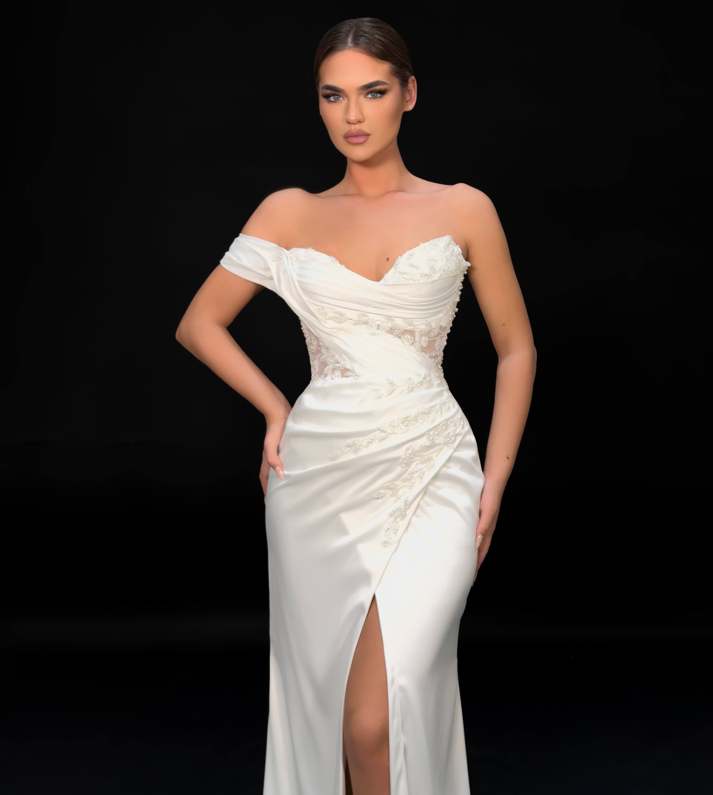 • Off-shoulder sweetheart neckline with draped bodice