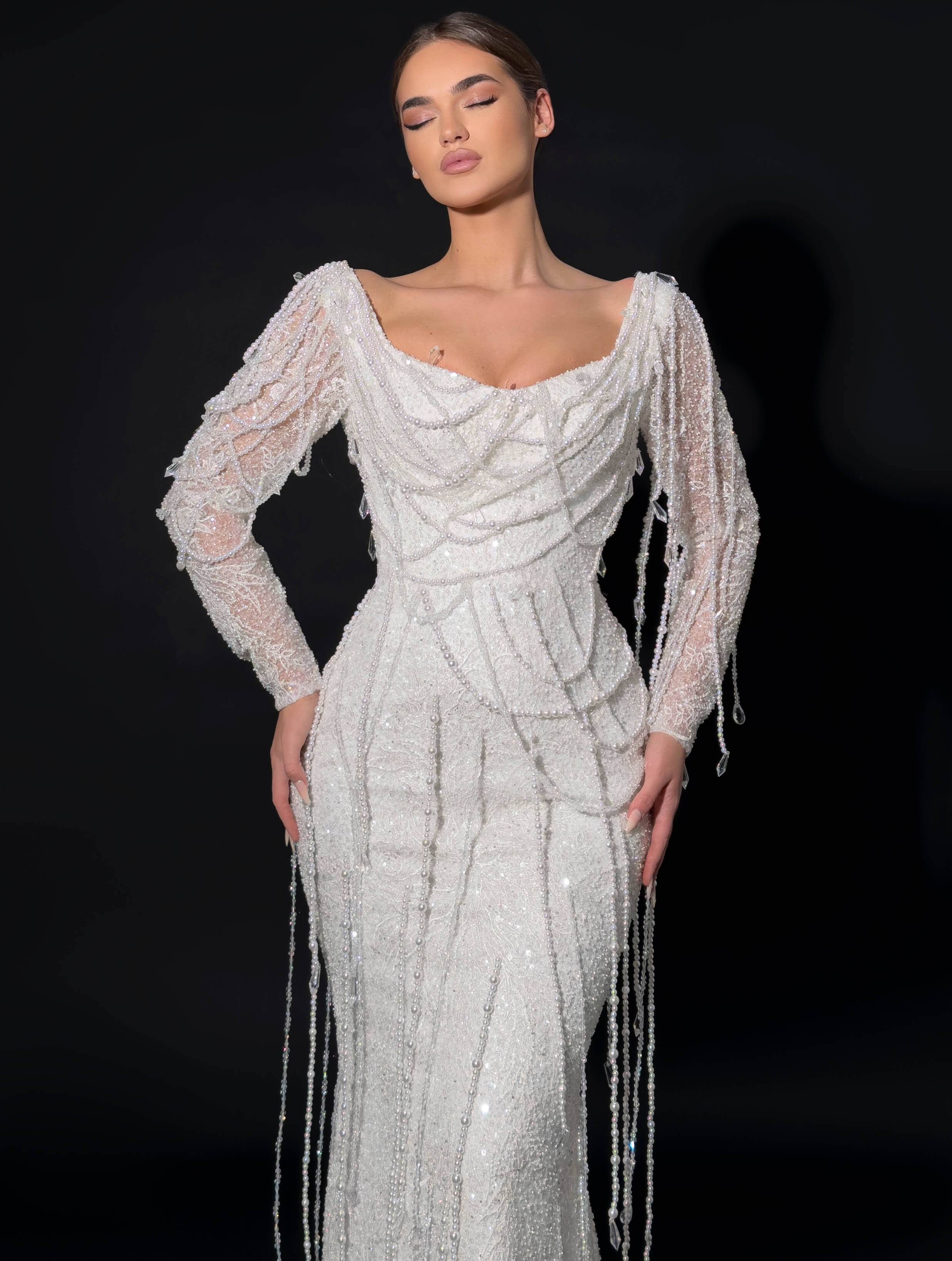 • Dramatic sheer sleeves adorned with cascading crystal fringe
