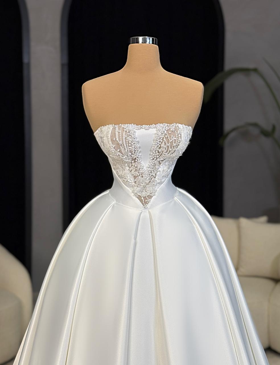 • Strapless sweetheart bodice adorned with intricate crystal and pearl embellishments