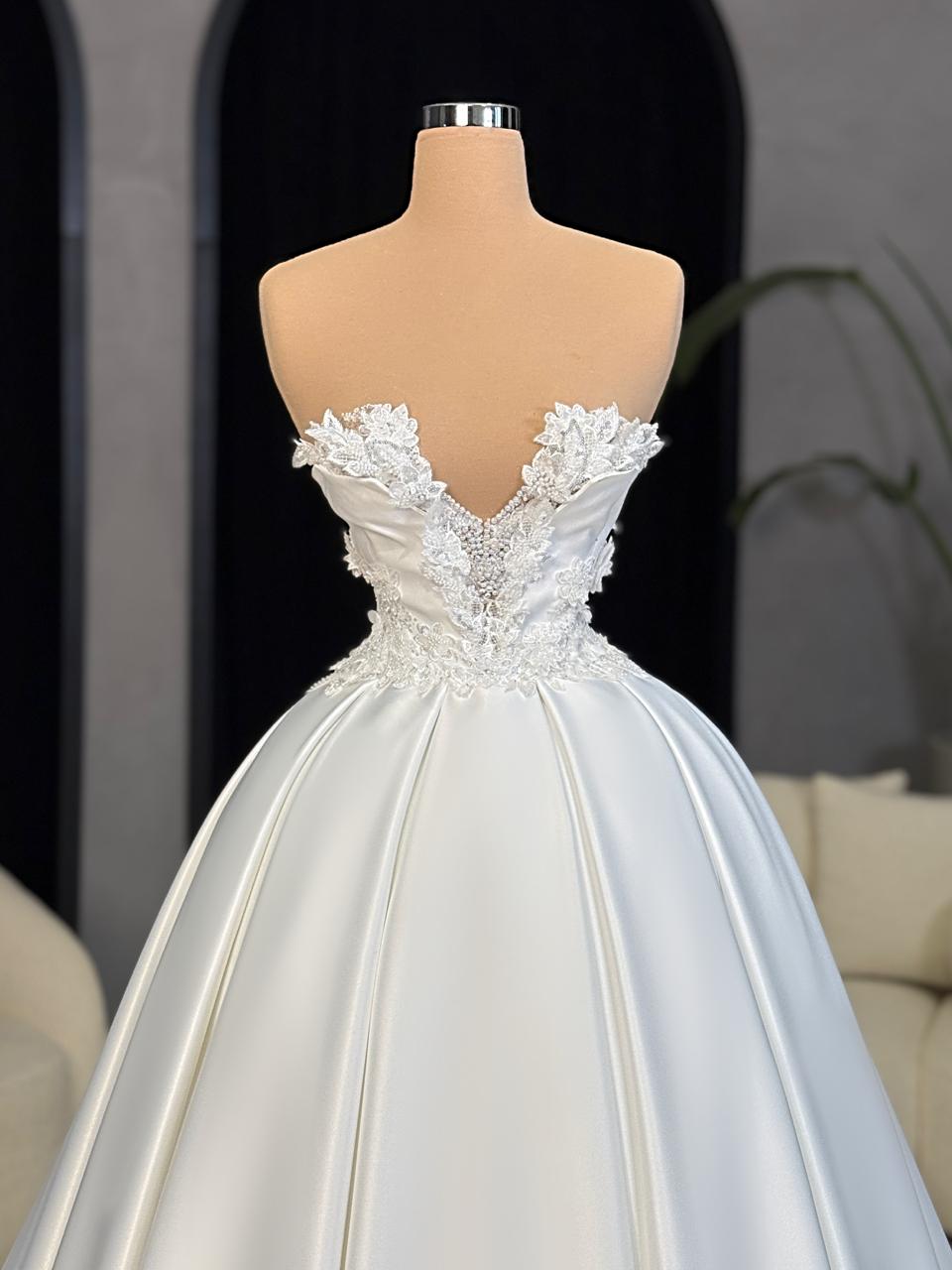 - Intricate 3D floral lace appliqués cascading across the bodice with hand-applied beadwork