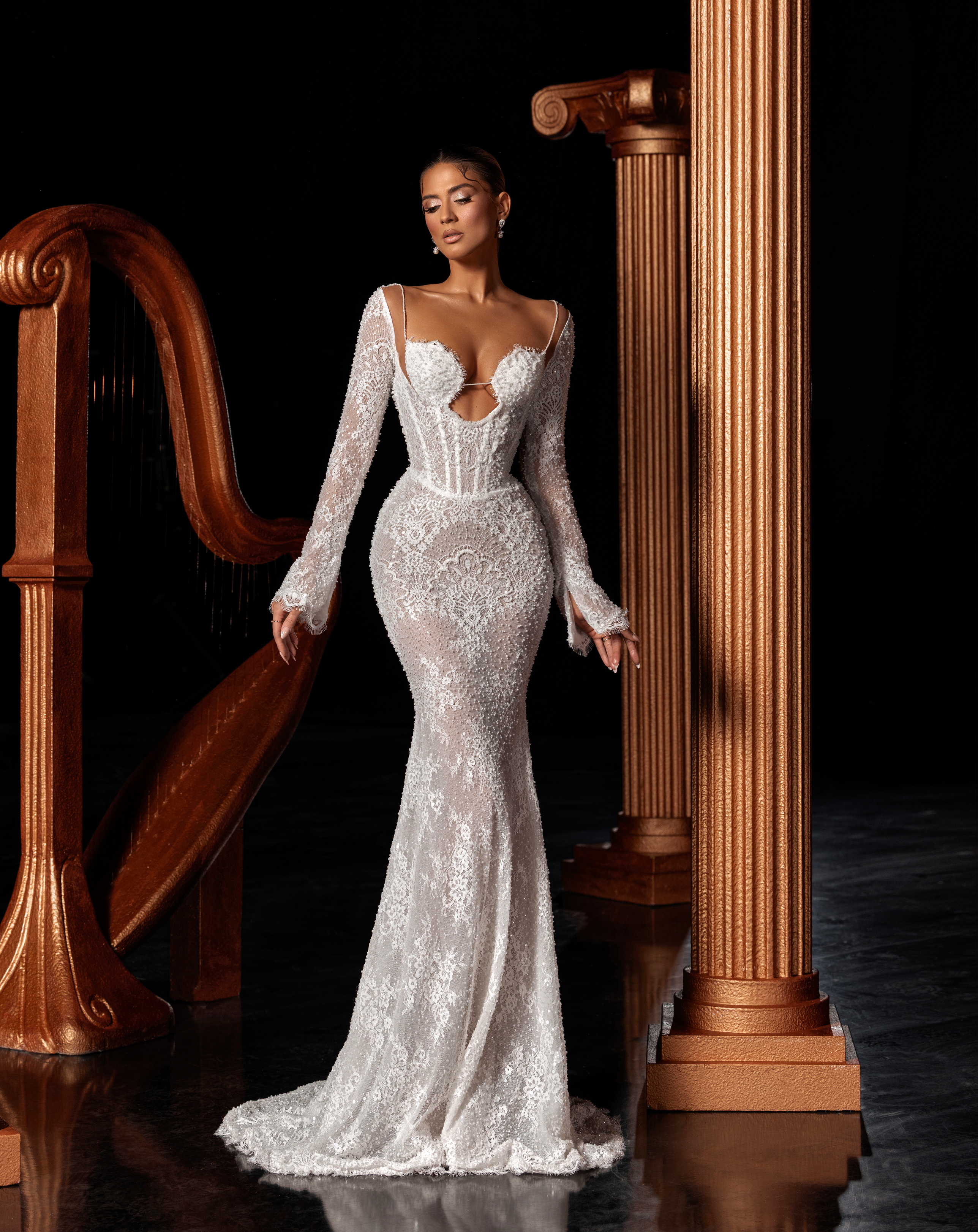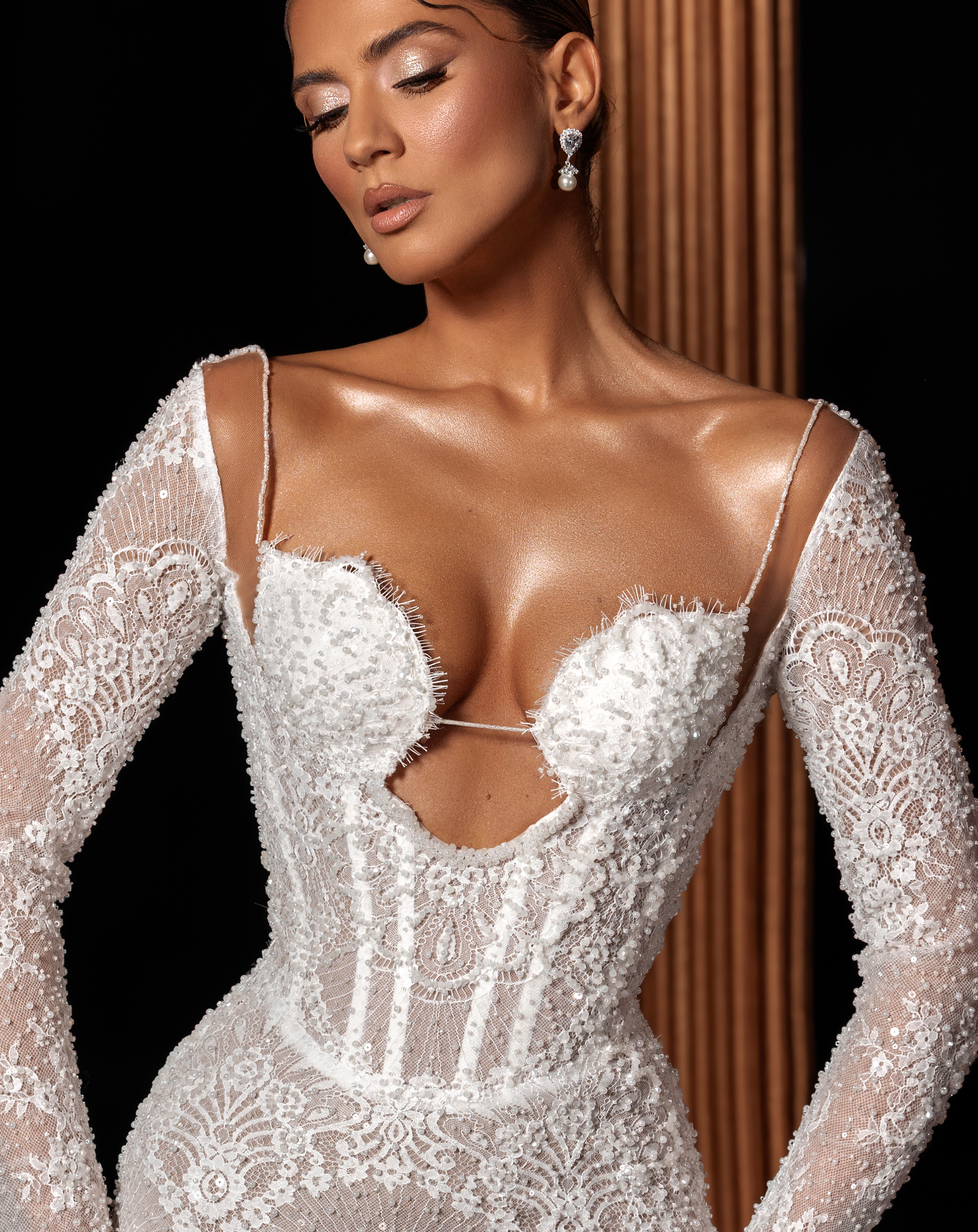 - Fitted lace bodice featuring corset structure and crystal embroidery