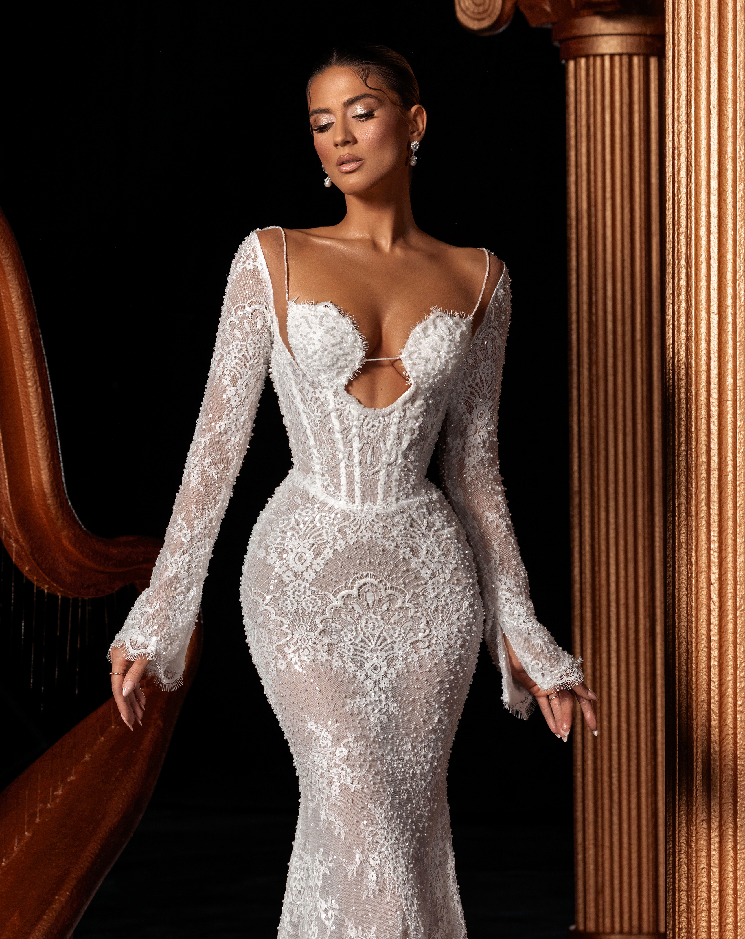 - Sweetheart neckline with sheer long sleeves and delicate strap accents