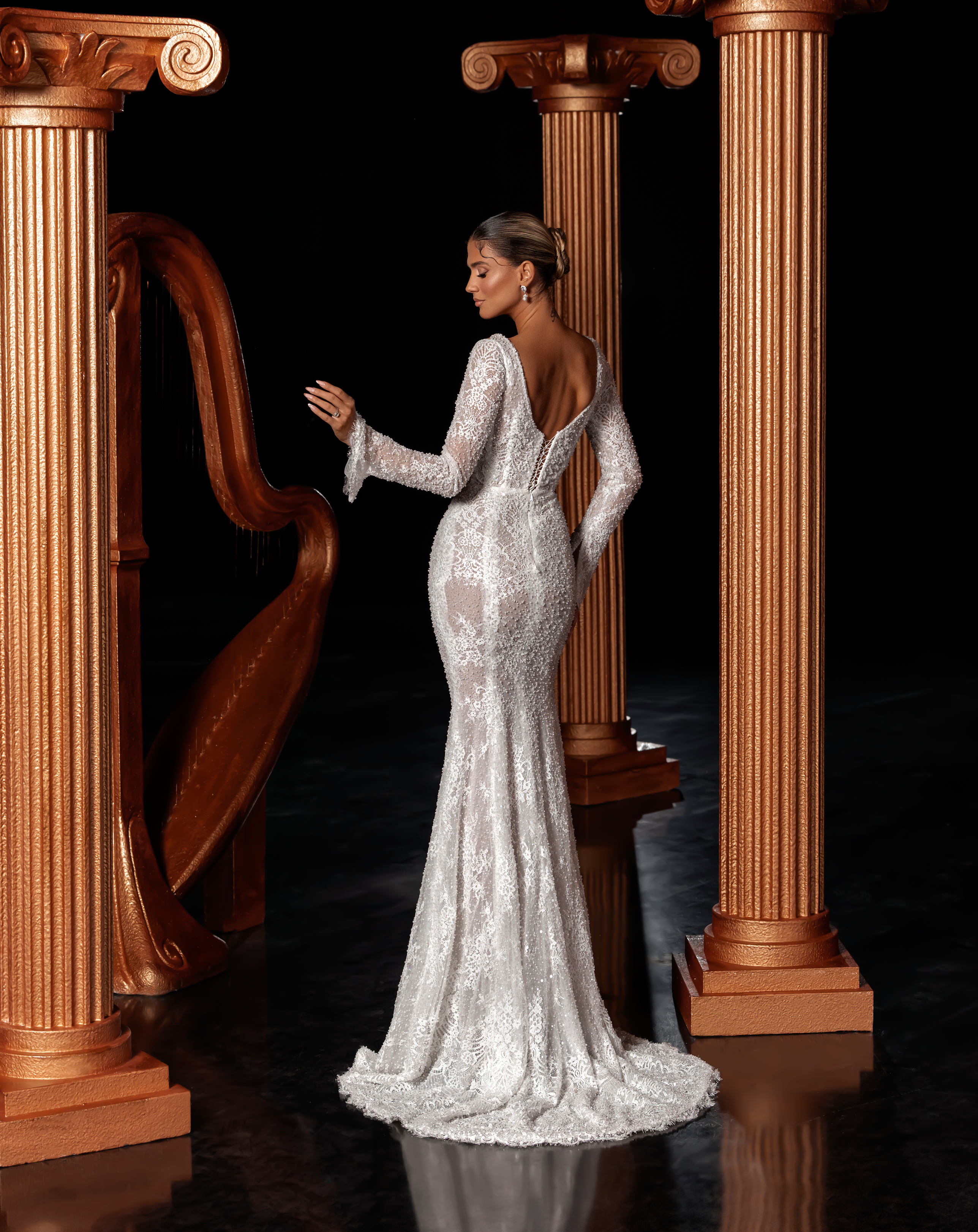 - Floor-length silhouette in embroidered lace with a soft trailing hem