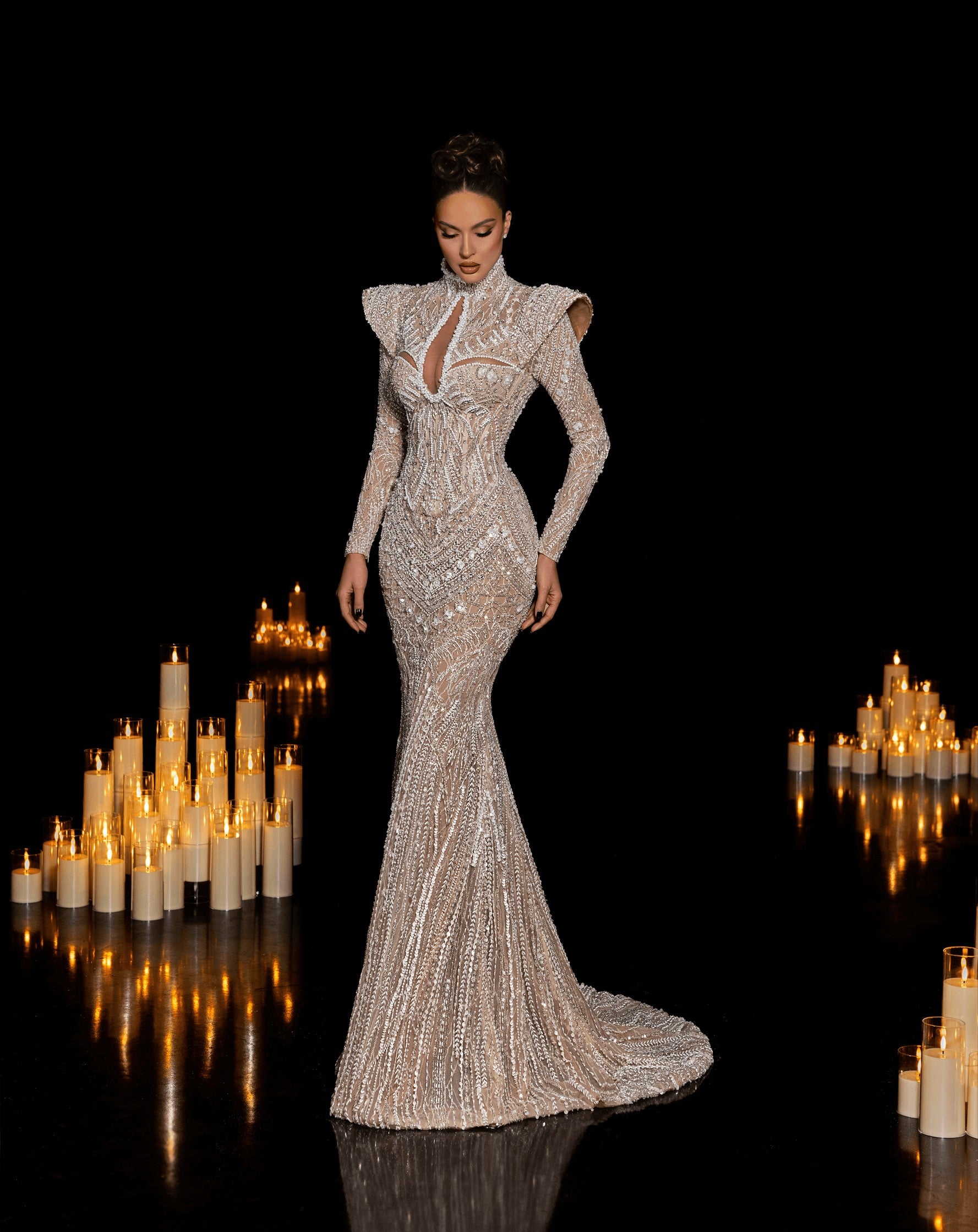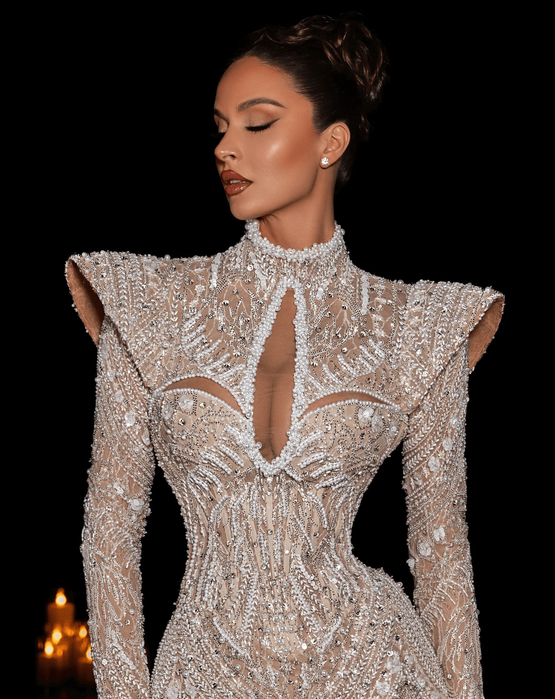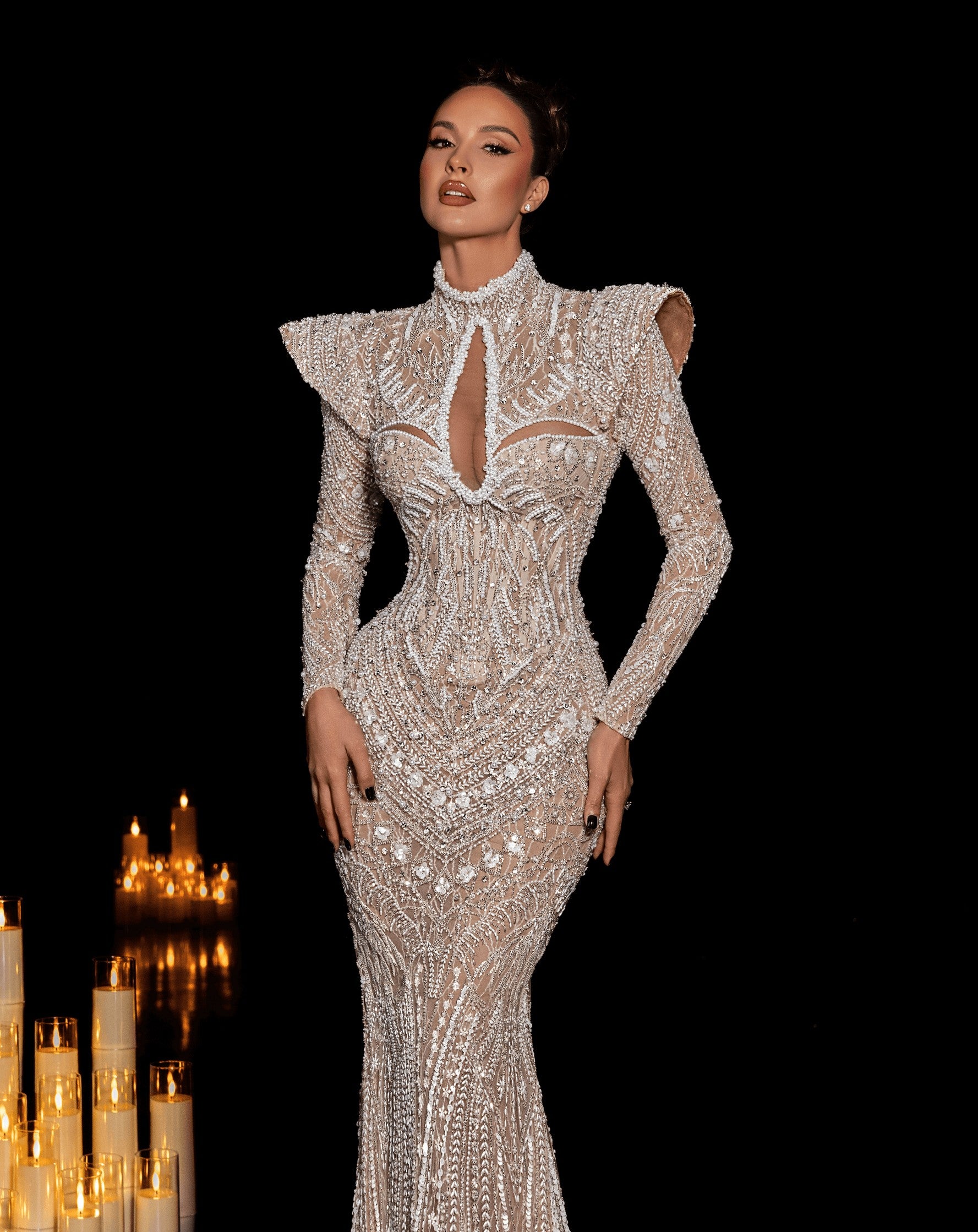 - Dramatic high neck with illusion keyhole cutout, structured shoulders, and long sleeves for regal sophistication